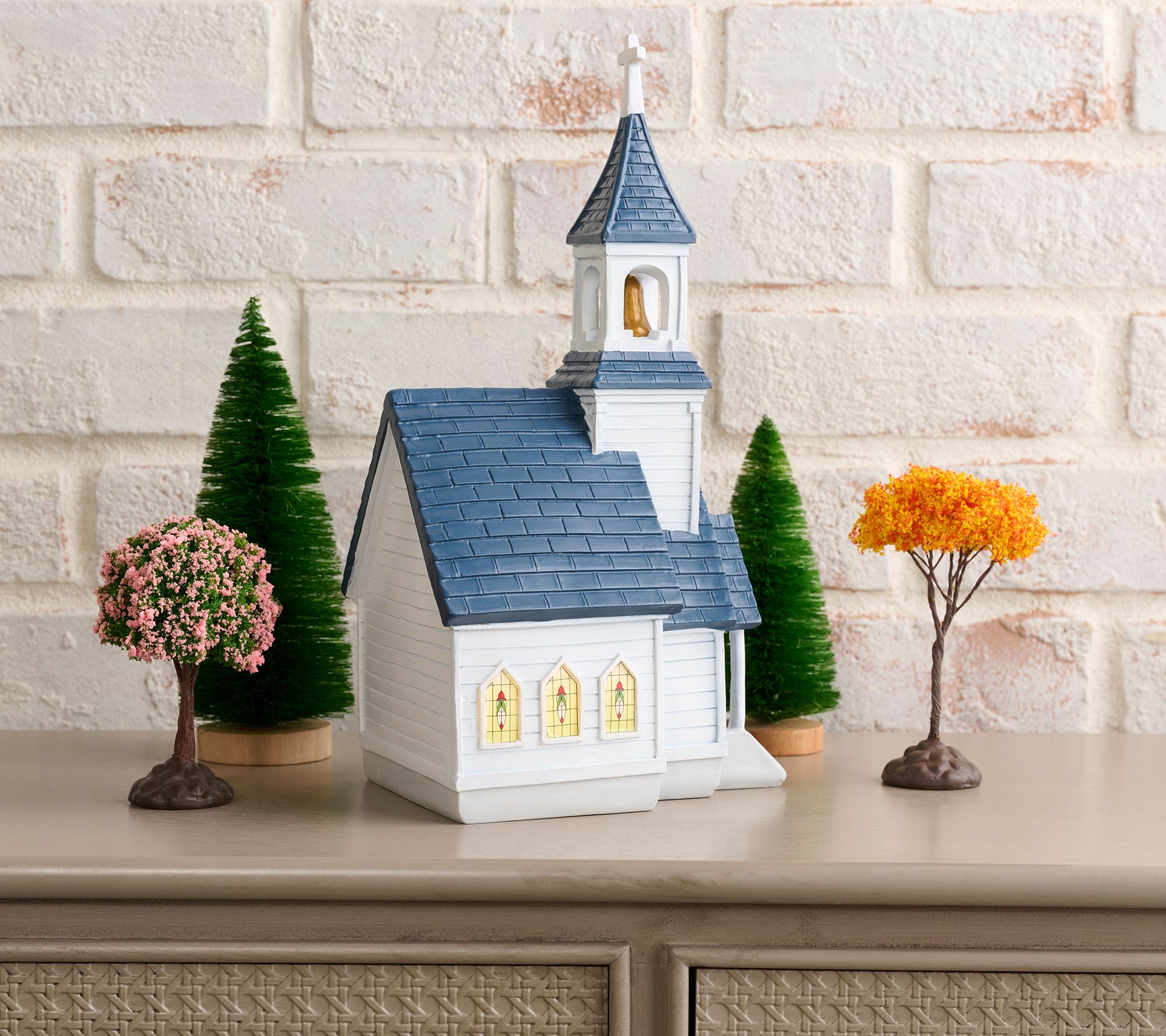 Includes illuminated church, two bottlebrush trees, one pink cherry blossom tree, and one autumnal tree