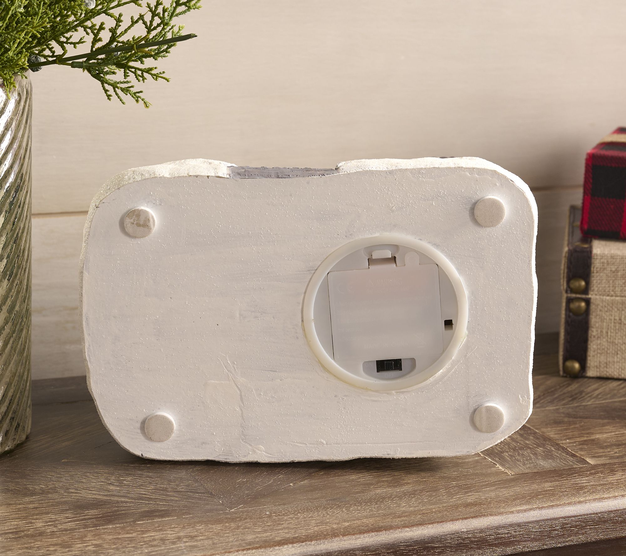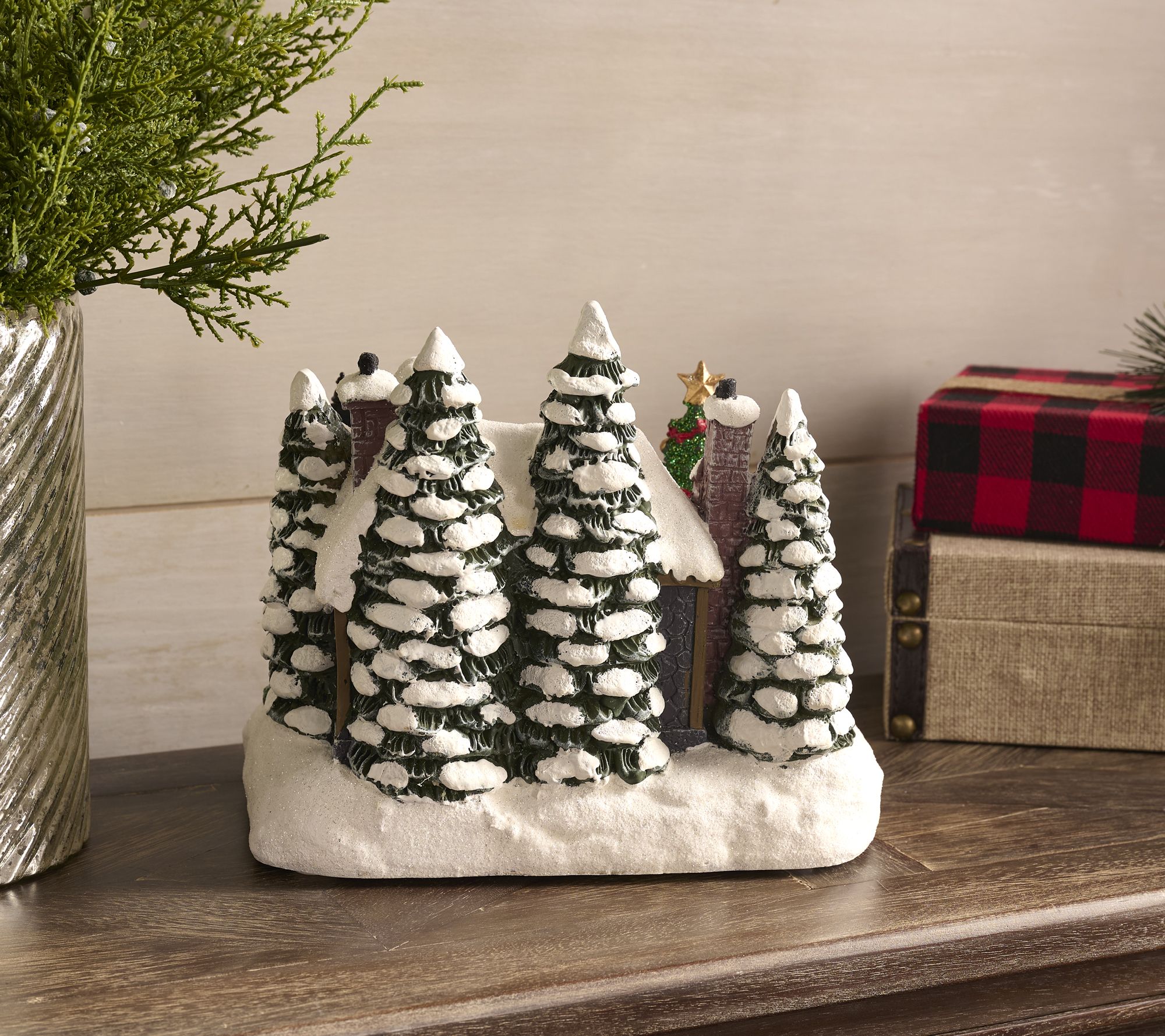 Resin construction with stone accents and glittered snowy details