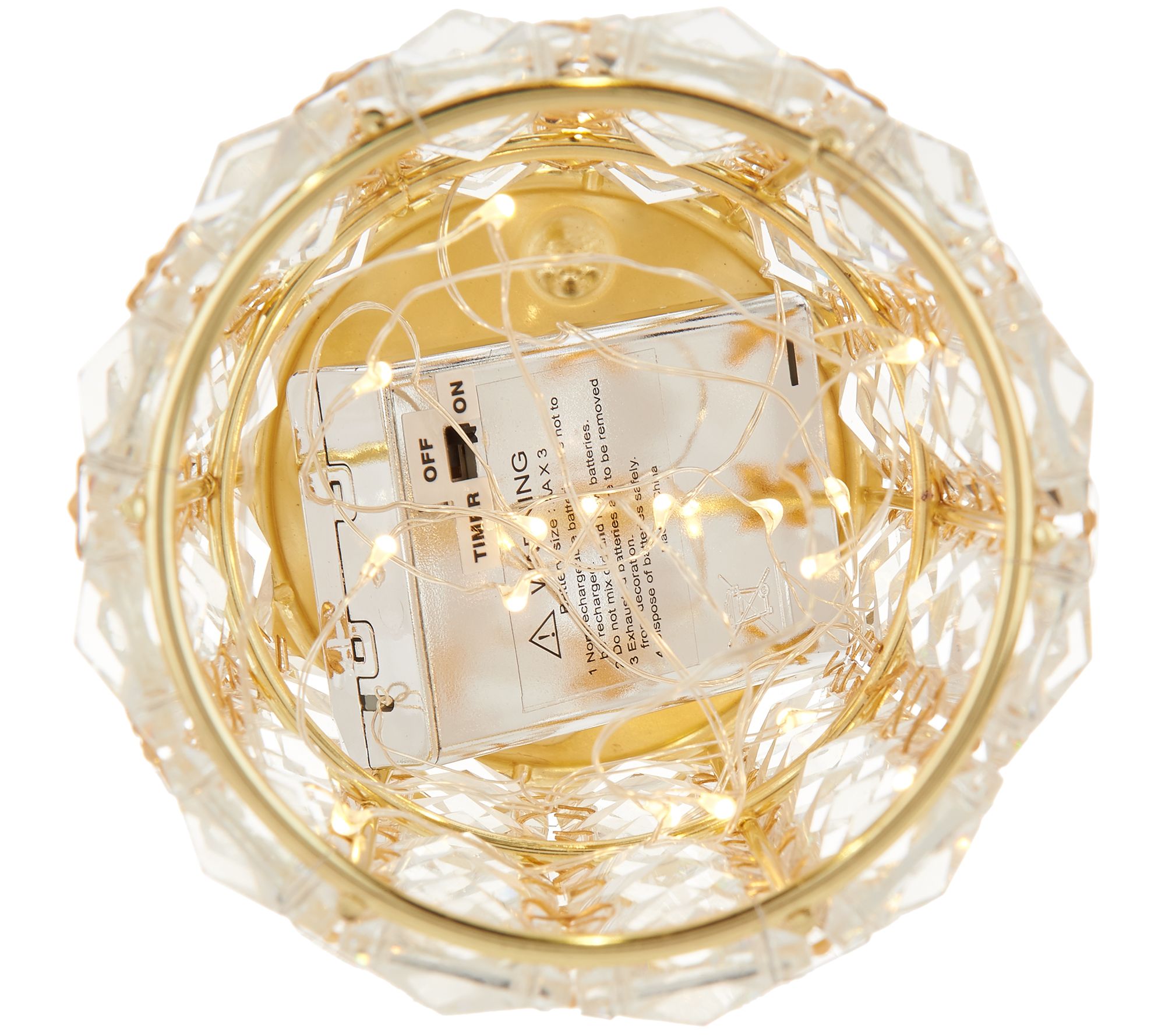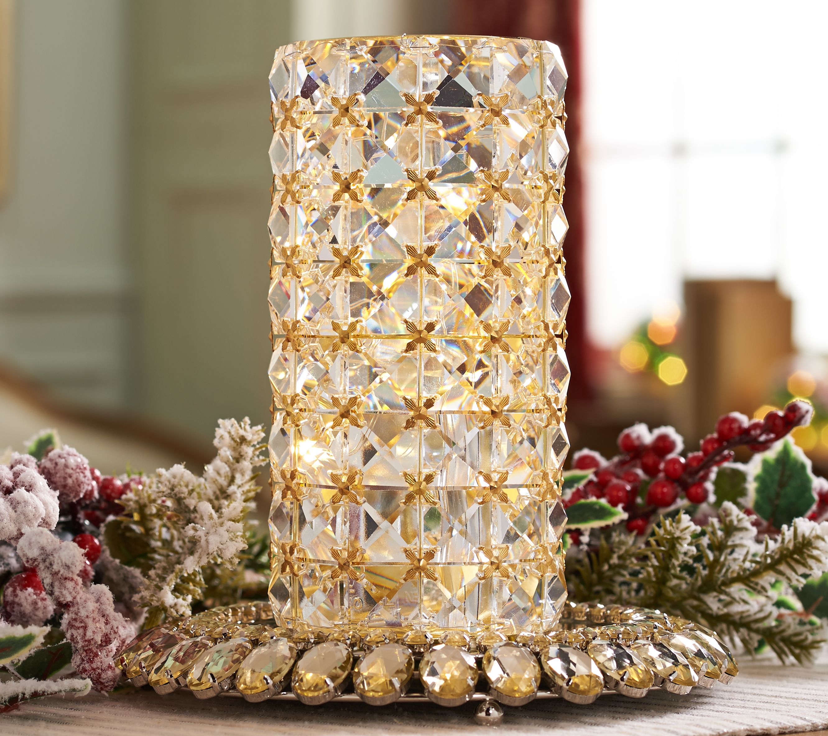Long nights call for soft light, like this illuminated faceted gem glass hurricane. Set on a timer for your convenience, its microlight strand glows from inside. From the Valerie Parr Hill Collection.