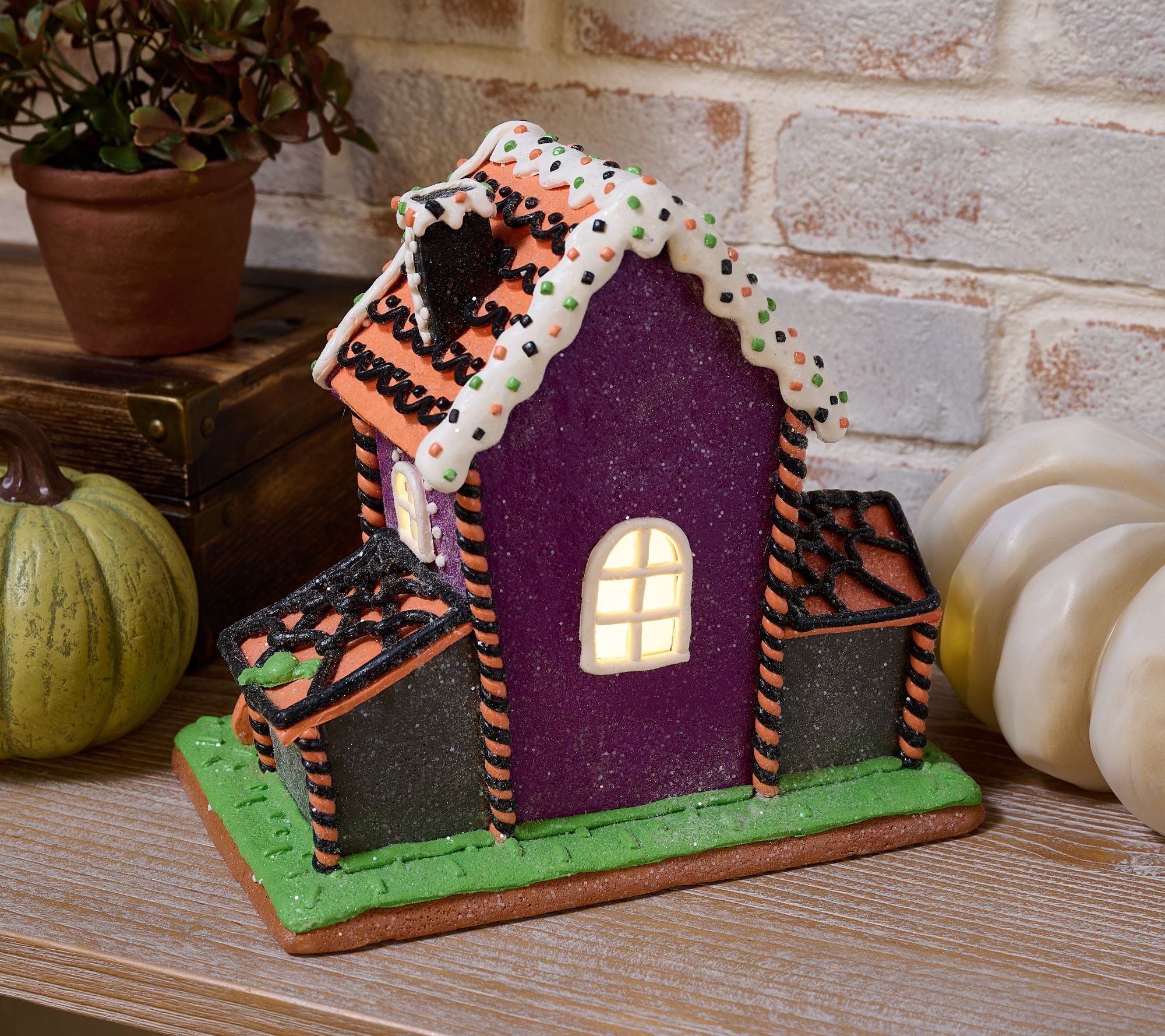 Transform your mantel or accent table into a festive Halloween scene with this illuminated claydough house, sparkling with glitter and detailed candy accents. Three cheerful ghosts, pumpkins, a black cat, and spiders add playful charm, while a built-in timer and battery-powered lights create an inviting glow that welcomes guests after dark. From the Valerie Parr Hill Collection.