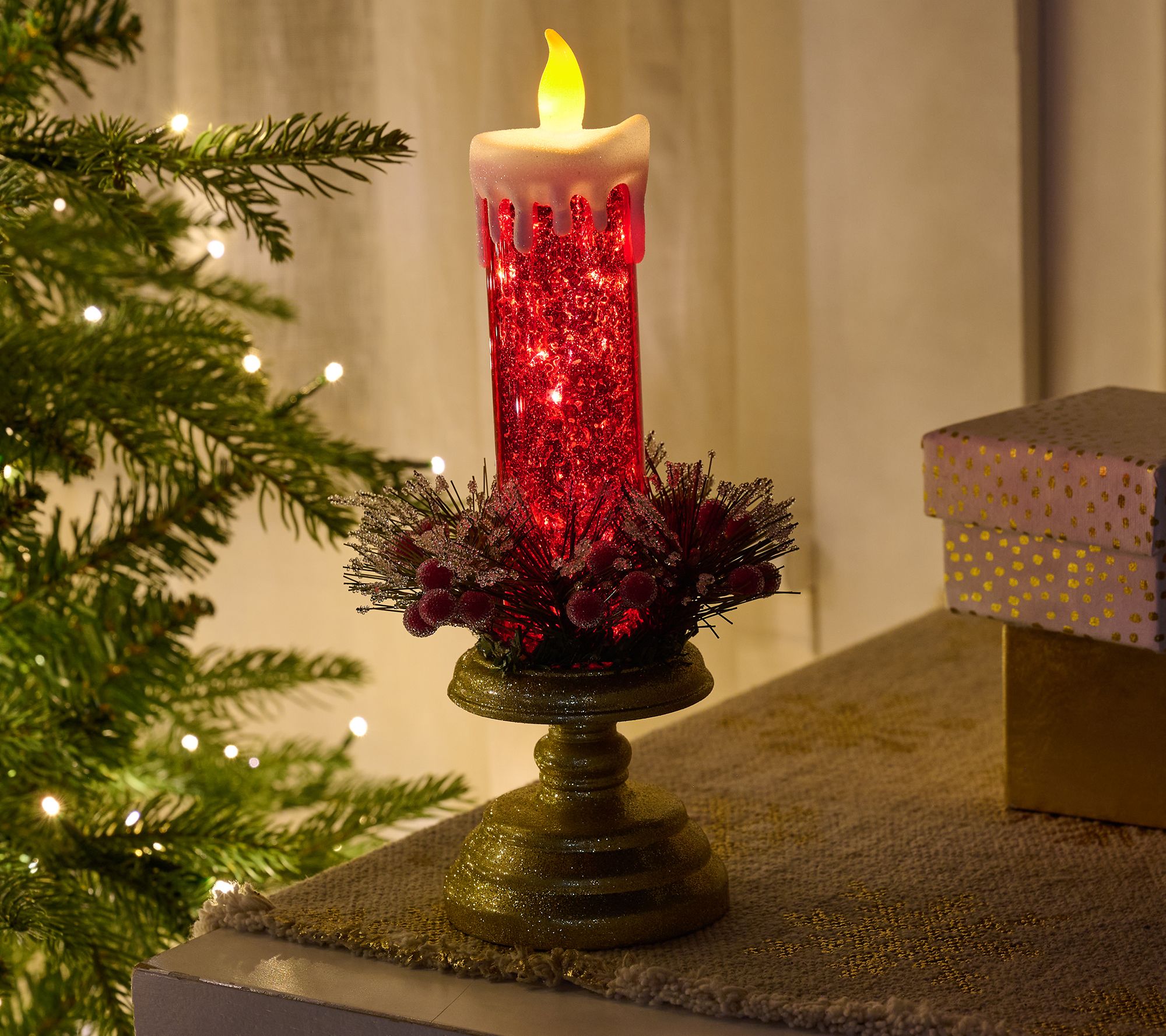 Atop a glittery pedestal, this mercury glass taper livens up any holiday home, glowing from its flameless tip and from within. The soft candlelight creates a serene moment, while mercury glass shimmer brings the spirit of the season to your mantel or entry table. The faux pine berry ring adds festive detail, and with steady or twinkle modes, you can easily set just the right mood for any gathering. From the Valerie Parr Hill Collection.