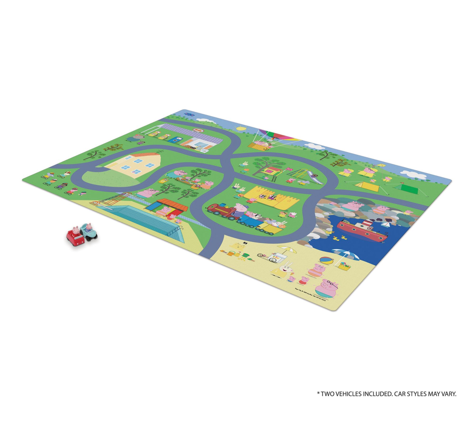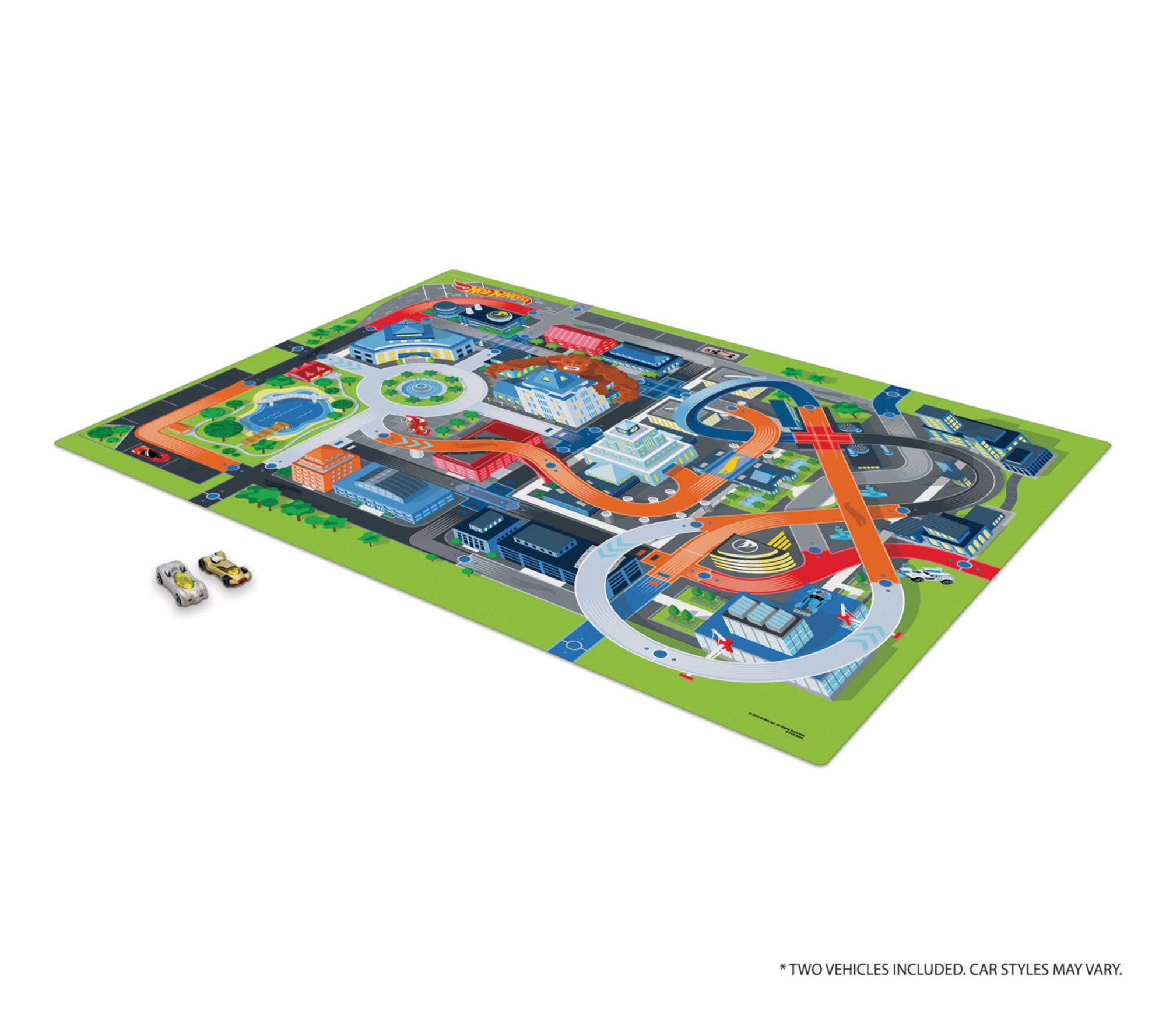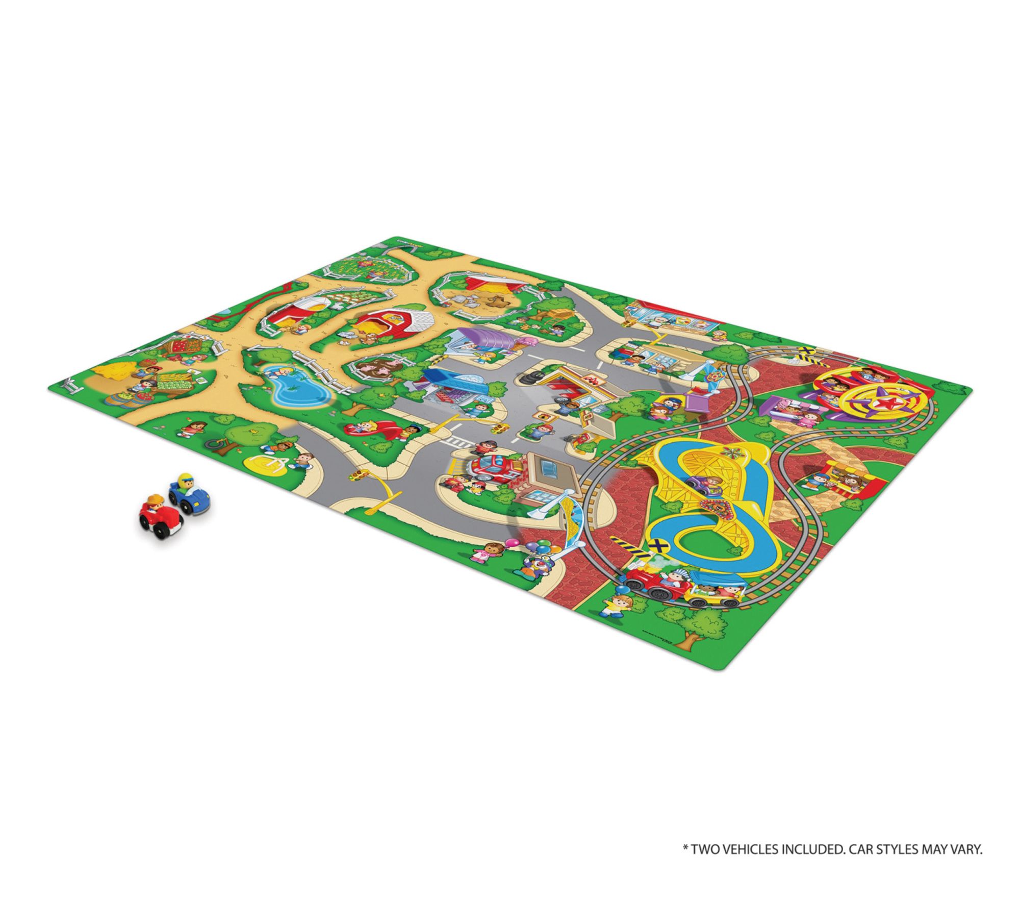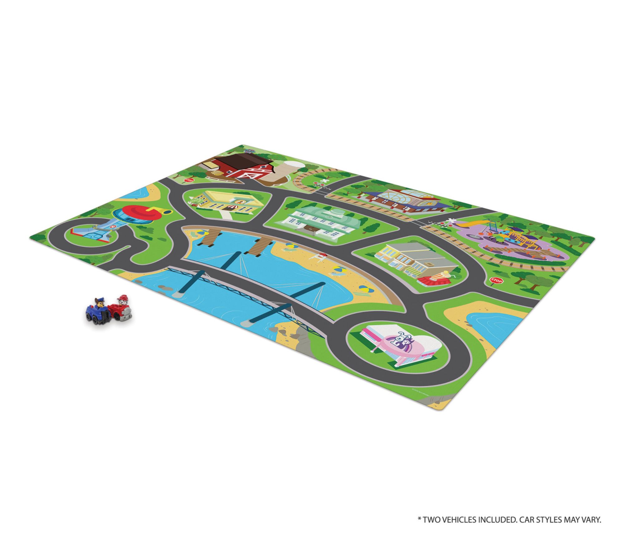 • Includes full color EVA foam mat, two character vehicles (assorted styles)