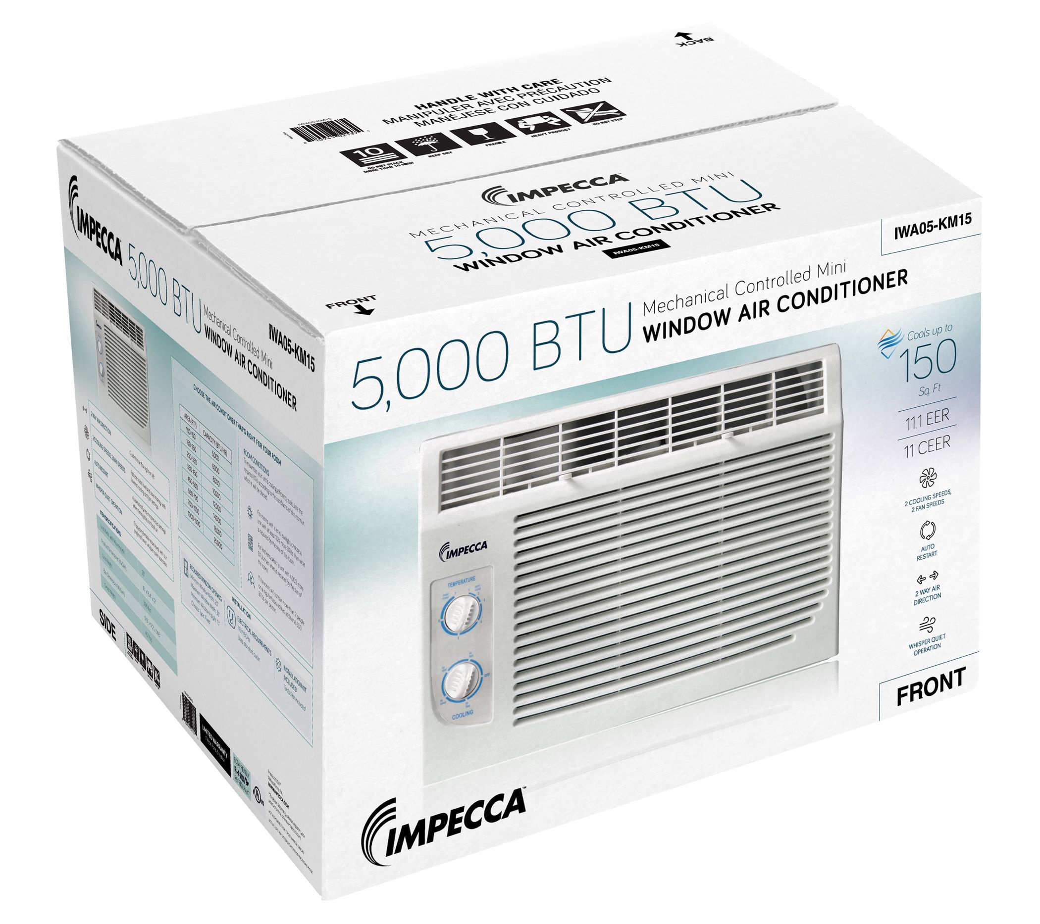 Stay cool and comfortable with the Impecca 5,000 BTU window air conditioner. This compact unit features two cooling speeds, two fan-only speeds, and two-way air direction to customize your comfort. Perfect for cooling rooms up to 150 square feet, it includes a handy 24-hour timer. From Impecca.