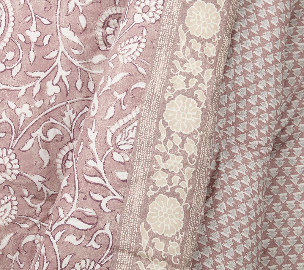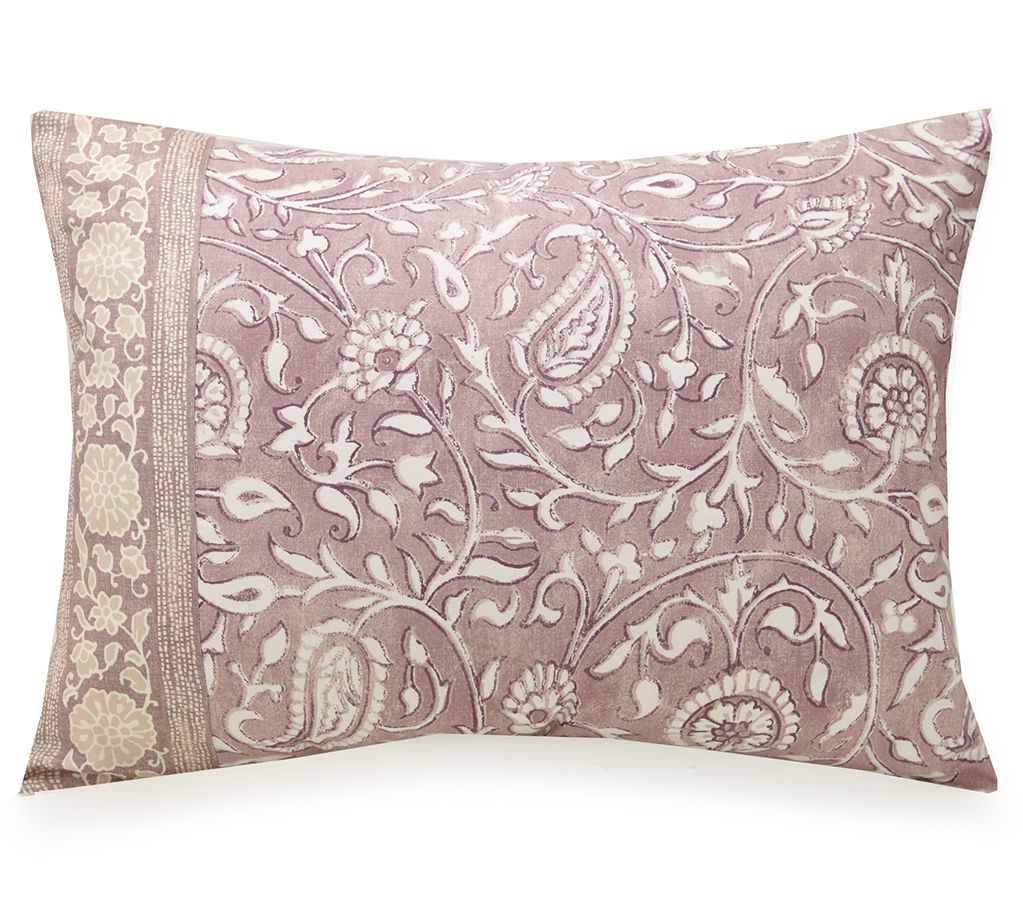 This set touts a gorgeous, washy-texture paisley print in dusty soft purple, with a floral border around three sides to complete the look. From Indigo Bazaar.