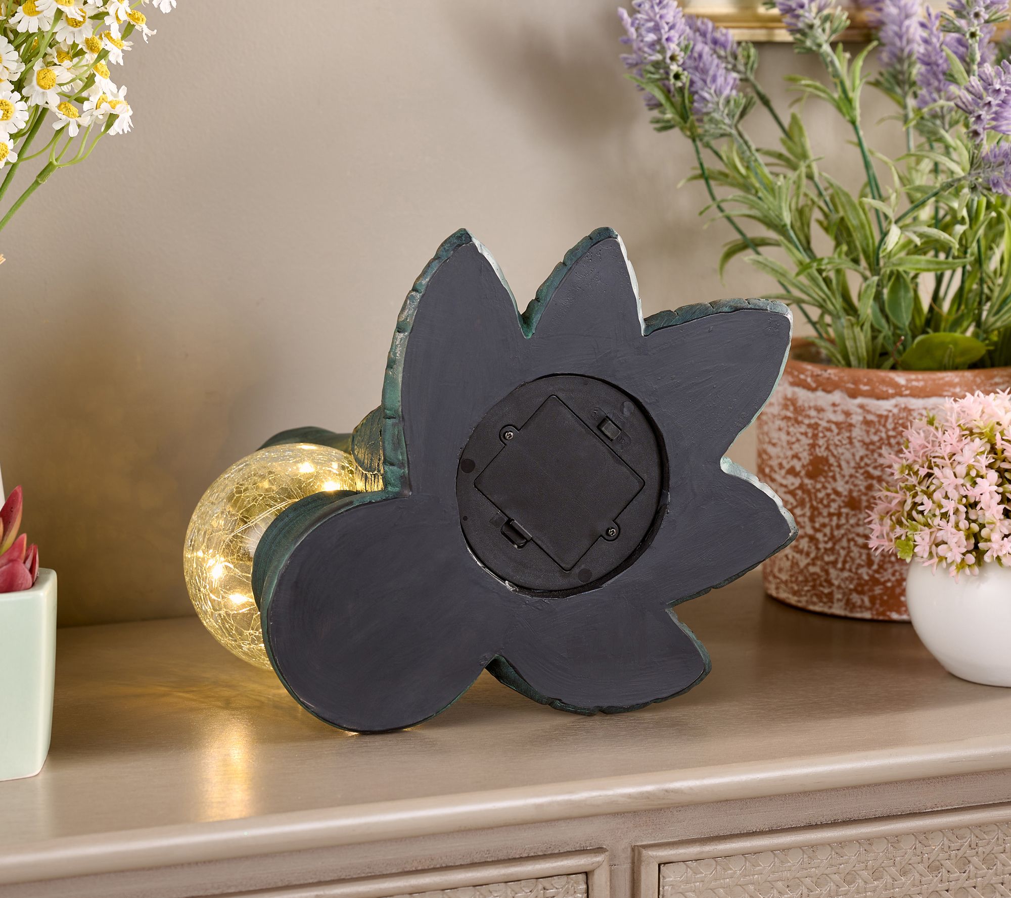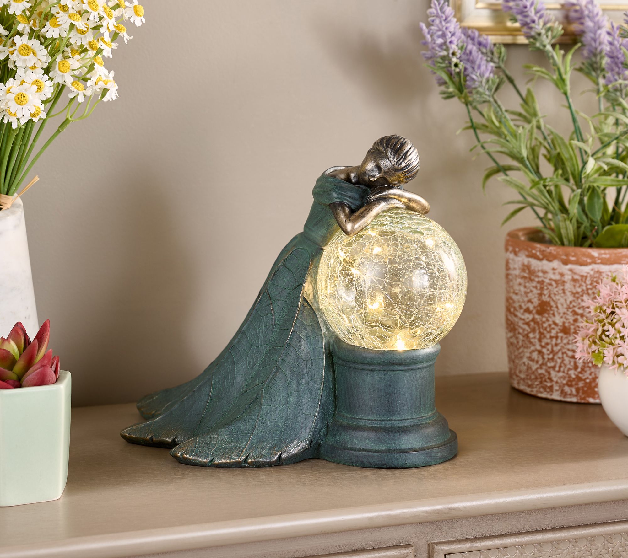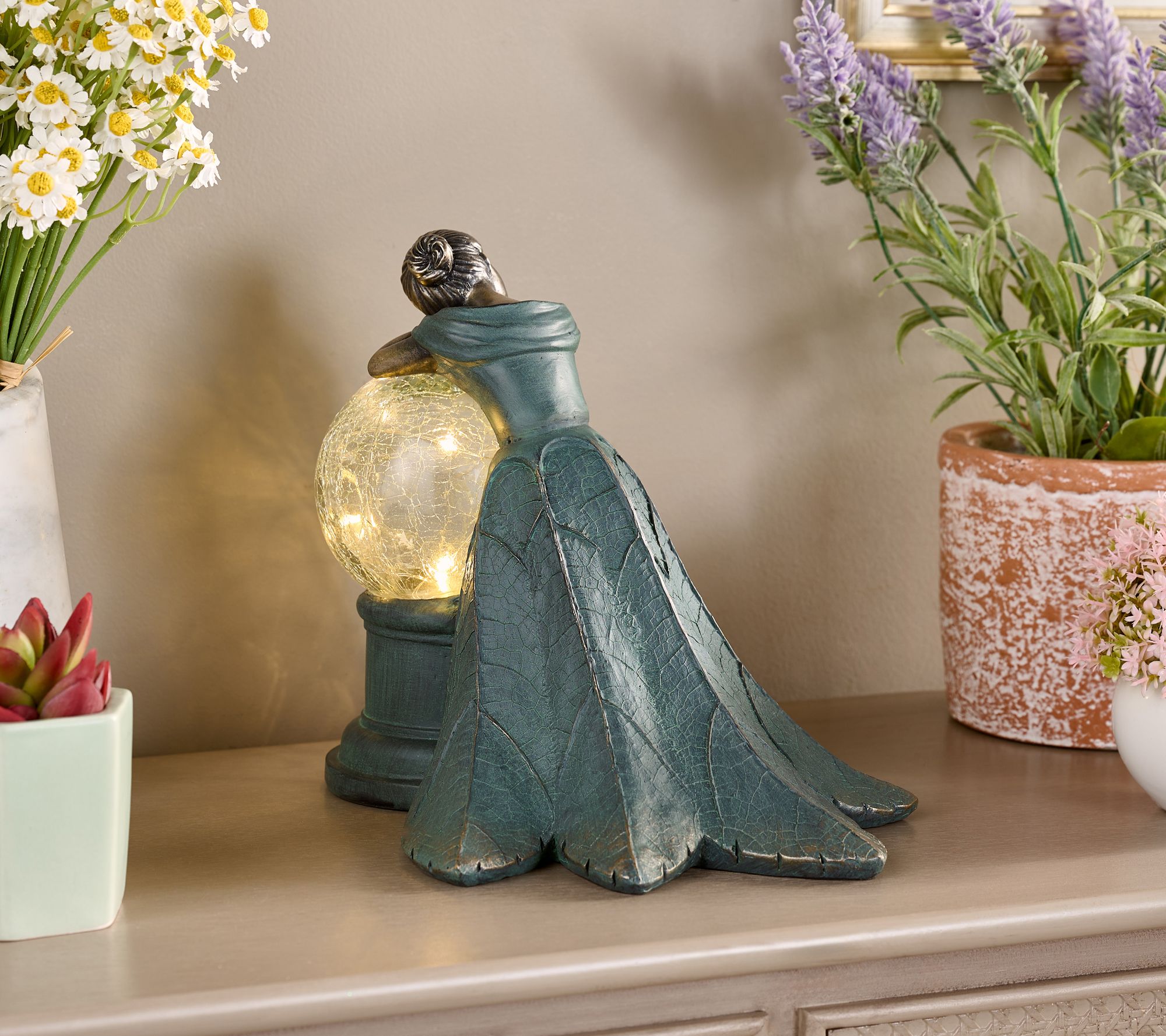 Light up your garden or home with this lovely lady leaning upon an illuminating orb. Although the pretty maiden resembles a bronze figurine, she's made of all-weather resin, so her graceful appearance is able to handle the elements, indoors or out. Her crackle glass sphere gives off a gorgeous glow, creating a captivating scene of serenity. From the Valerie Parr Hill Collection.
