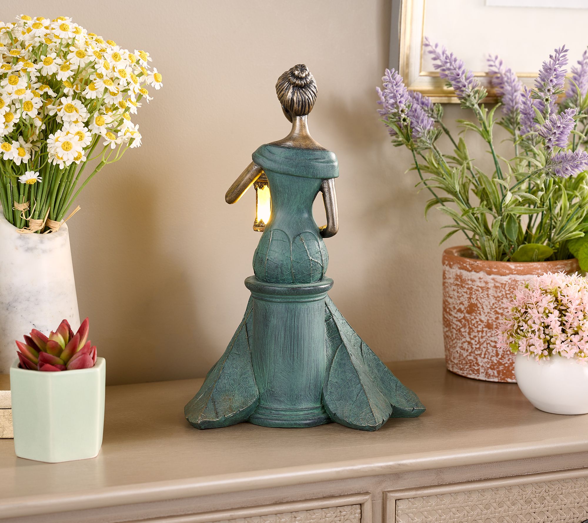 Light up your garden or home with this lovely lady holding an illuminating lantern. Although the pretty maiden resembles a bronze figurine, she's made of all-weather resin, so her graceful appearance is able to handle the elements, indoors or out. From the Valerie Parr Hill Collection.