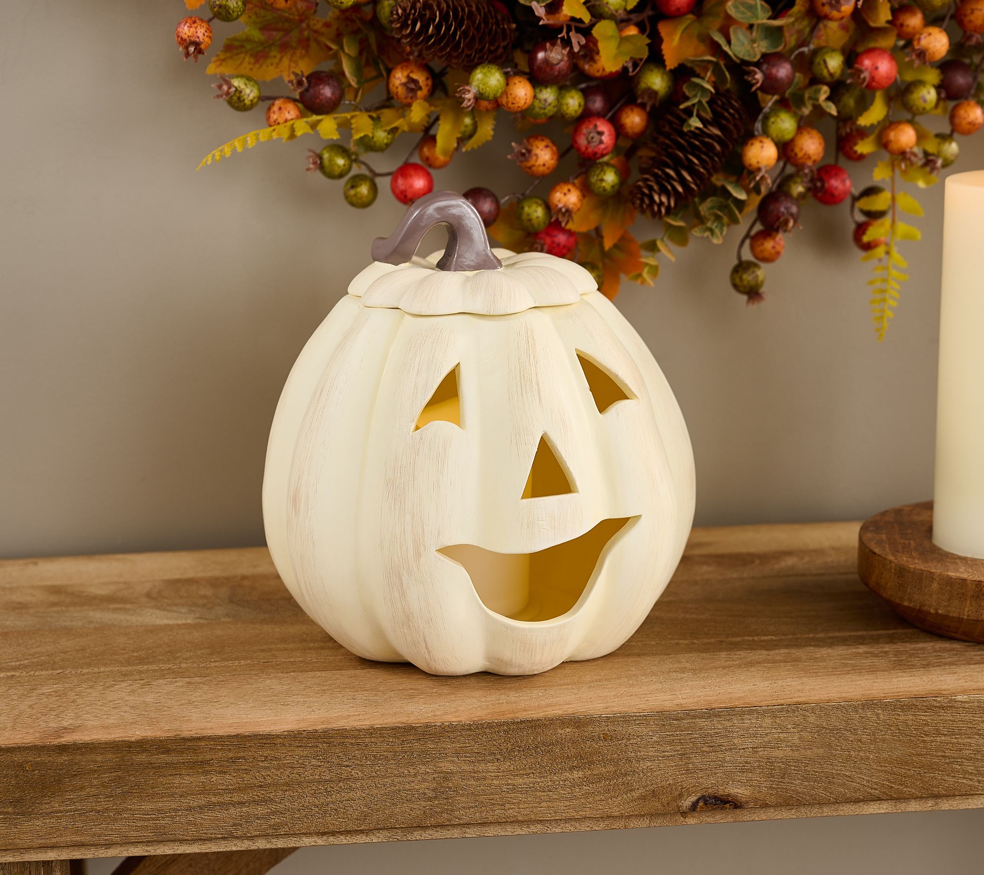 • Includes jack-o'-lantern pumpkin with lid and flameless pillar candle