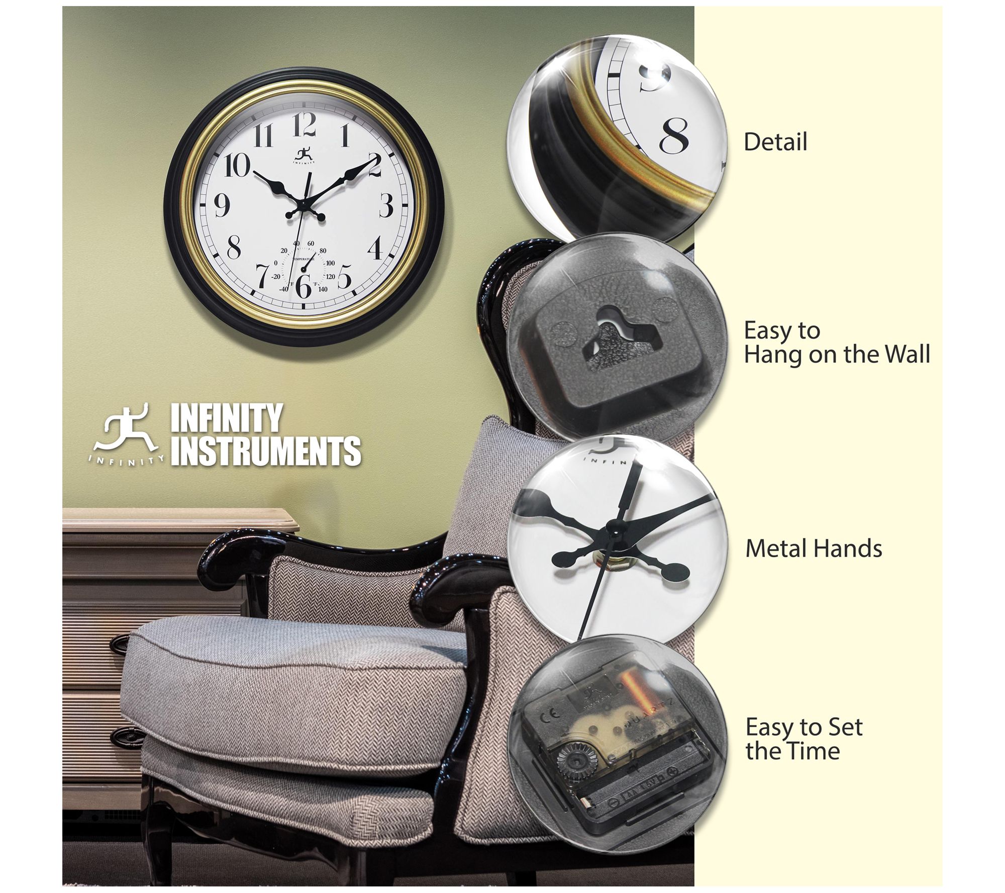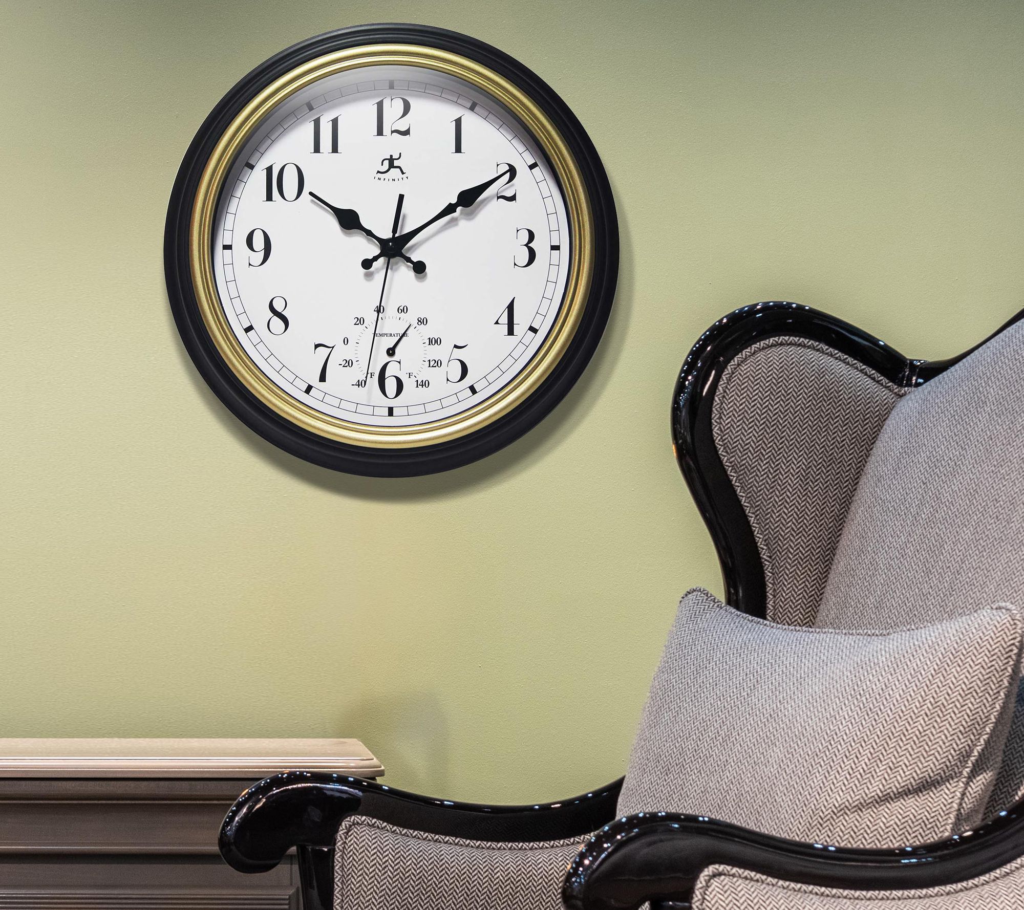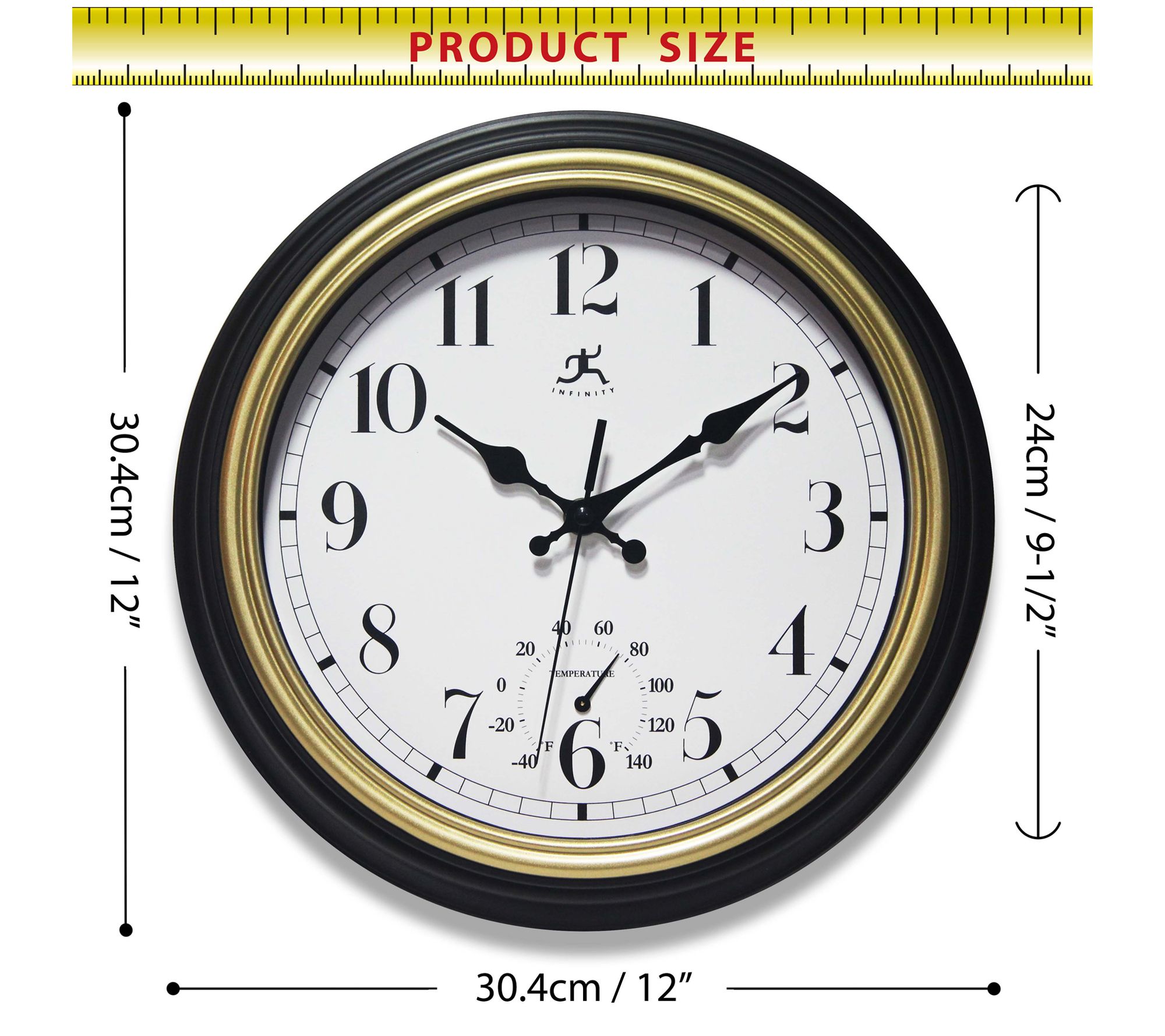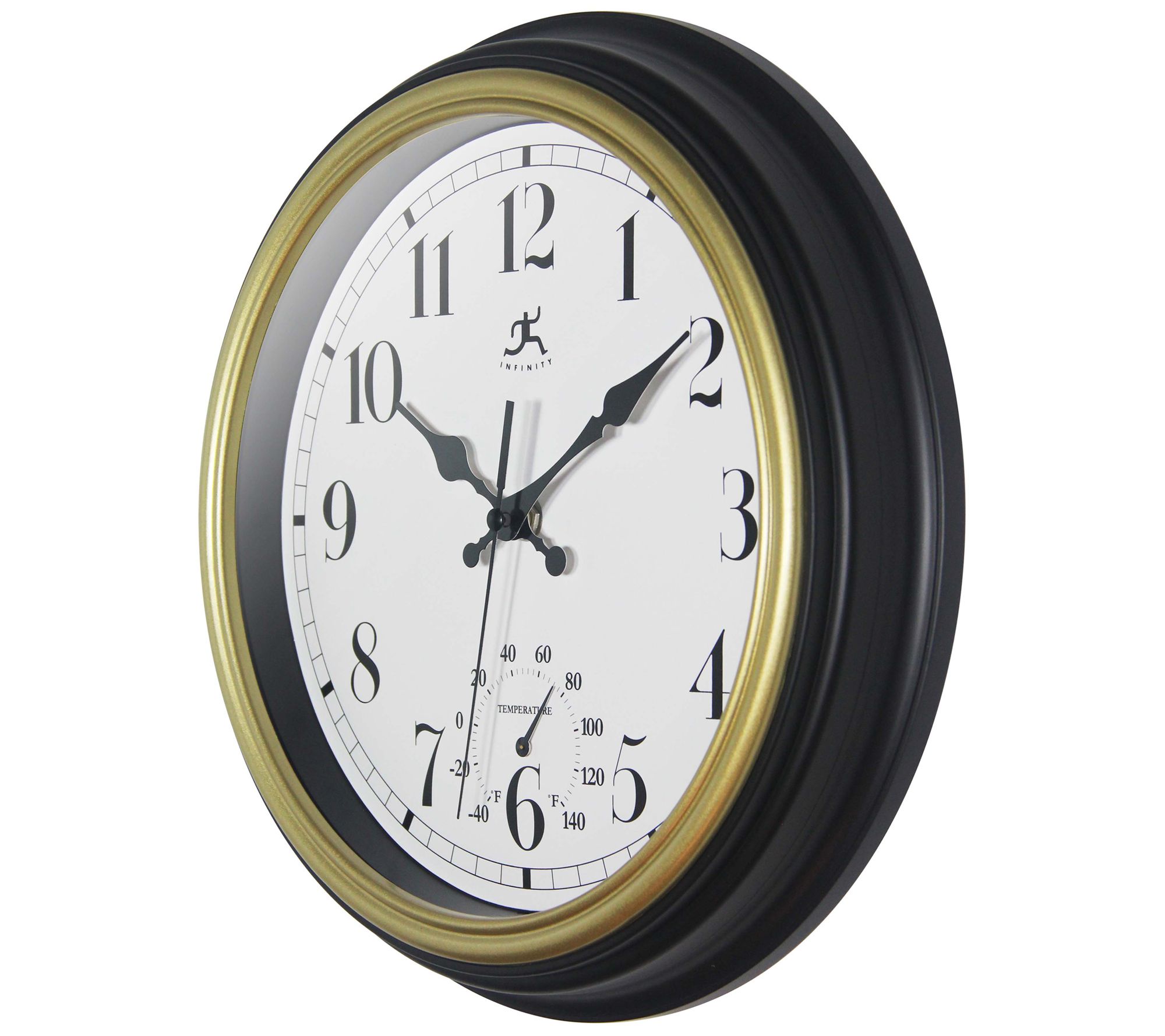 Add luxe style to your space as you keep and eye on the time and the temperature with this beautiful wall clock, featuring a rich black frame accented by a goldtone ring. From Infinity Instruments.