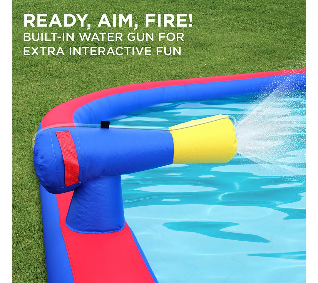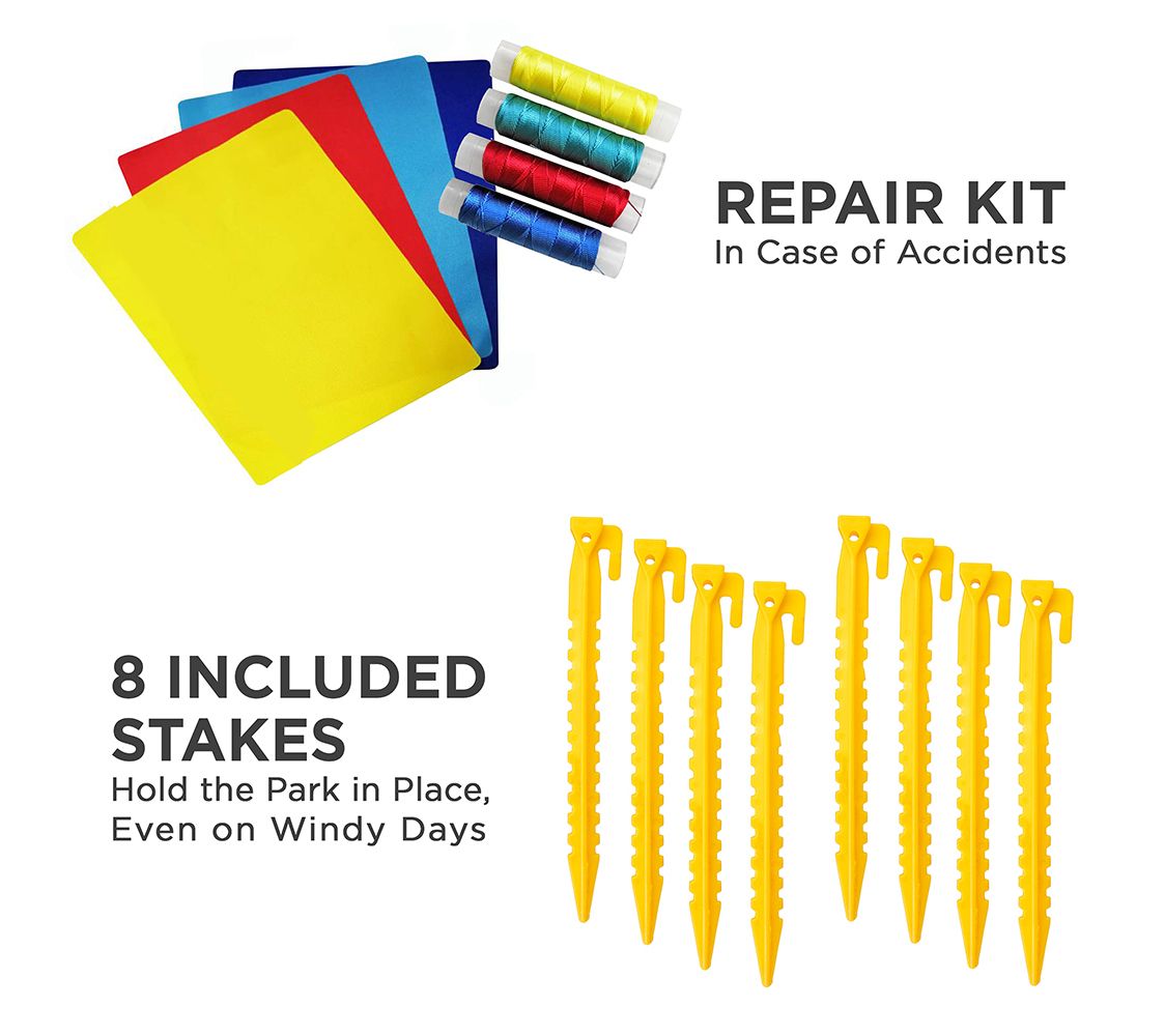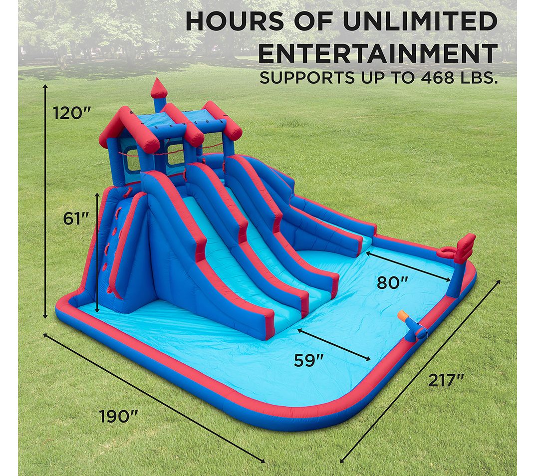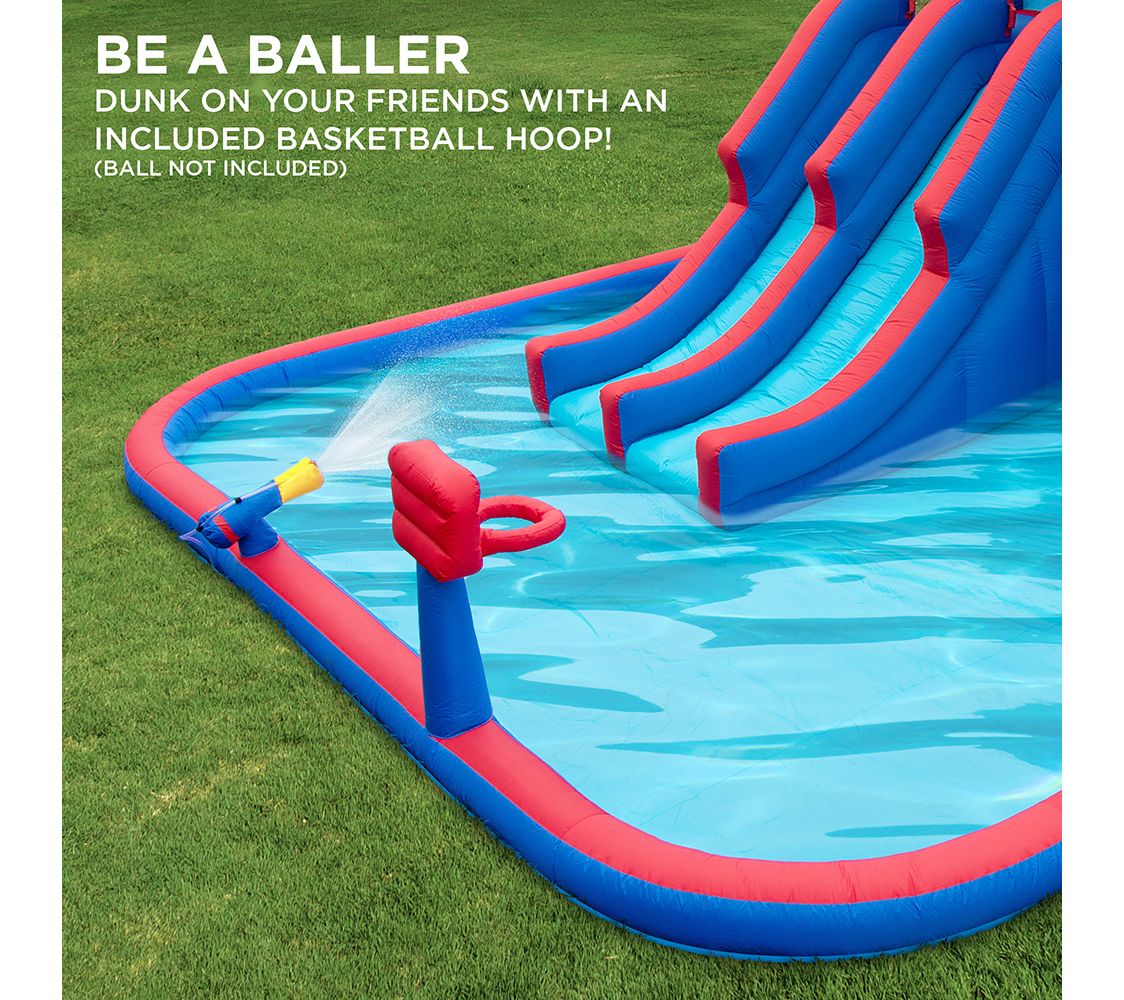 • Includes inflatable water park, air pump, carrying case, four air pump stakes, eight water park stakes, four repair patches, hose assembly kit, hose connector, basketball, and user guide