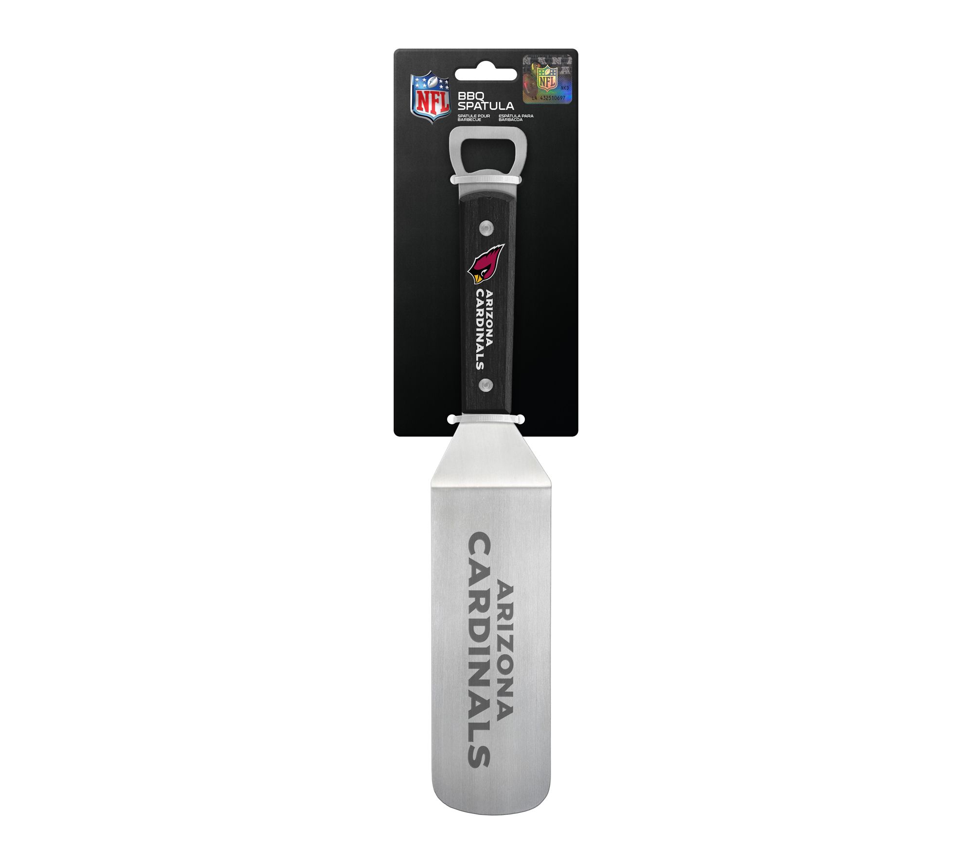 Whether you're grilling up burgers for game day or hosting a backyard cookout, this NFL BBQ spatula with bottle opener lets you flip, serve, and celebrate all at once. Show off your team pride with every turn of the meat, while the handy bottle opener makes it easy to enjoy your favorite beverage with friends and family. From Inglasco, Inc.
