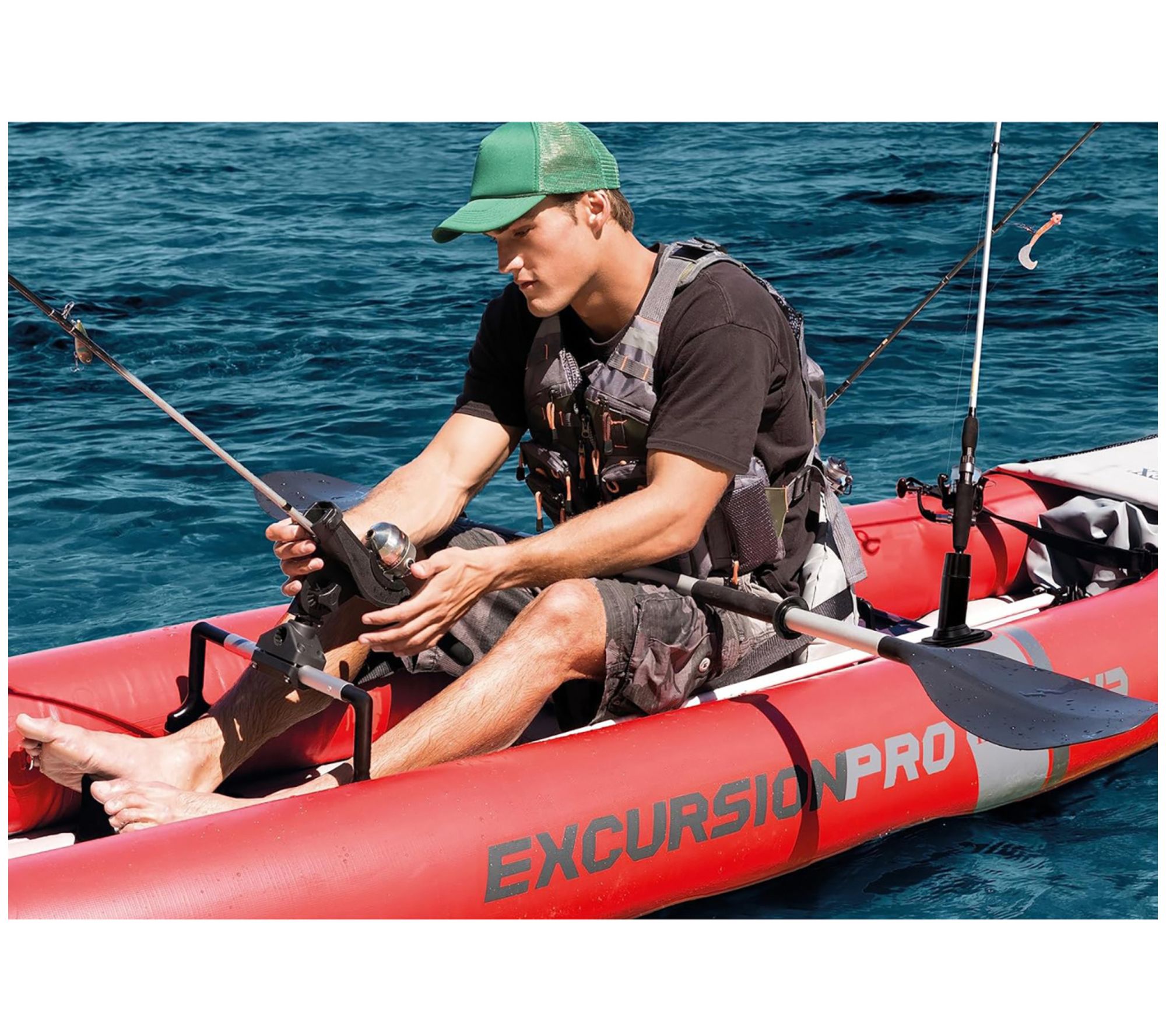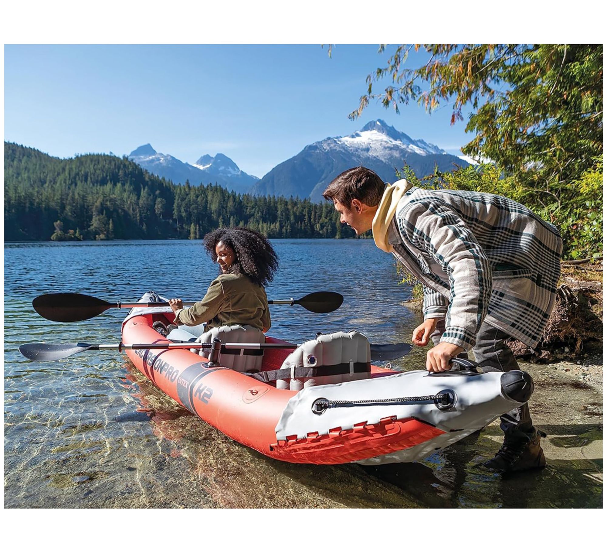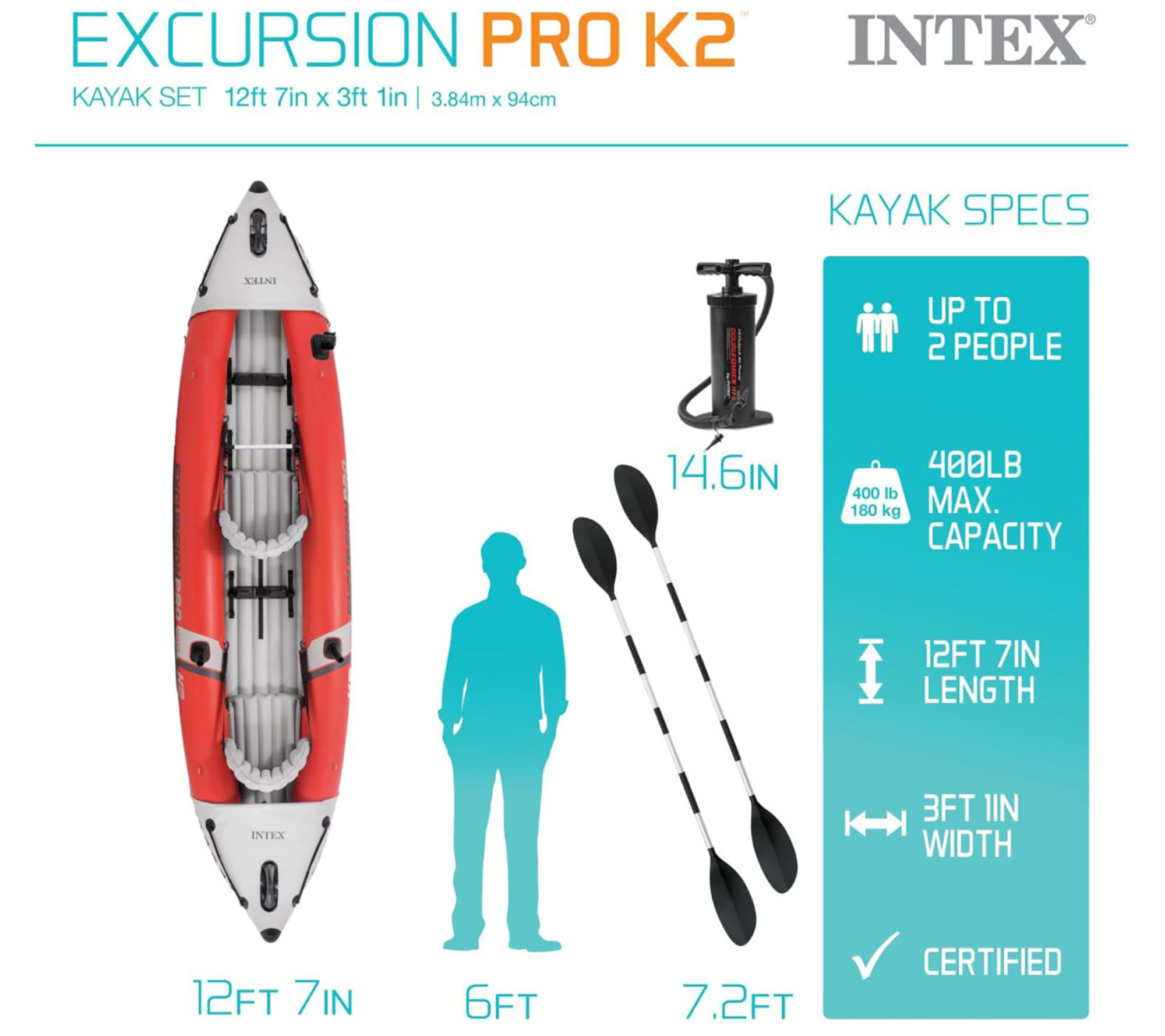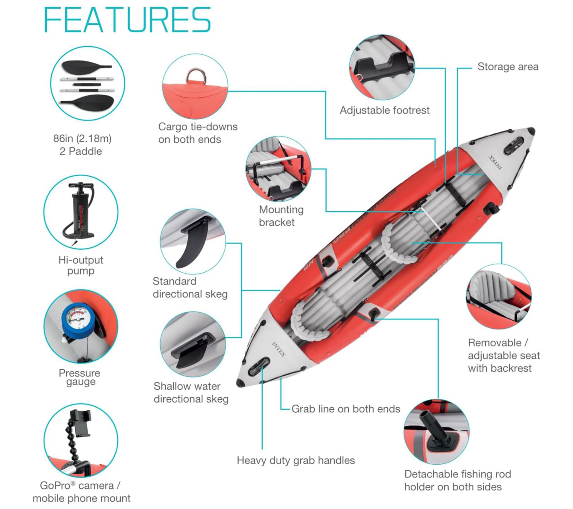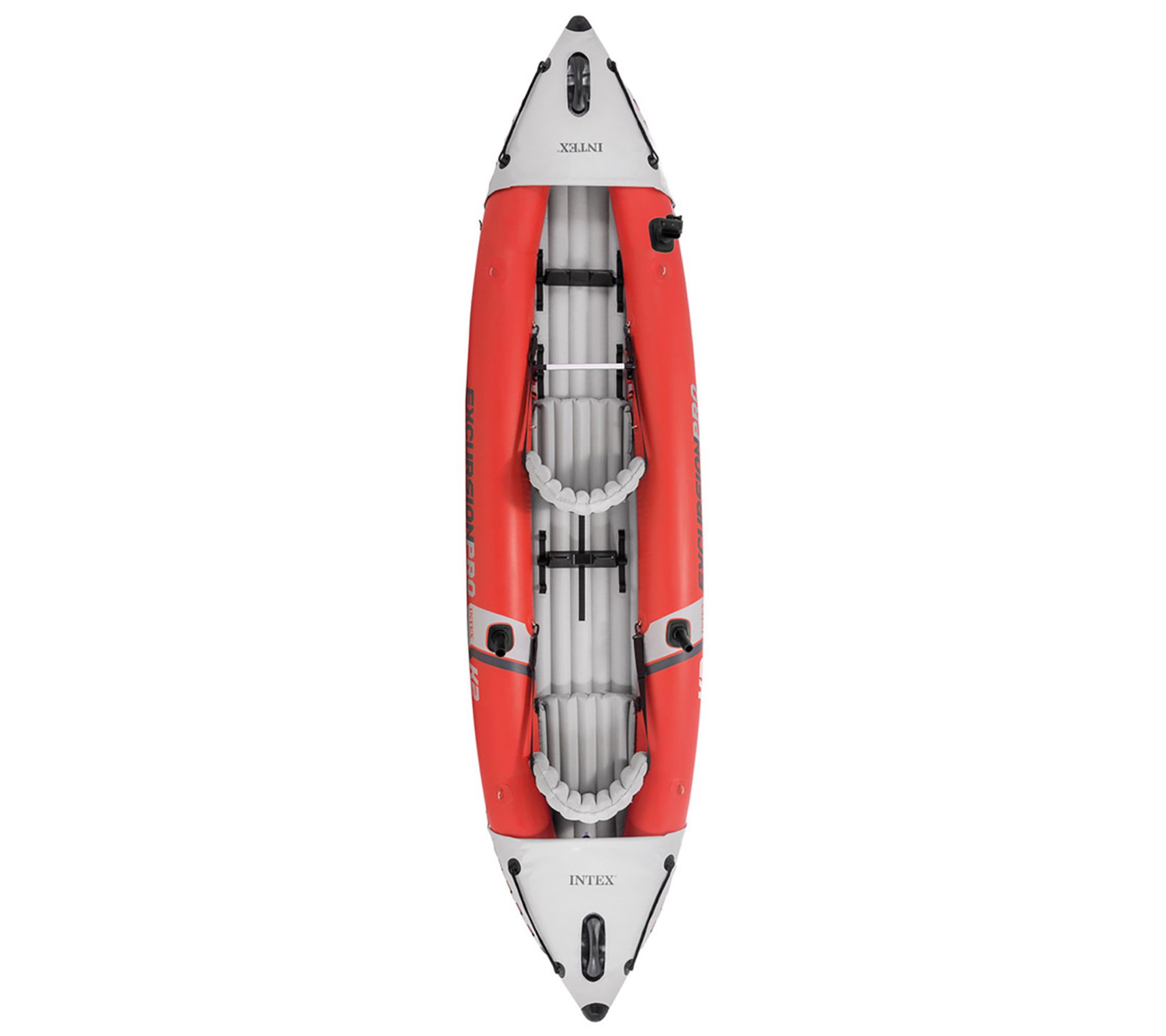 unvSellFeats:Having the right kayak to support you on your day in thewater can make a huge difference in the quality of your experience. That's why the Intex Excursion Pro Kayak is made with features like adjustable seats or built-in footrests to keep you comfortable. Not onlythat, it's also made with fishing rod holders on each side for hands-free fishing. There's also a waterproof bag you can latch into the front for anything you need to carry out onto the water with you. Sinceit's inflatable, it's easy to stow away on a car or in the back of a;Intex kayak, 2 paddles, hi-output pump, carry bag, removable seat booster, mounting bracket for fishing accessories, 2 fishing rod holders, adjustable footrests, removable seats, 2 skegs, user manual, repair patch.