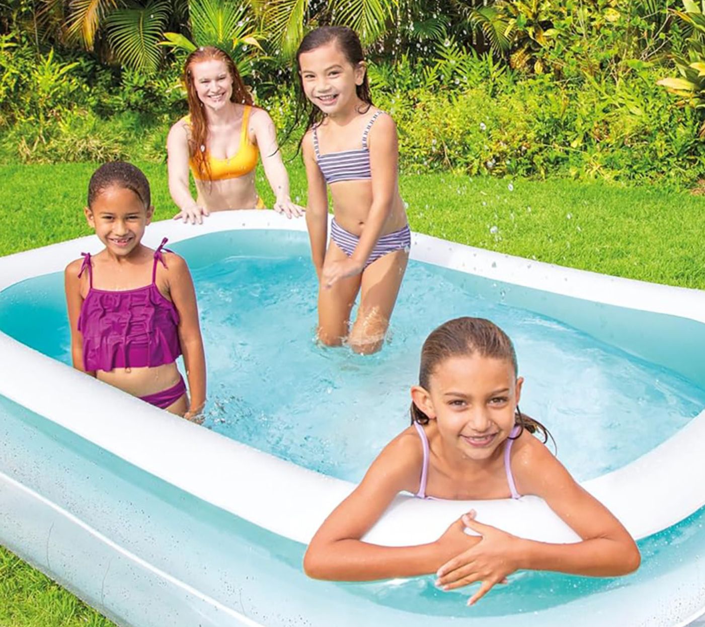 Make a splash this summer with this inflatable family pool! Perfect for the whole family, it features wide sidewalls for ultimate lounging and maximum play room. With two air chambers and a combo valve, inflating and deflating are a breeze. Stay cool and have fun in the sun for hours! From Intex.
