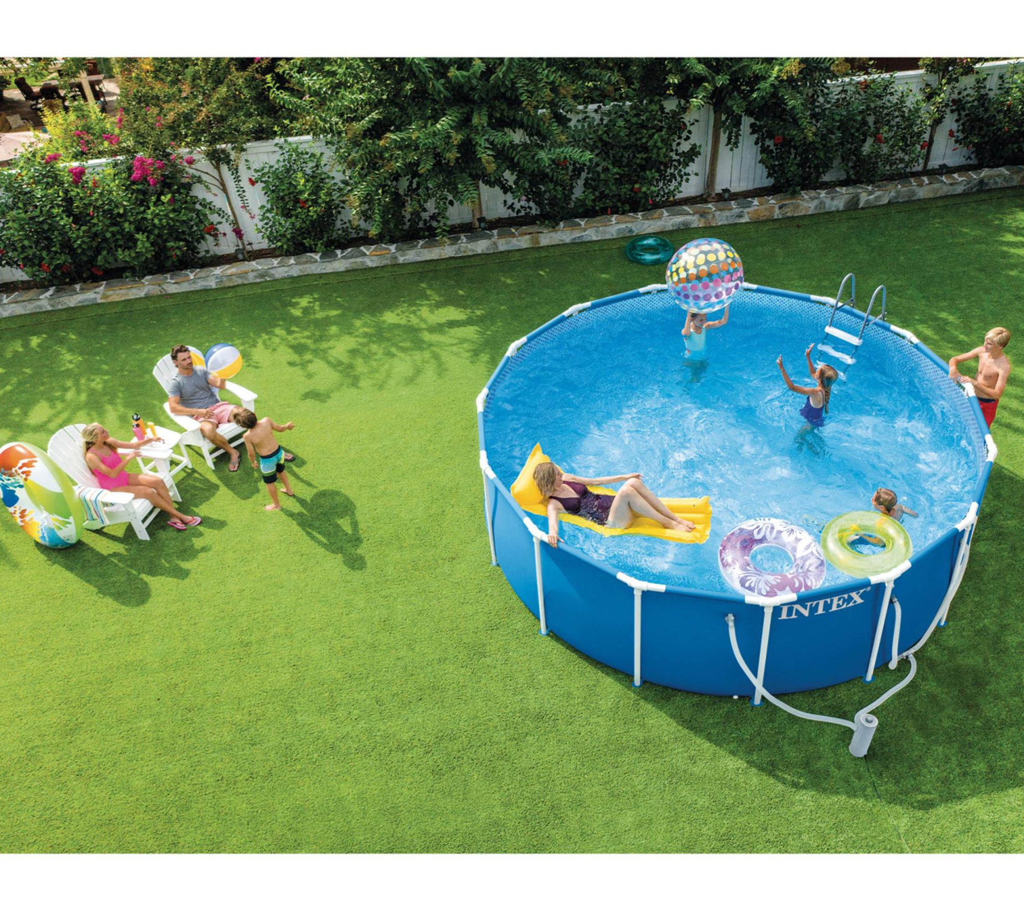Create memorable summer moments with a swimming pool that transforms your backyard into a refreshing retreat. The metal frame pool invites the whole family to splash, swim, and relax, while the easy assembly means you'll be swimming in no time. Perfect for lively pool parties or quiet afternoons, this set delivers comfort and convenience. From Intex.