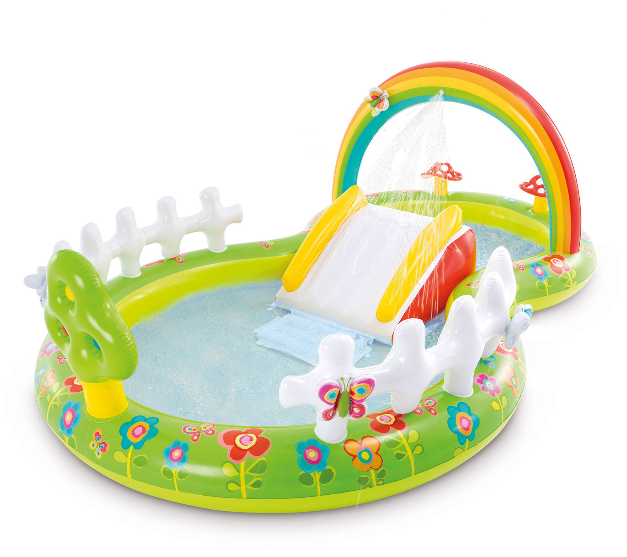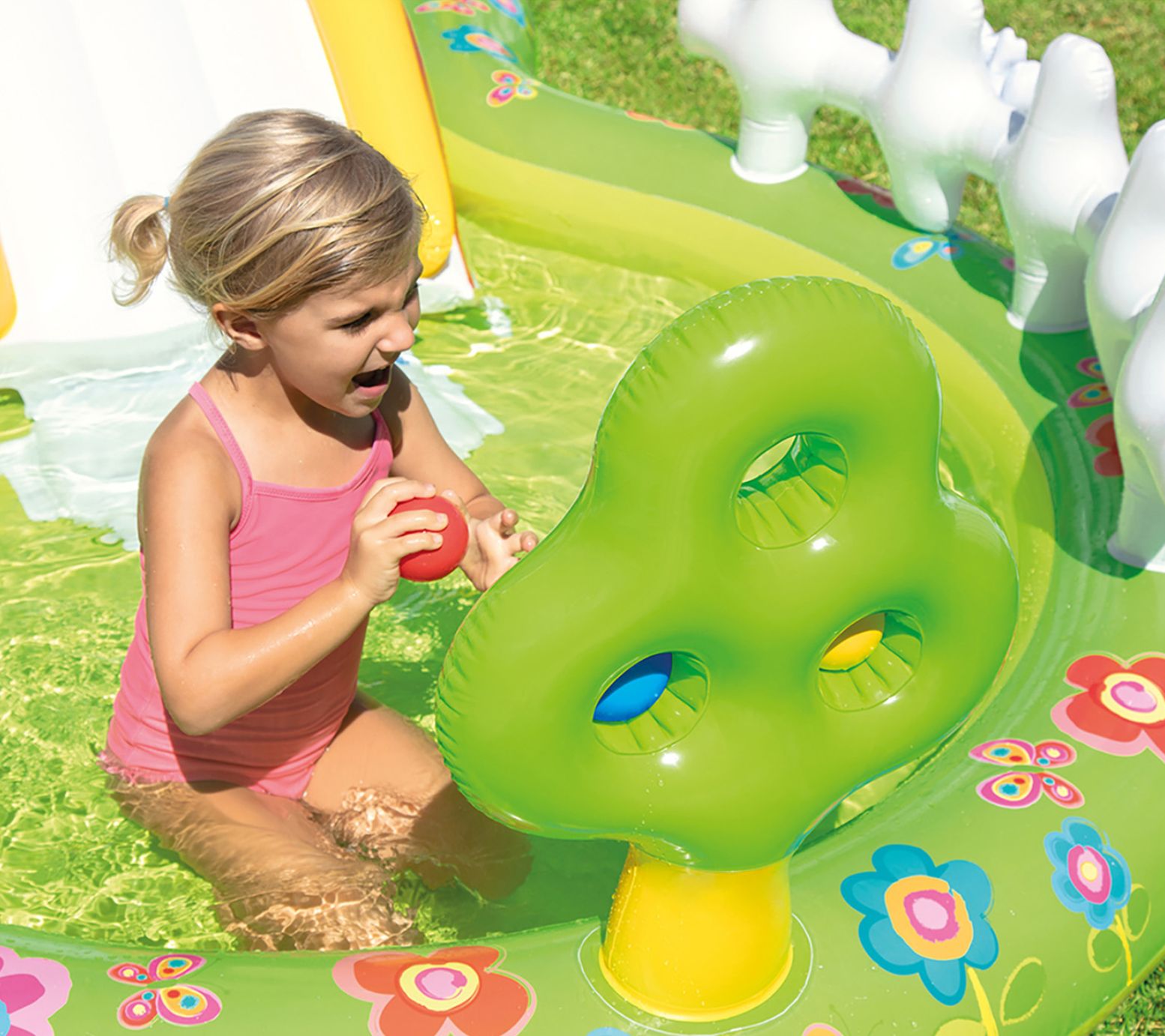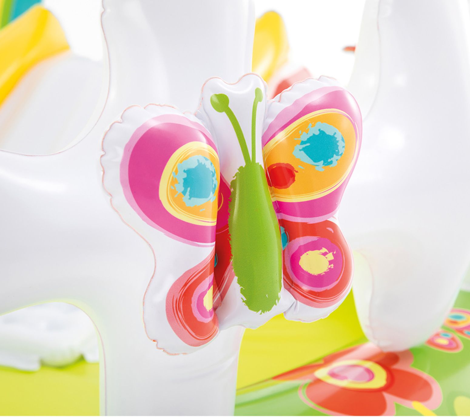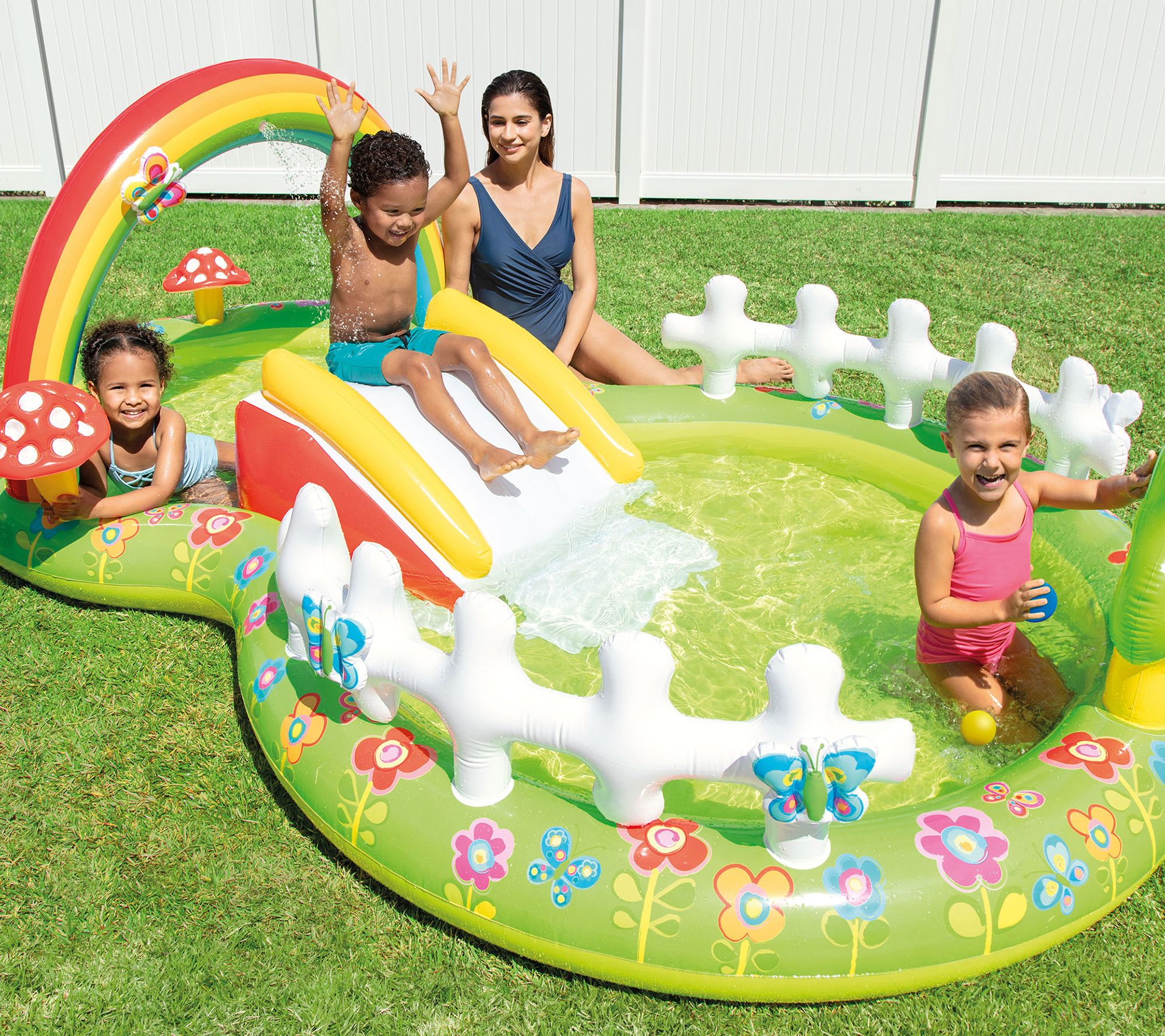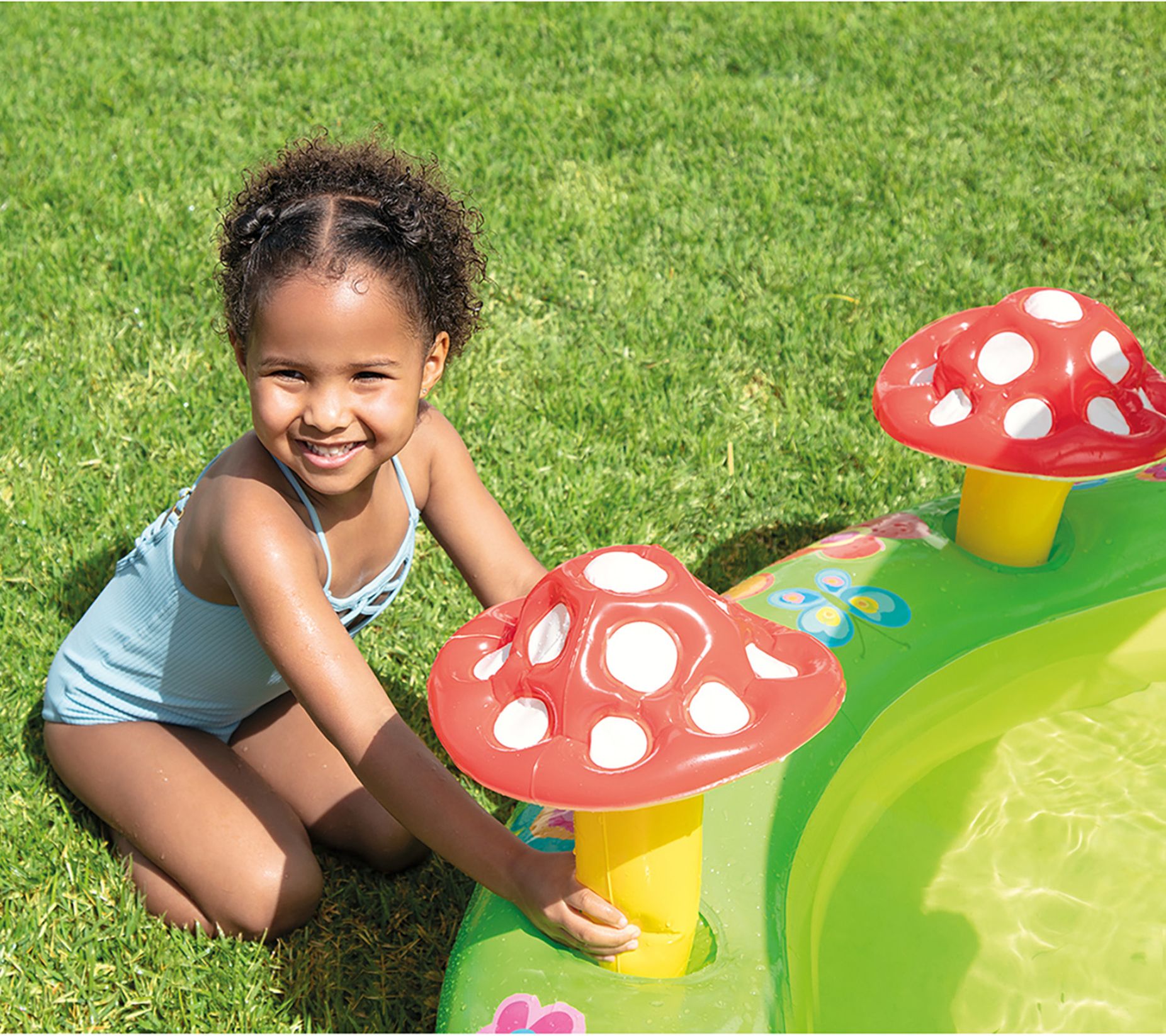 Sun's out, fun's out! This garden playset features a fun, water-filled environment that all your kiddos will enjoy, with a built-in sprayer, two mushrooms, four butterflies, and three balls. Just hook up to your garden hose, sit back, and enjoy the sunny smiles. From Intex.