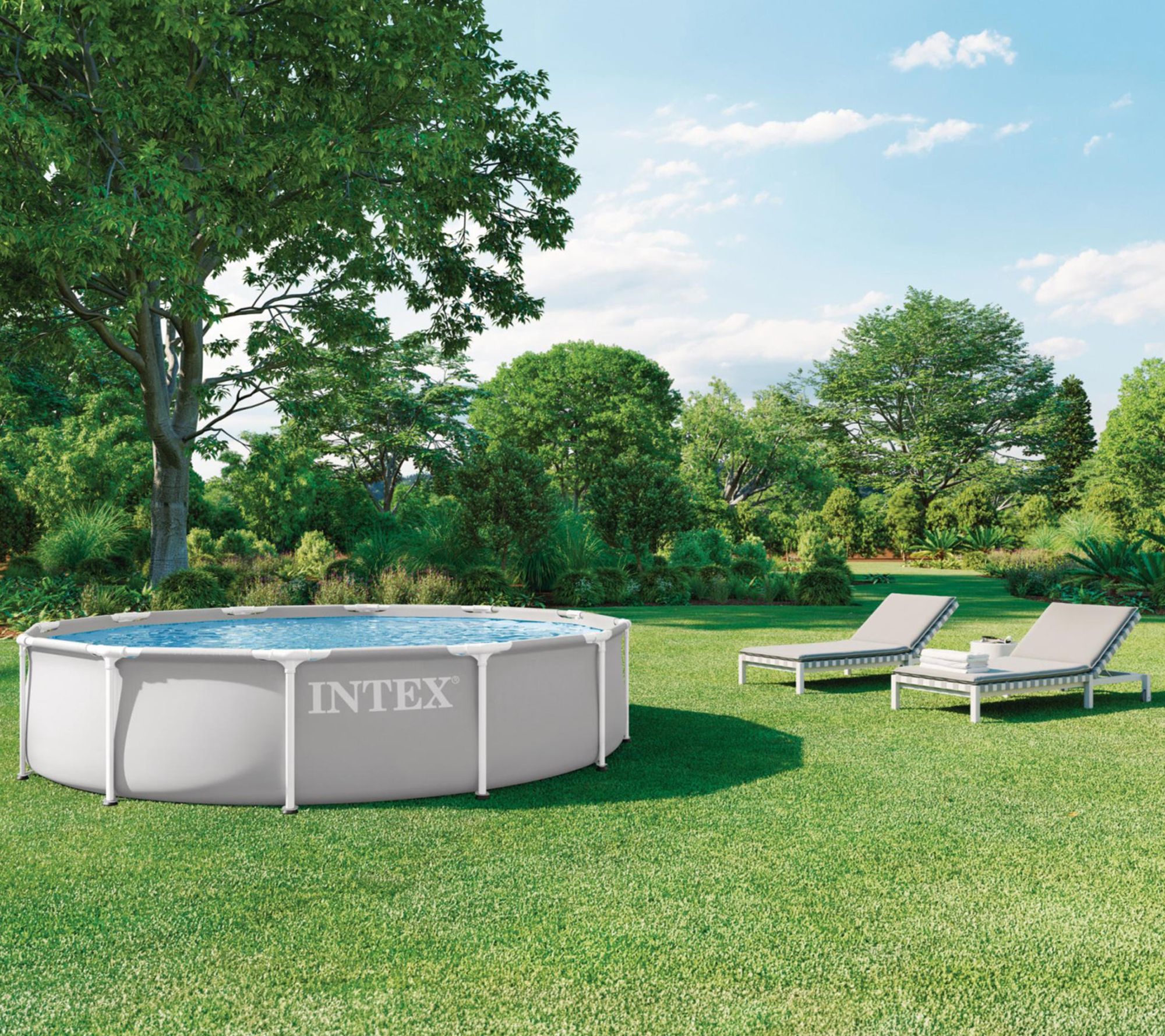 Make summer memories with this swimming pool set, featuring a puncture-resistant liner and powder-coated steel frame that brings a splash of color and beauty to your backyard. The included cartridge filter pump with HydroAeration Technology keeps water clear and refreshing, so your family can enjoy hours of fun in a cool, inviting oasis. From Intex.