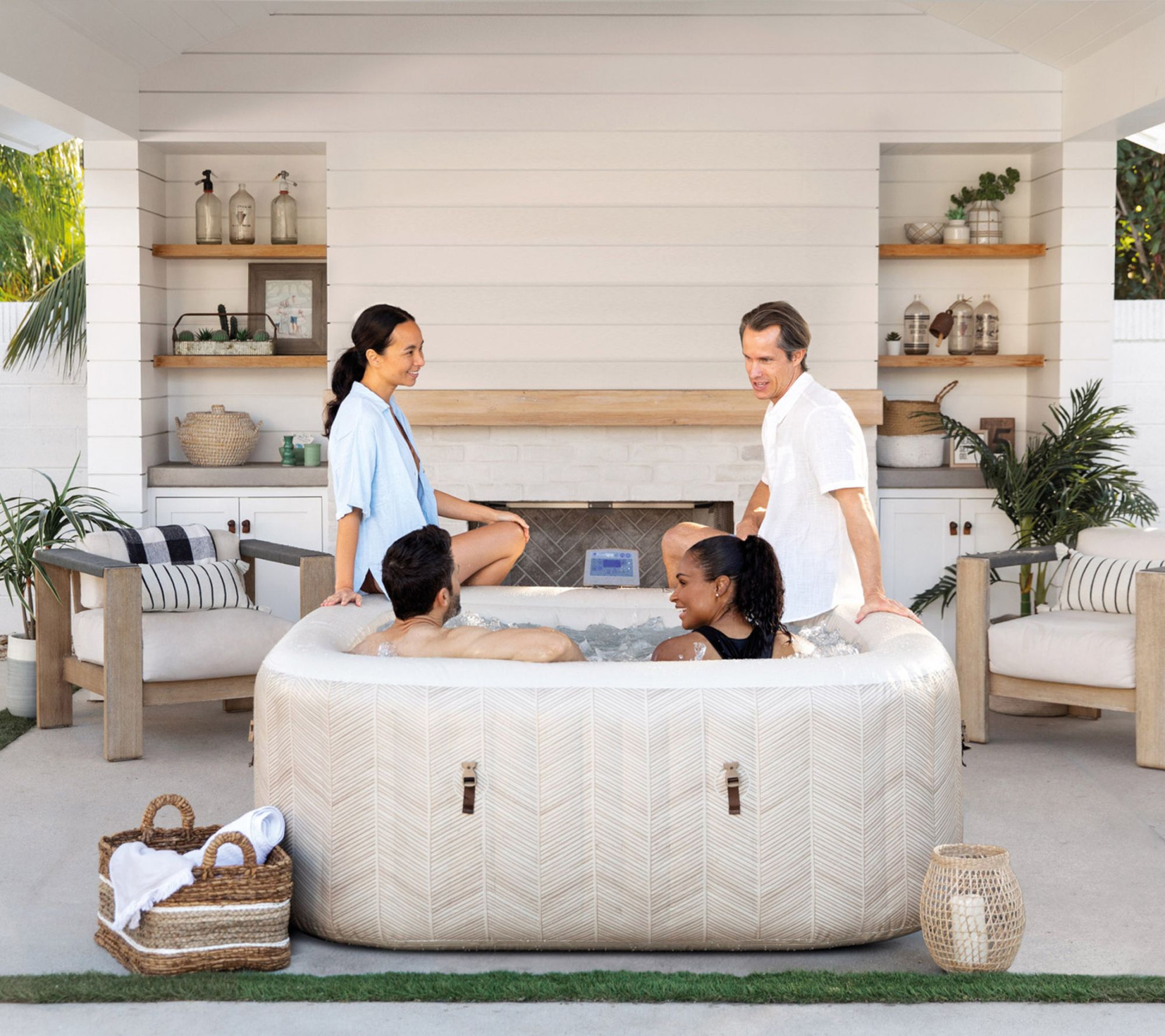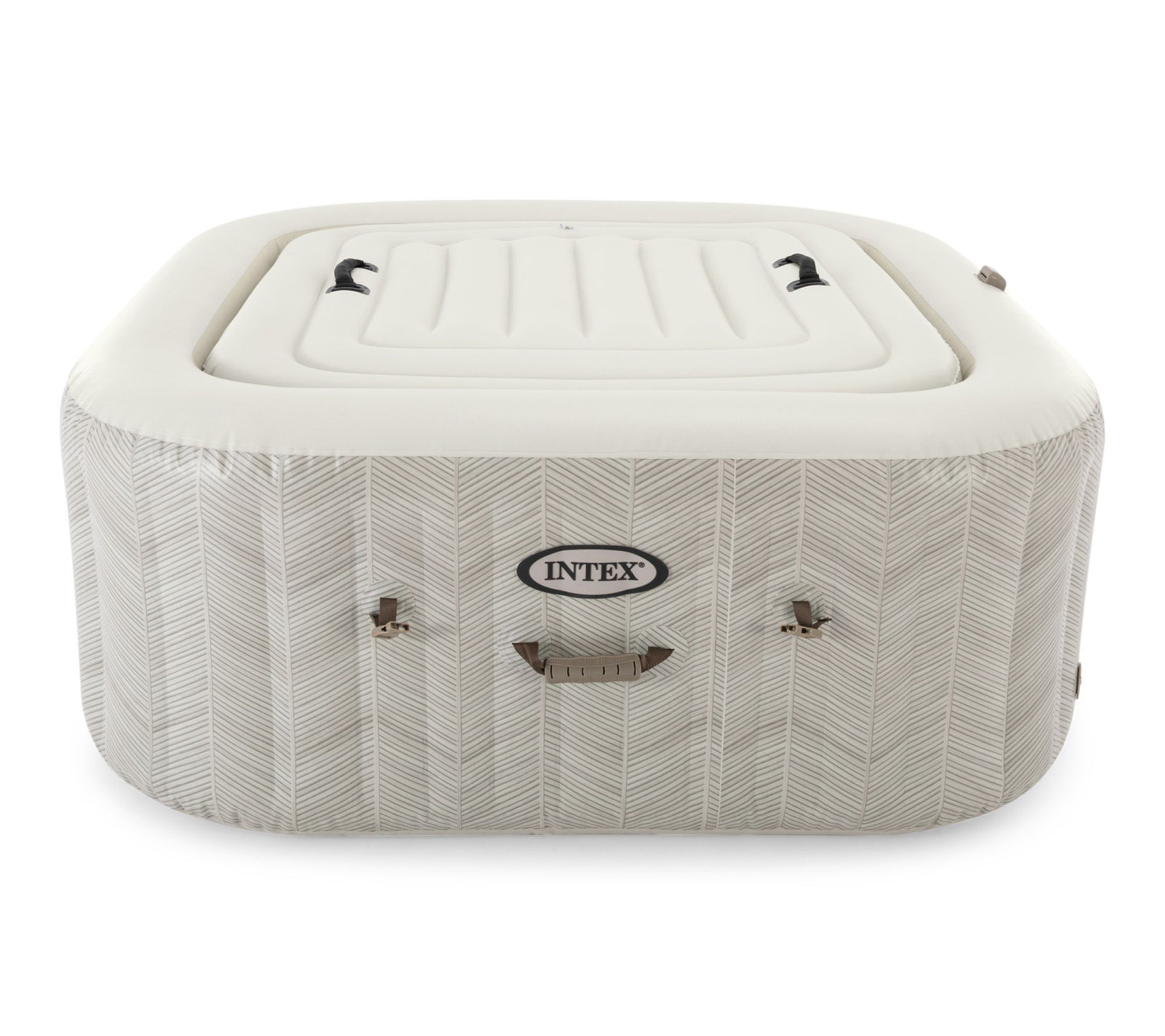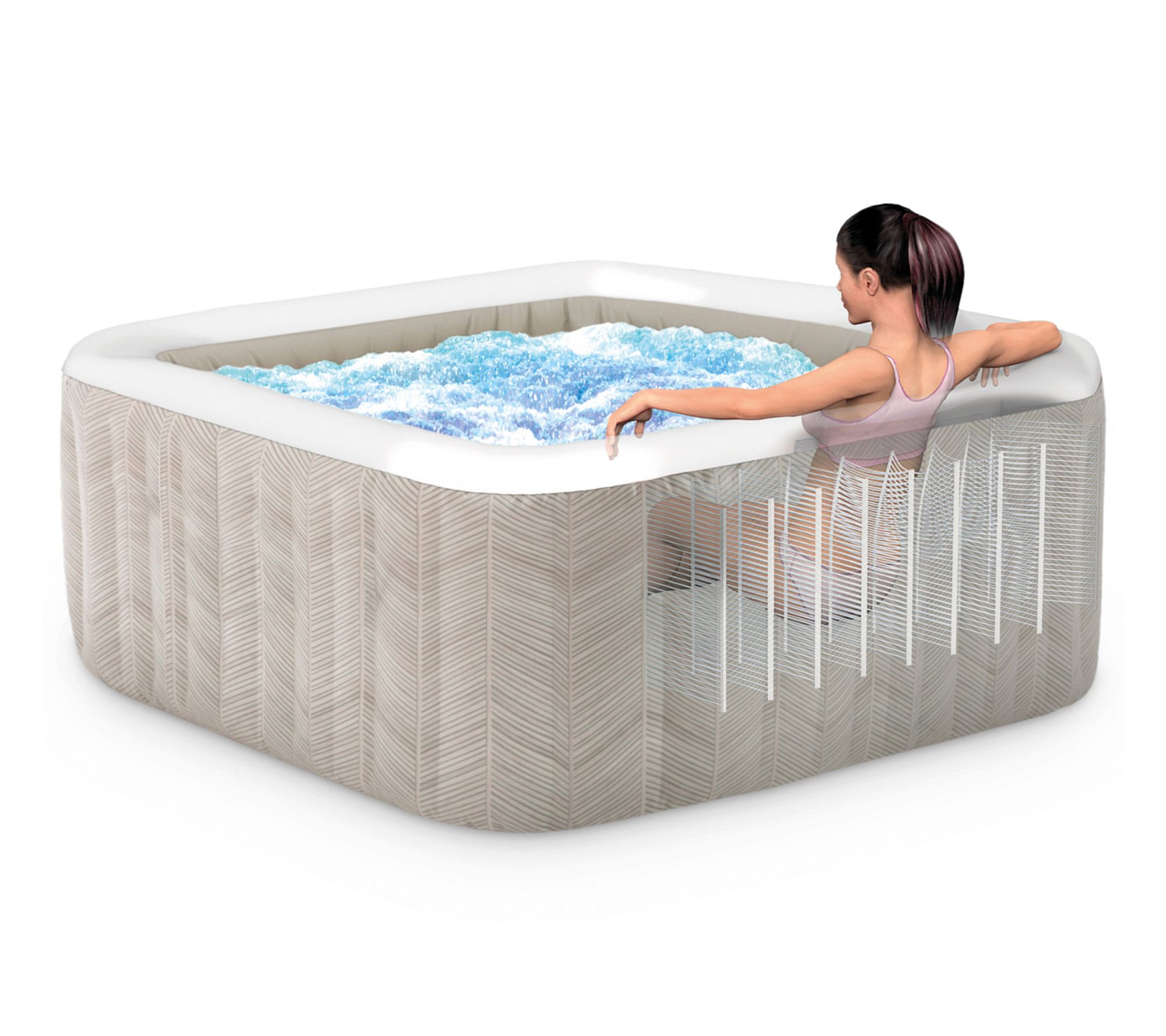 Bring the spa day home with this four-person inflatable hot tub, designed to help you unwind at the end of a long week or enjoy quality time with family. Kick back in the stylish chevron-patterned spa as 140 bubbling jets offer a gentle massage, while simple app controls and a cover make relaxation effortless and maintenance easy. From Intex.
