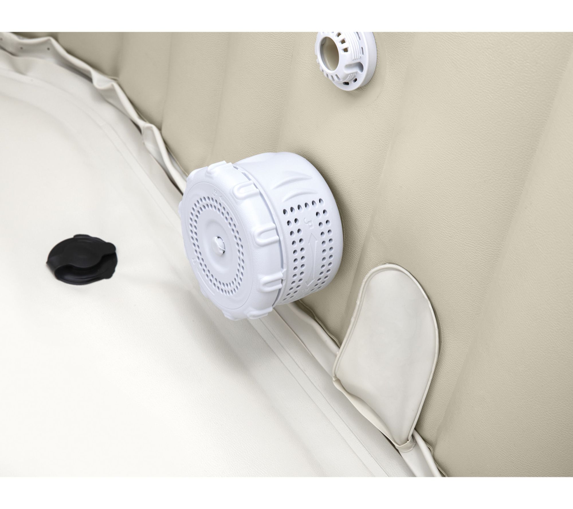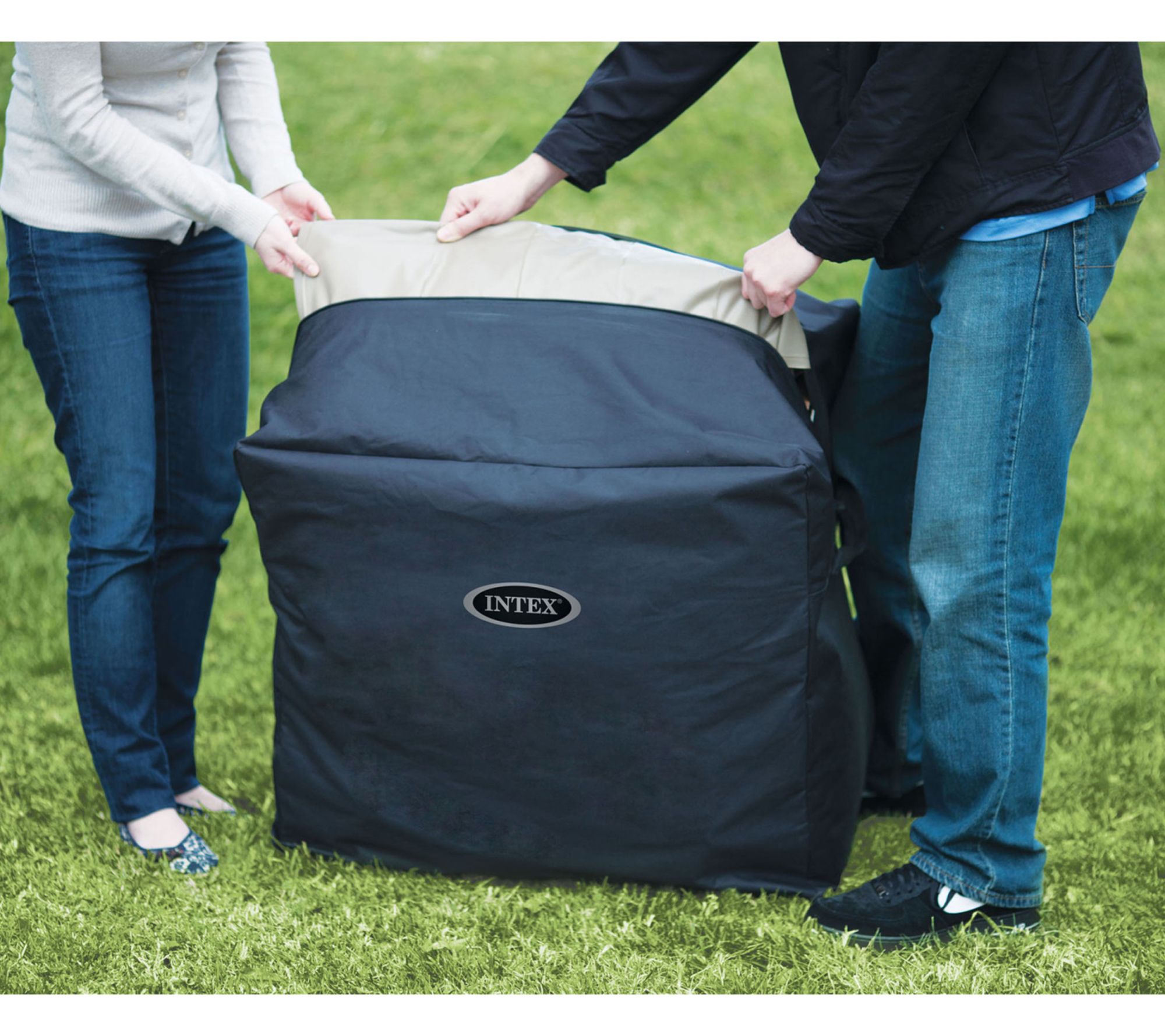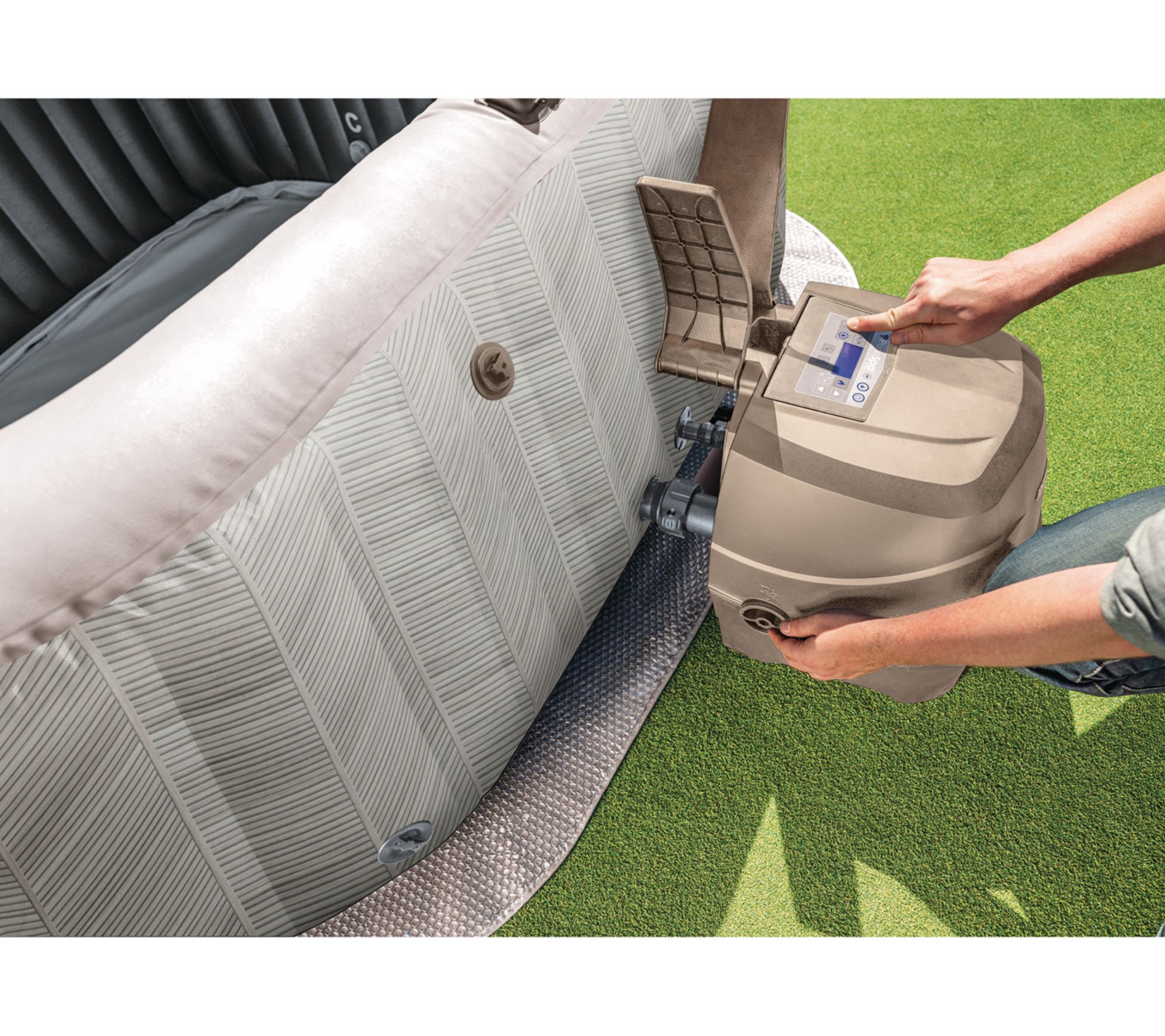 Includes four-person hot tub, spa cover, ground cloth, carry bag, and two filter cartridges