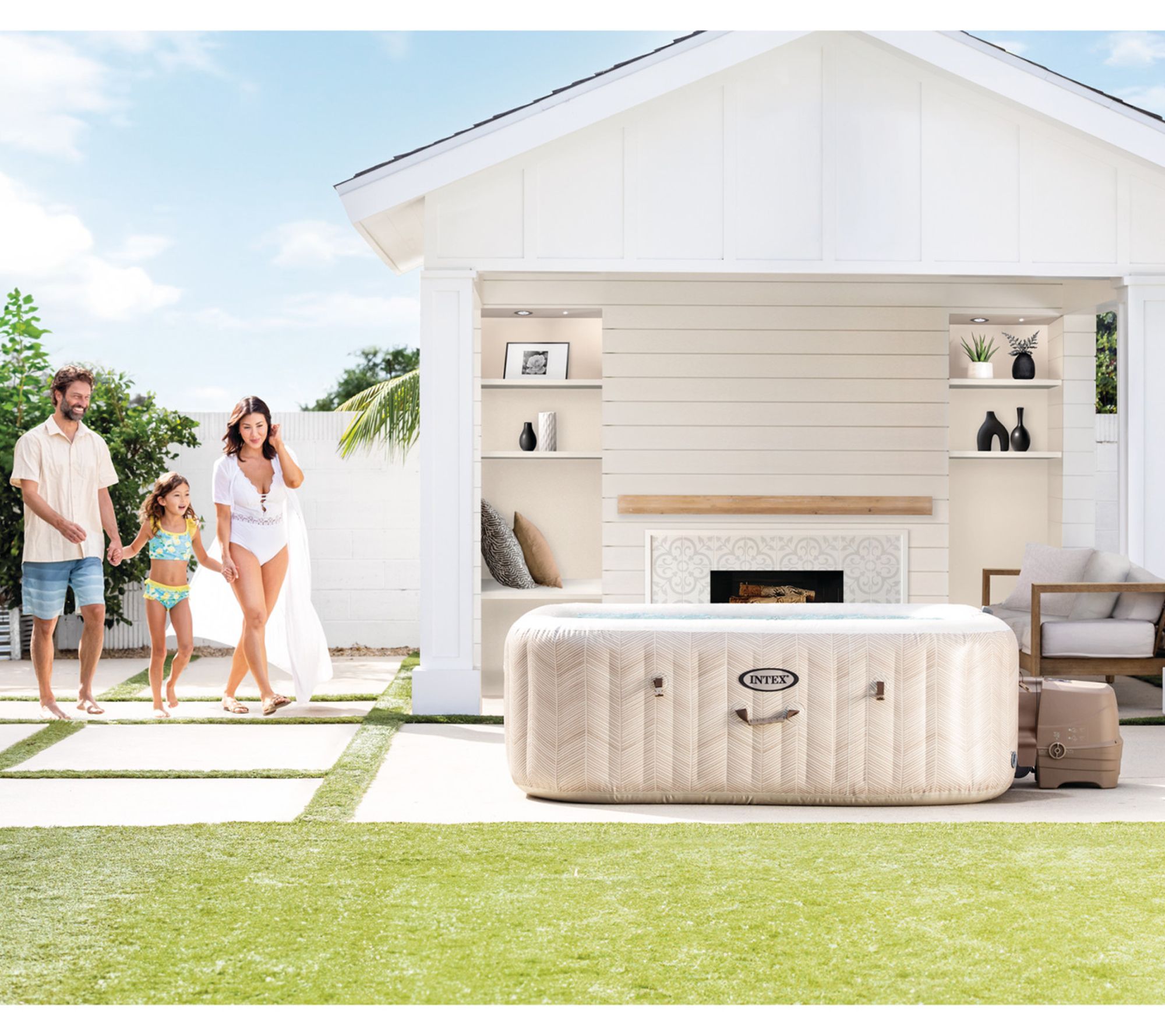 Includes six-person hot tub, spa cover, ground cloth, carry bag, and two filter cartridges
