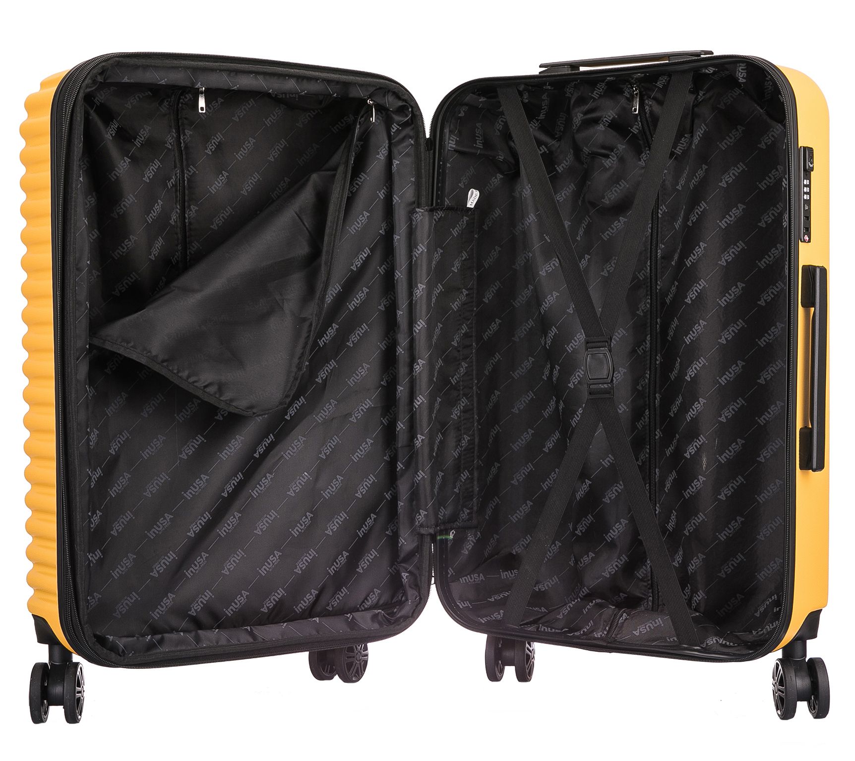Hard-flex ABS/PC engineered exterior with brushed finish, water-resistant exterior, side-mounted three-digit TSA combination lock, top and side ergonomic gel handles, four side studs to stand upright, expands 2" for additional space, multi-directional 360-degree dual spinner wheels, locking retractable push-button telescopic trolley handle