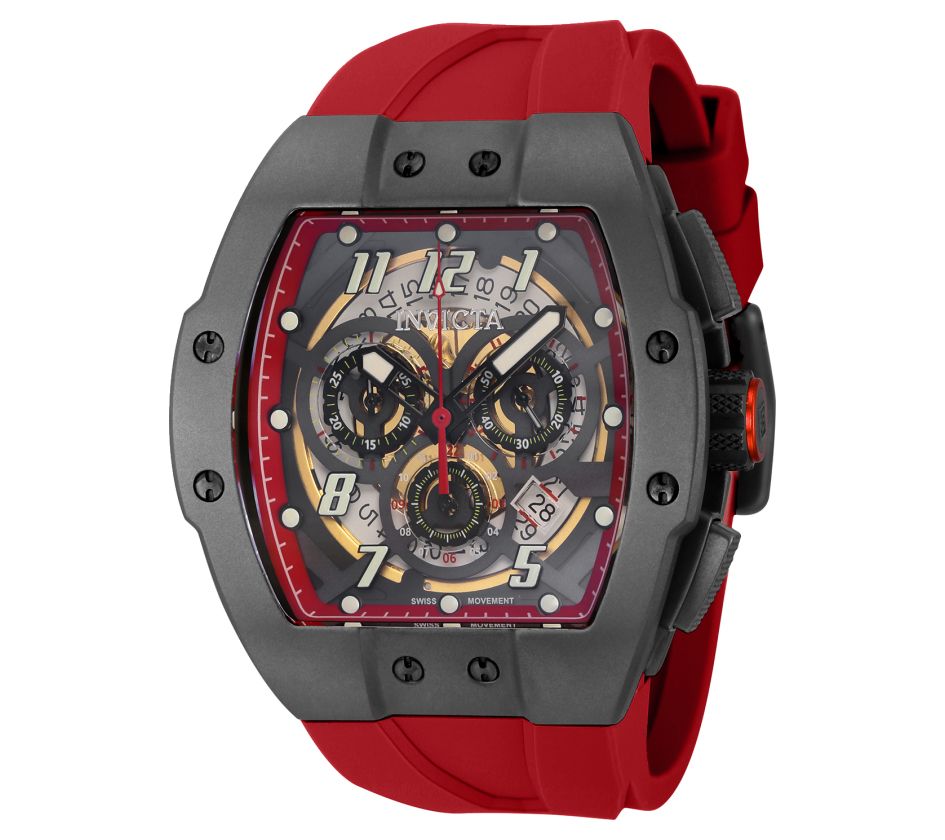 This eye-catching watch features a black stainless steel case and a striking red silicone strap. Its transparent and red dial, protected by a sturdy sapphire crystal, adds a unique touch to your wrist. From Invicta.
