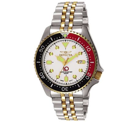 Accessorize handsomely with this stainless steel Invicta diver's watch. Sure to make a splash, the grand two-tone bracelet leads to a black, red, and goldtone unidirectional bezel and a polished, round white dial. The dial boasts luminescent green dots at each hour, while luminescent goldtone hour, minute, and second hands keep track of time. Date window at 3 o'clock. Stainless steel case, caseback, and crown. Secures with a stainless steel five-link, dual-deployment clasp and a safety clasp. Water-resistant up to 100M. Swiss quartz analog movement.