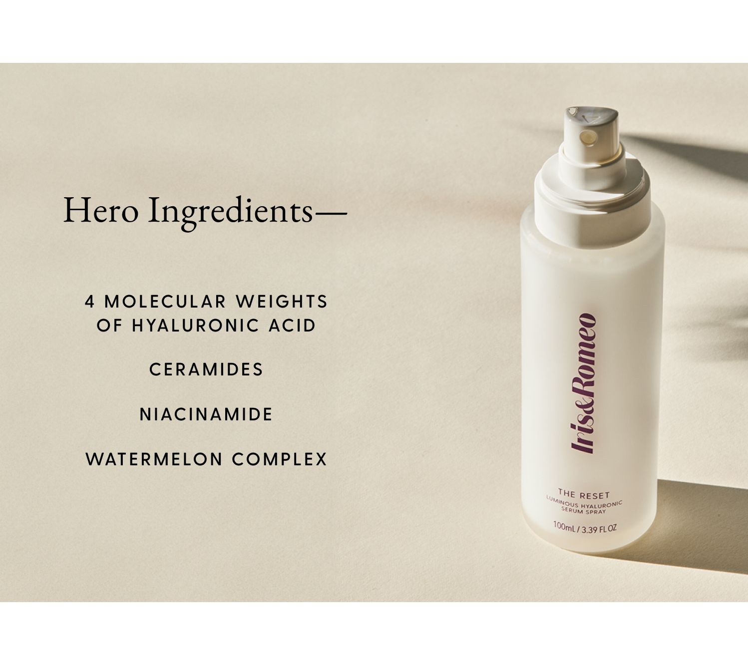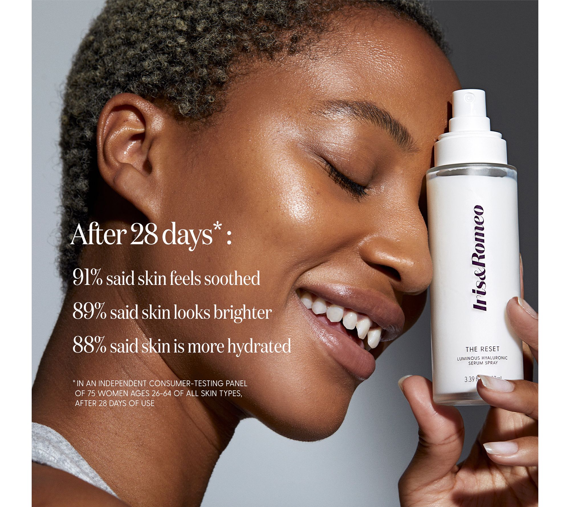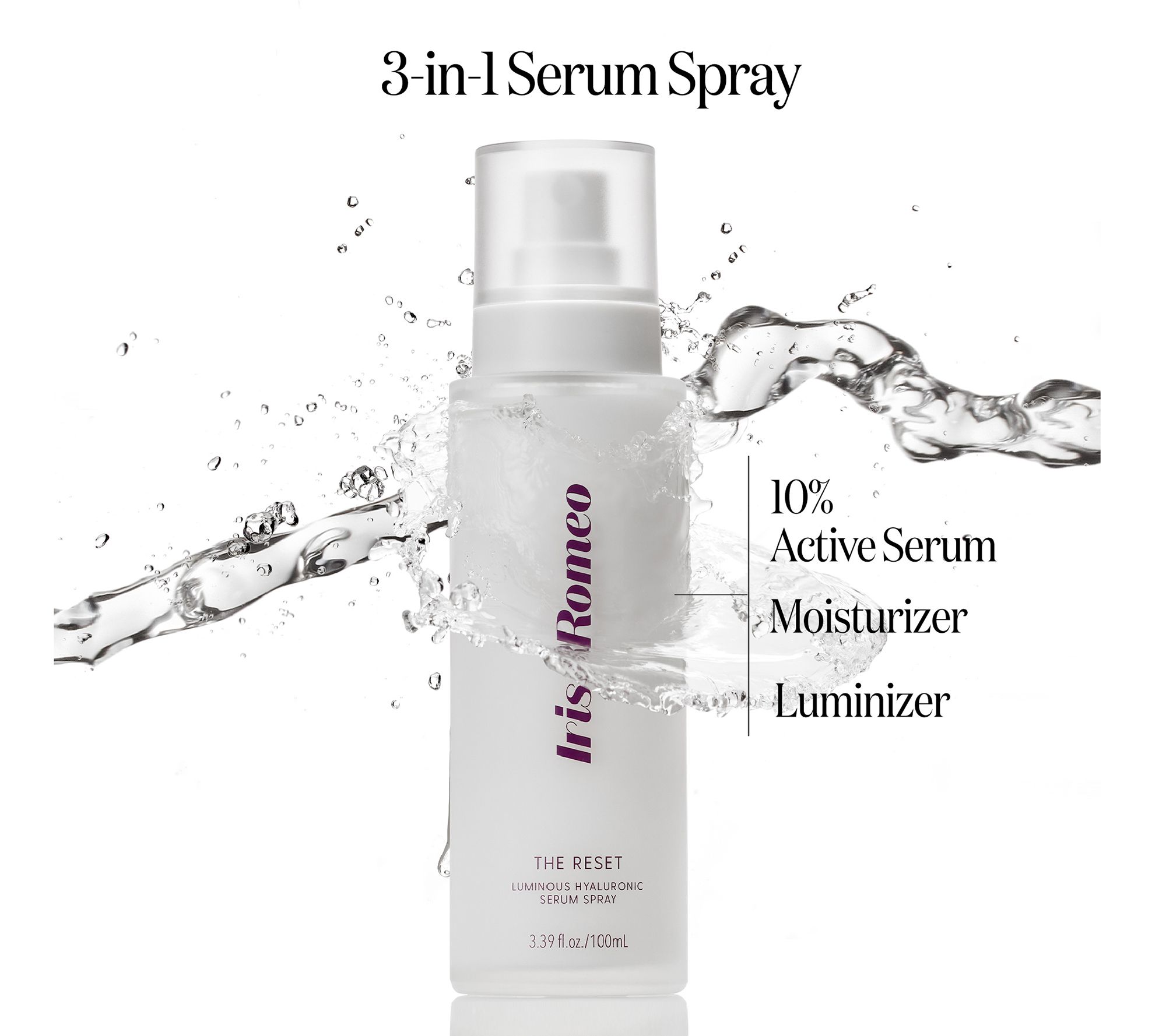 Replace your serum, moisturizer, and luminizer with The Reset Luminous Hyaluronic Serum Spray, a 3-in-1 hybrid serum spray from Iris & Romeo. It contains hyaluronic acid, known to help temporarily plump the appearance of skin and temporarily diminish the look of fine lines and wrinkles, and antioxidants which may help fight against free radical aggressors. It's also formulated with niacinamide, known to temporarily brighten the look of skin and to help improve the appearance of uneven skin tone with continued use. From Iris & Romeo.