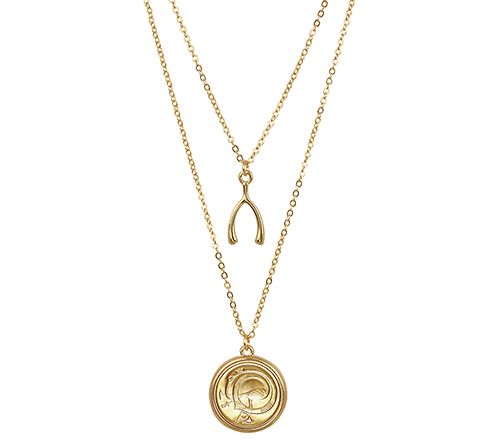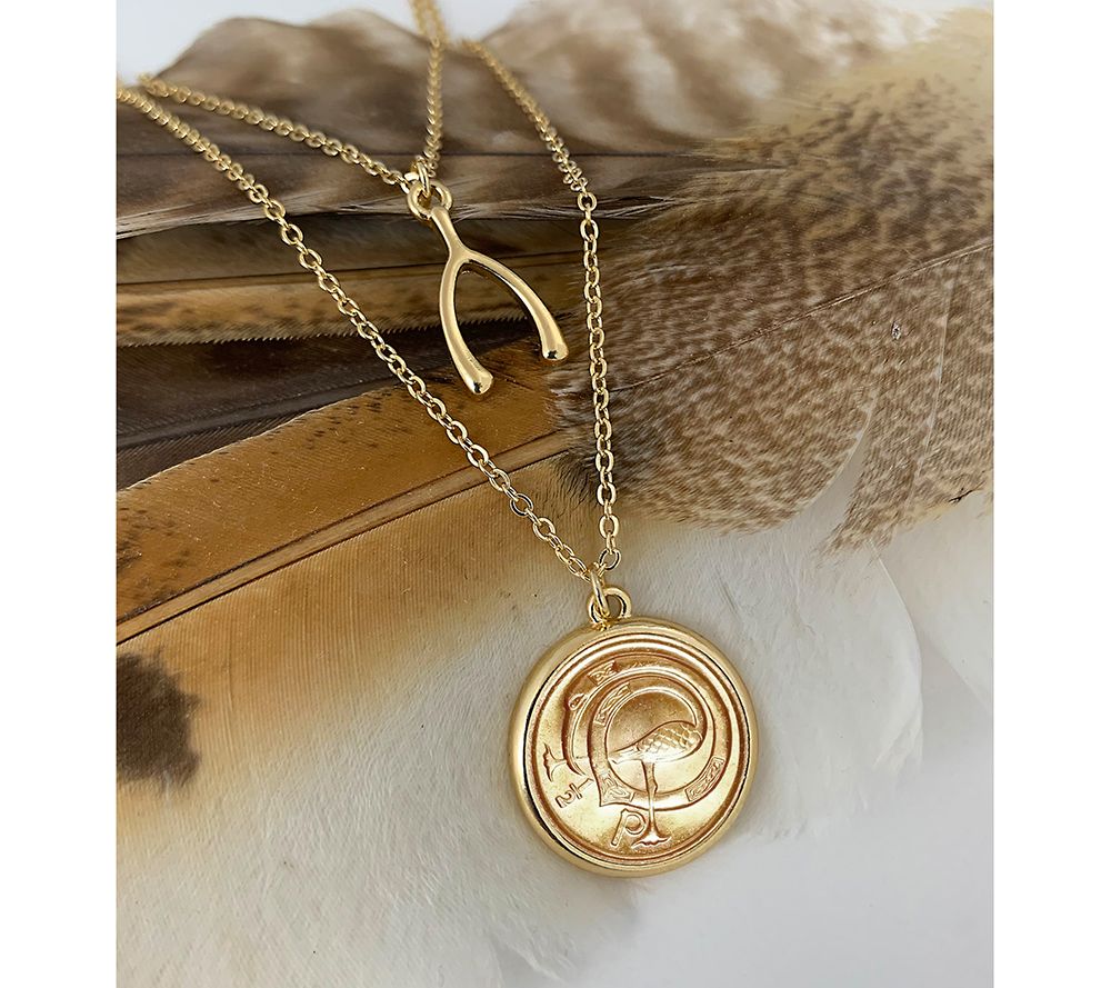 • Irish half penny coin with ornamental bird motif, double strand cable chain, wishbone charm