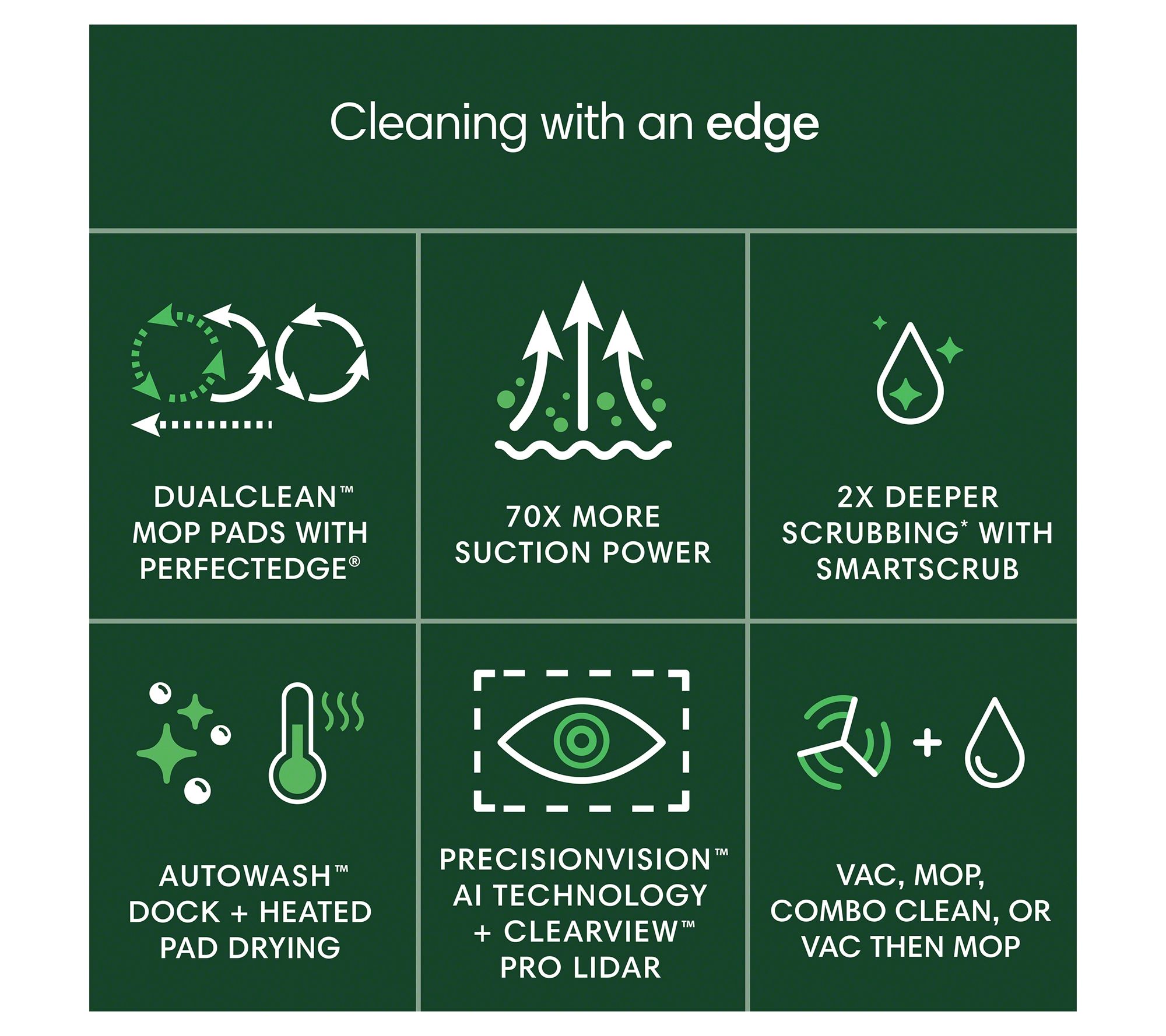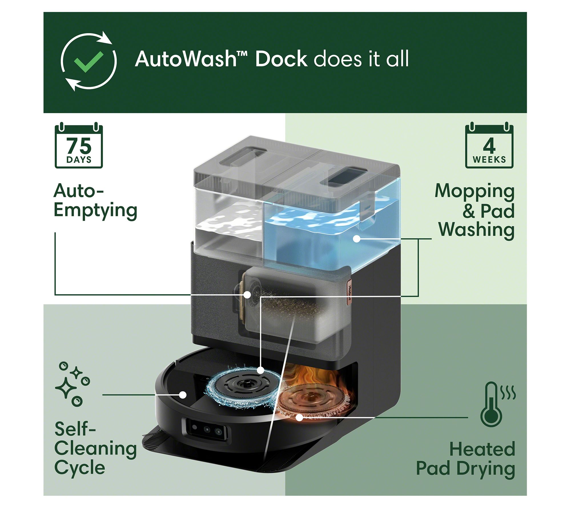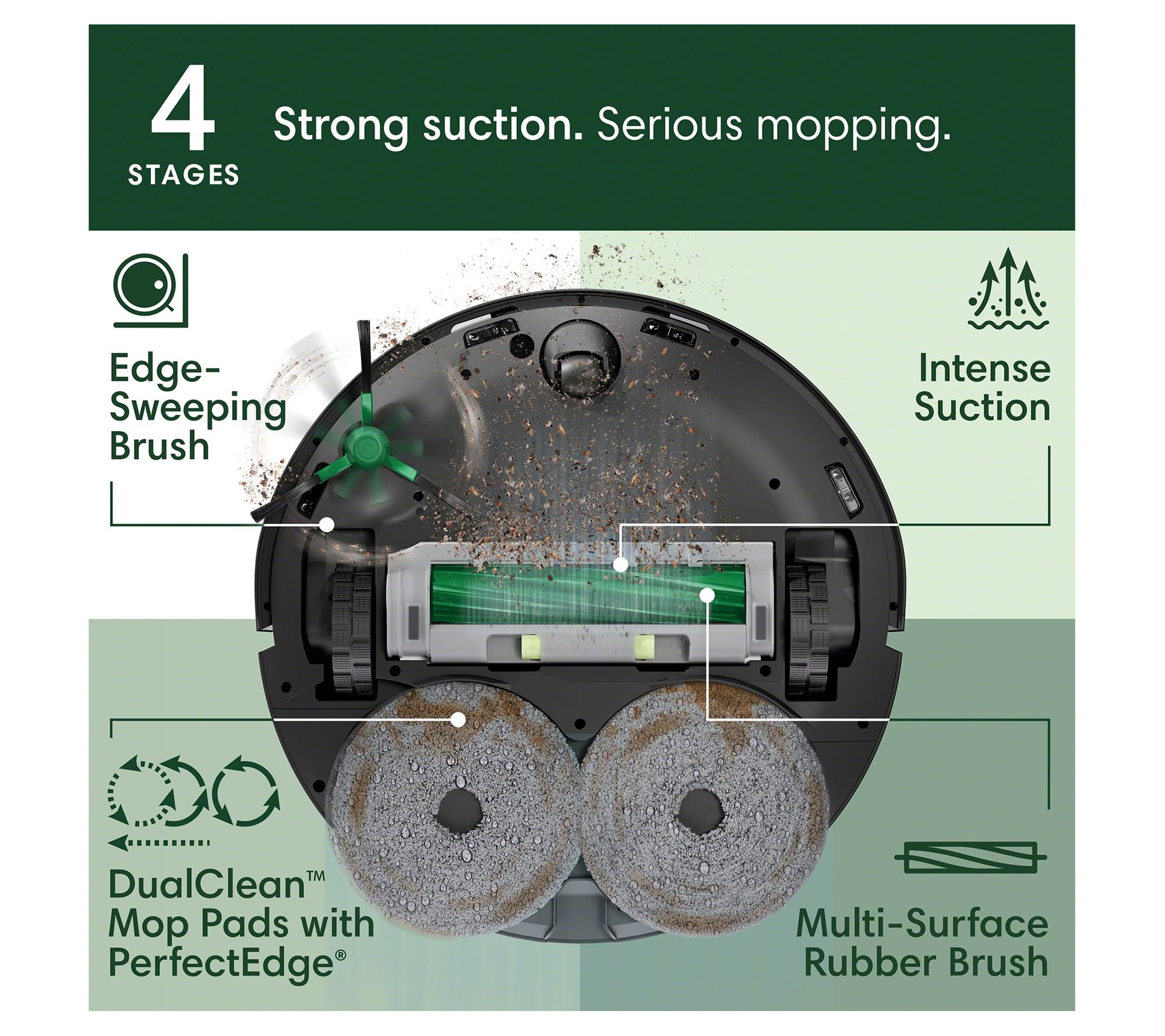 • Includes Roomba Plus Combo robot, AutoWash dock, extra AutoEmpty Bag, extra set of Dual Spinning Mop Pads, and line cord