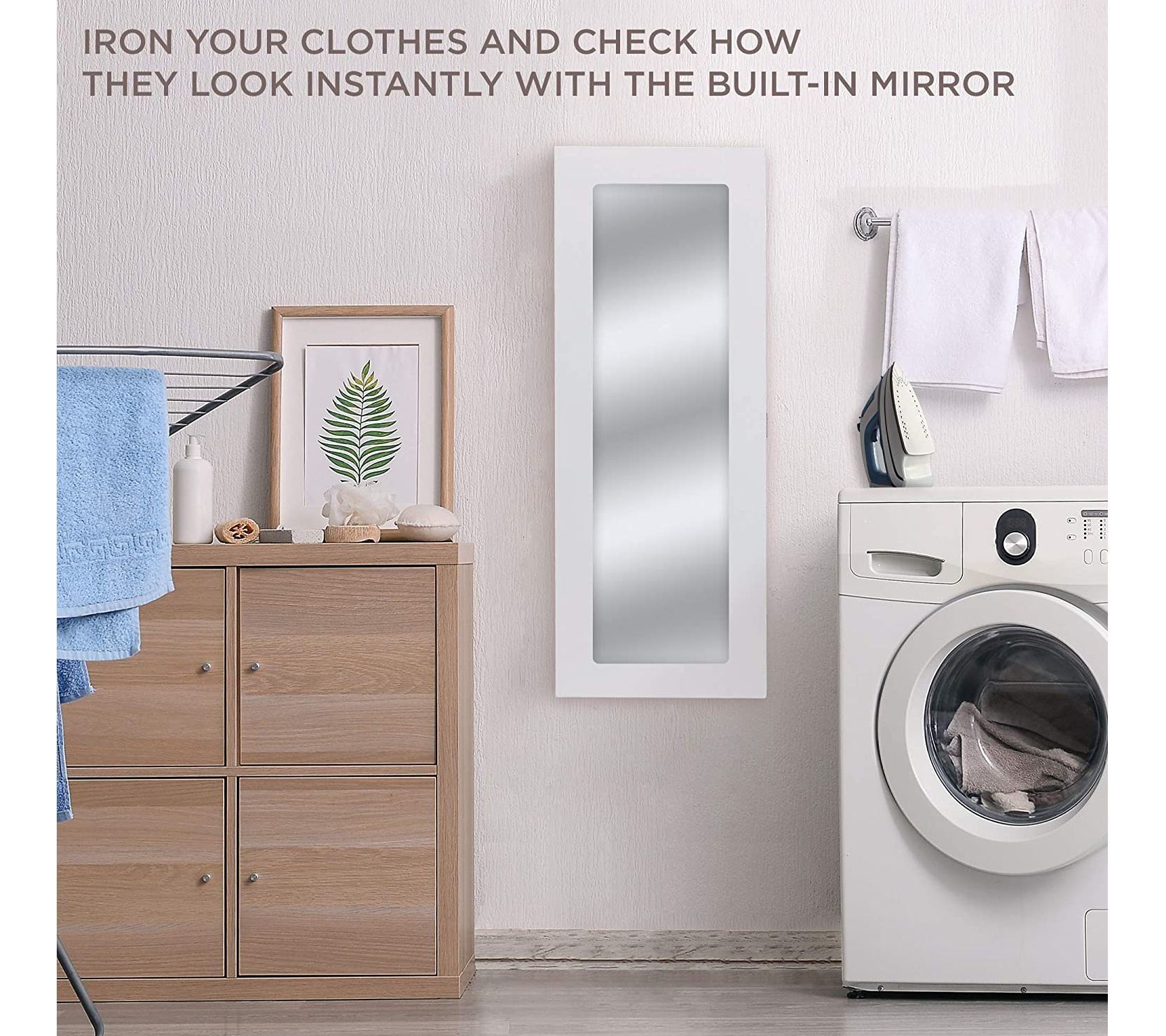 You'll love how easy it is to iron with this compact cabinet. Simply open the mirrored door of this cabinet to reveal a full-size ironing board that folds up when not in use to save space. From Ivation.