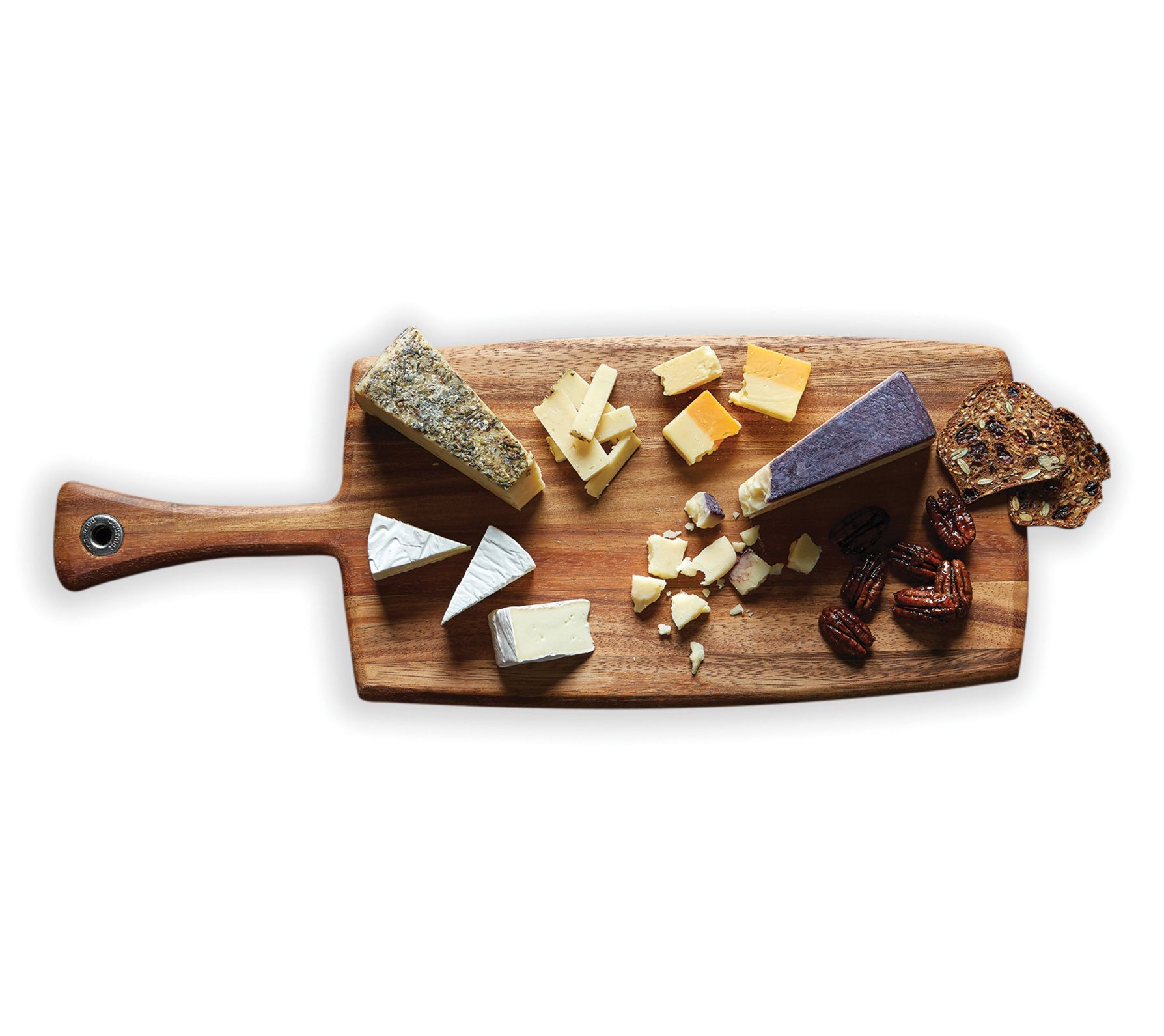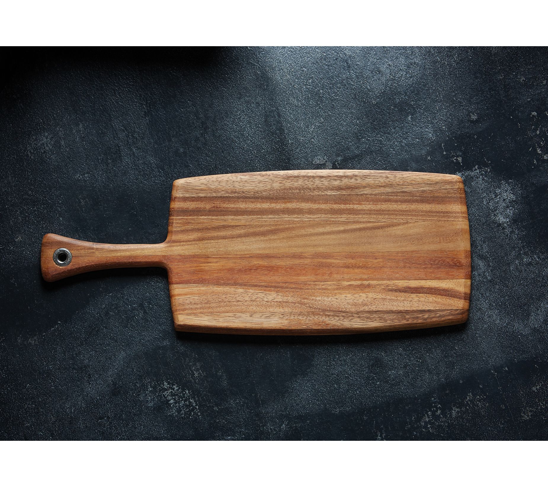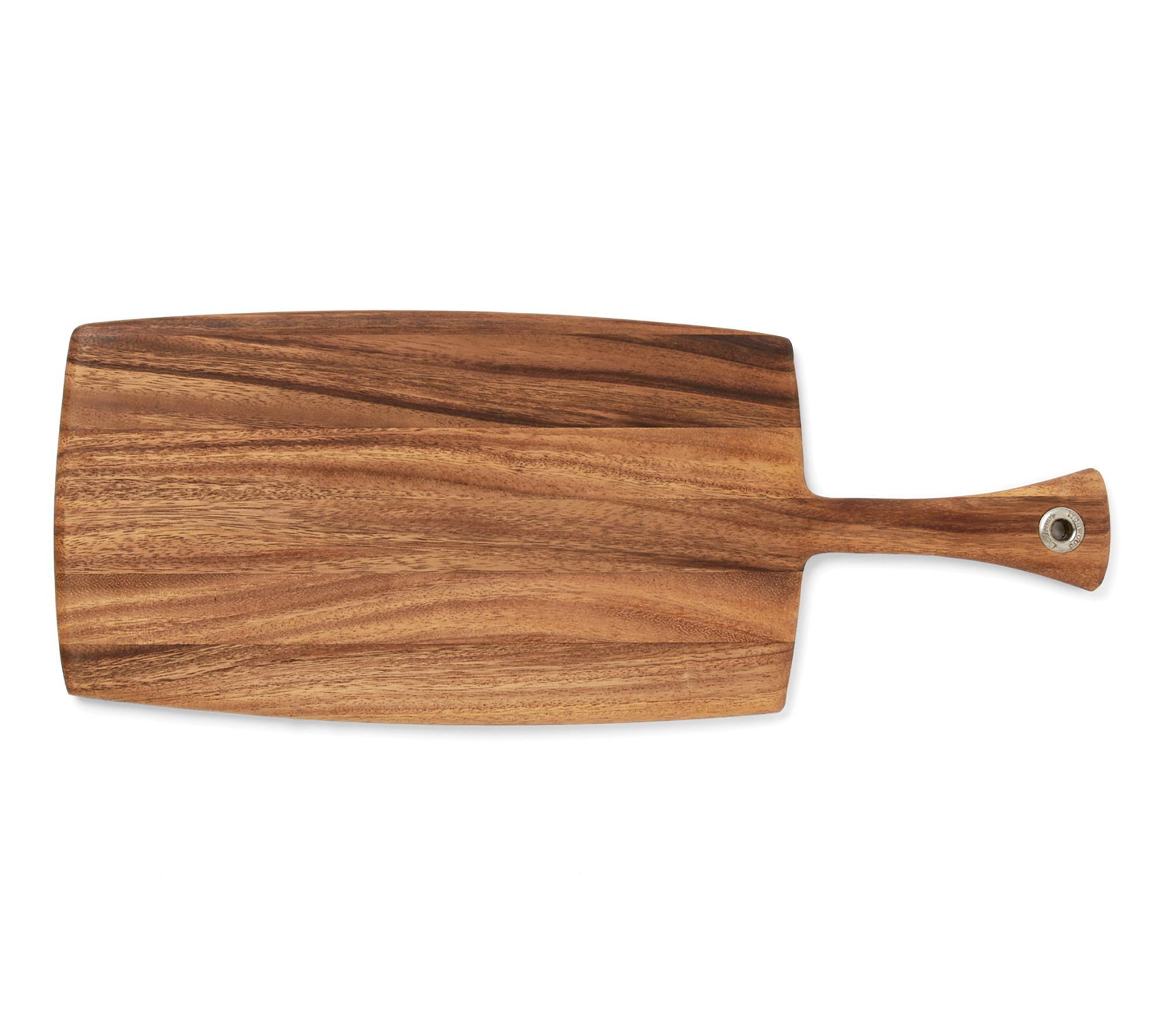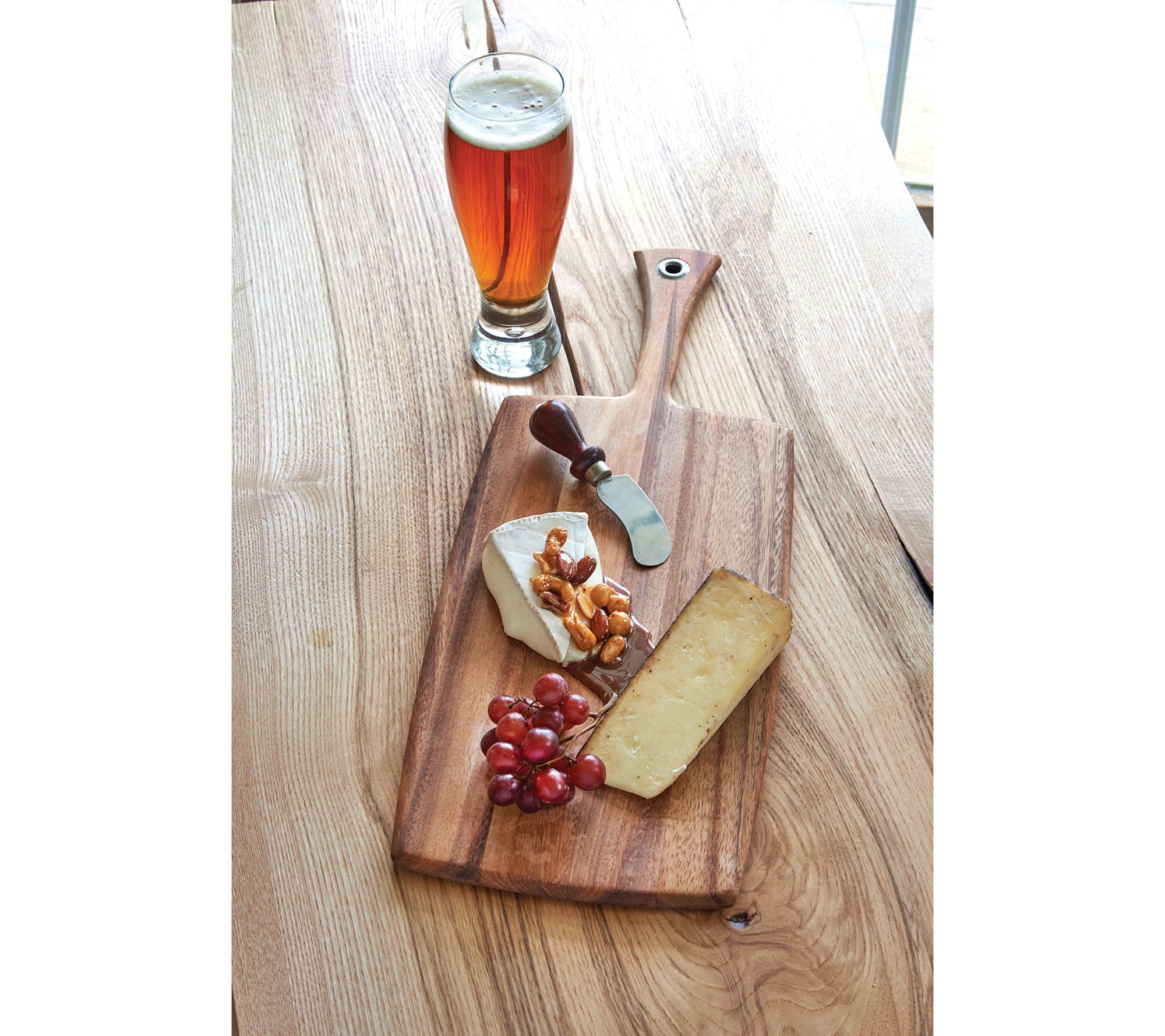Serve up style with the Ironwood large rectangle paddleboard. Crafted from gorgeous Acacia hardwood, this board is perfect for your next charcuterie display, cheese platter, or even smaller pizzas and sandwiches. The convenient grommet feature allows for easy hanging and air drying. Its reversible design lets you use one side for cutting and the other for serving, making it both functional and beautiful. From Ironwood.