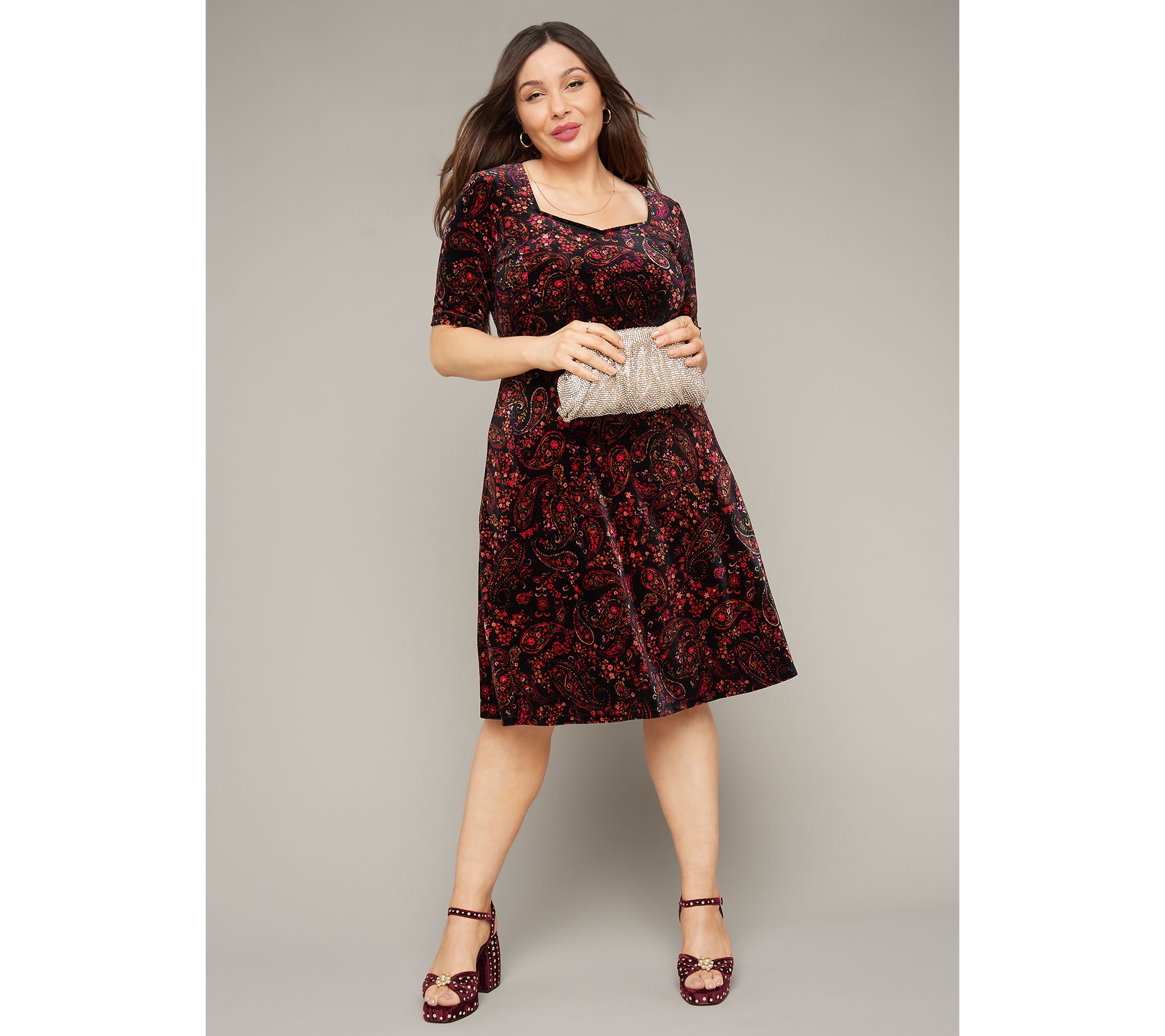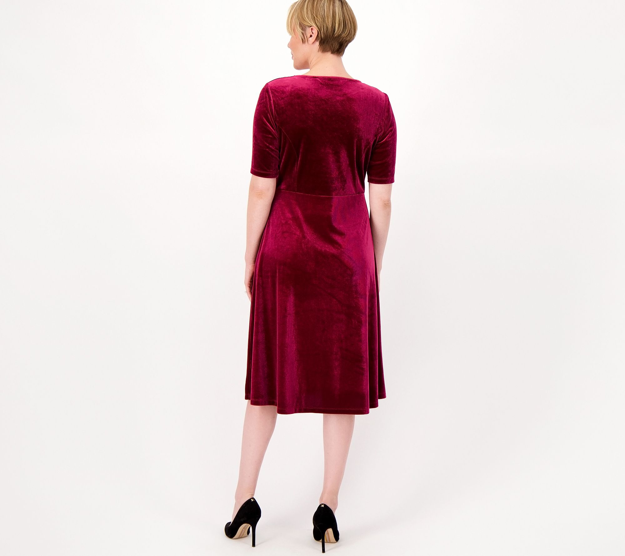 You'll feel pretty -- oh-so pretty in this velvet dress! Not only is the silhouette just heavenly, but the sweetheart neckline adds a feminine finishing touch. From Isaac Mizrahi Live!TM.