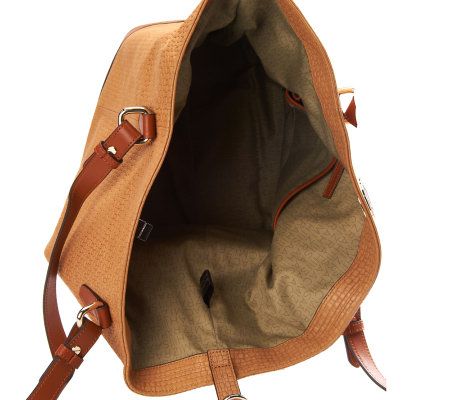 Summer lovin'. Ideal for warmer months, this large tote has a classic design and sophisticated style. The embossed basket weave leather looks and feels luxurious, the cognac trim across the bottom adds flair, and the large interior lets you carry everything you need and more. From Isaac Mizrahi Live! (TM).