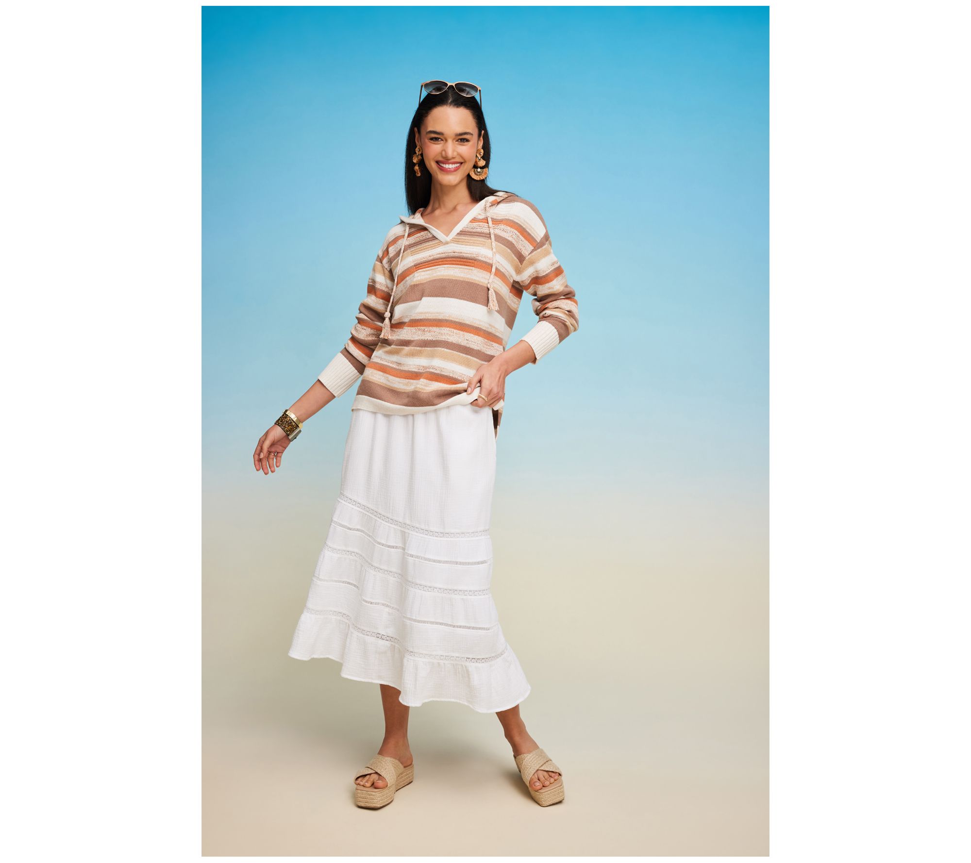 The perfect transitional style, this striped sweater is great for layering, keeping you warm on those unpredictable chilly summer nights. The hood and tassel detail are fashionable and functional whether there's a light drizzle or you're hiding a bad hair day. From Isaac Mizrahi Live!TM.