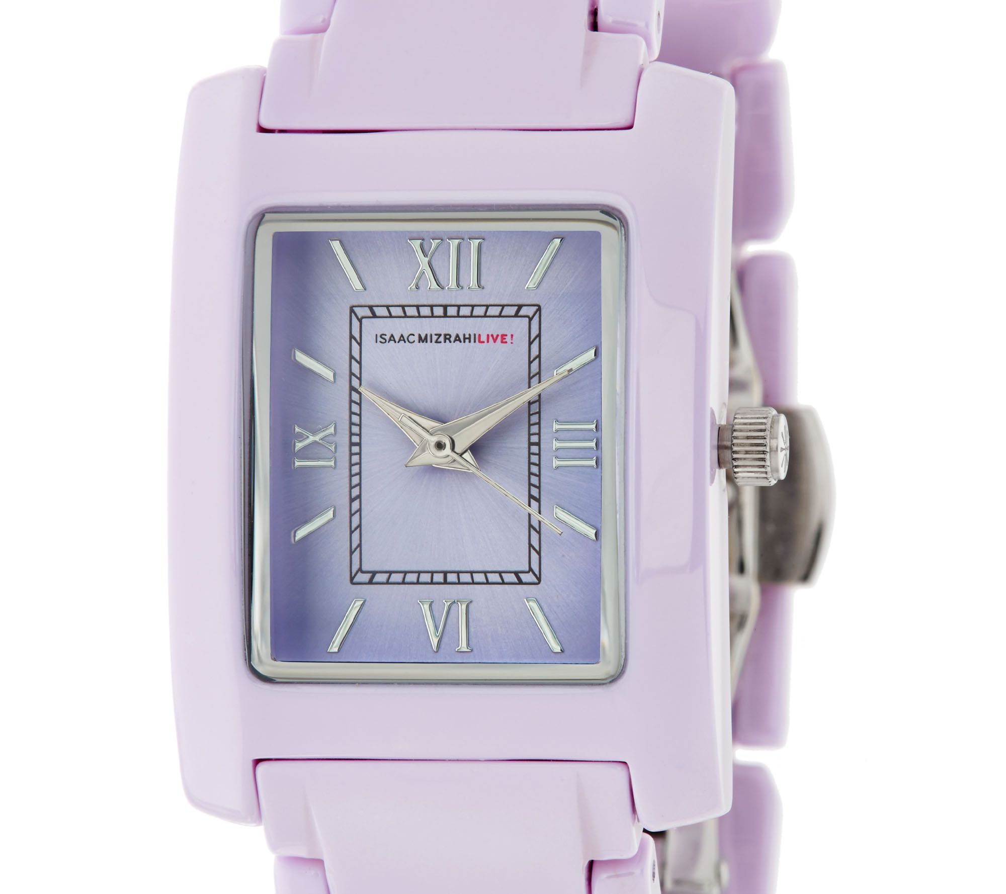 Second to none. Add this tempting ceramic timepiece from Isaac Mizrahi to your watch collection and it will quickly become a fashionable favorite. With its easy-to-read rectangular dial and stylish ceramic link band, this is a timepiece that's right on trend--and too good to let get away. From Isaac Mizrahi Live!(TM).