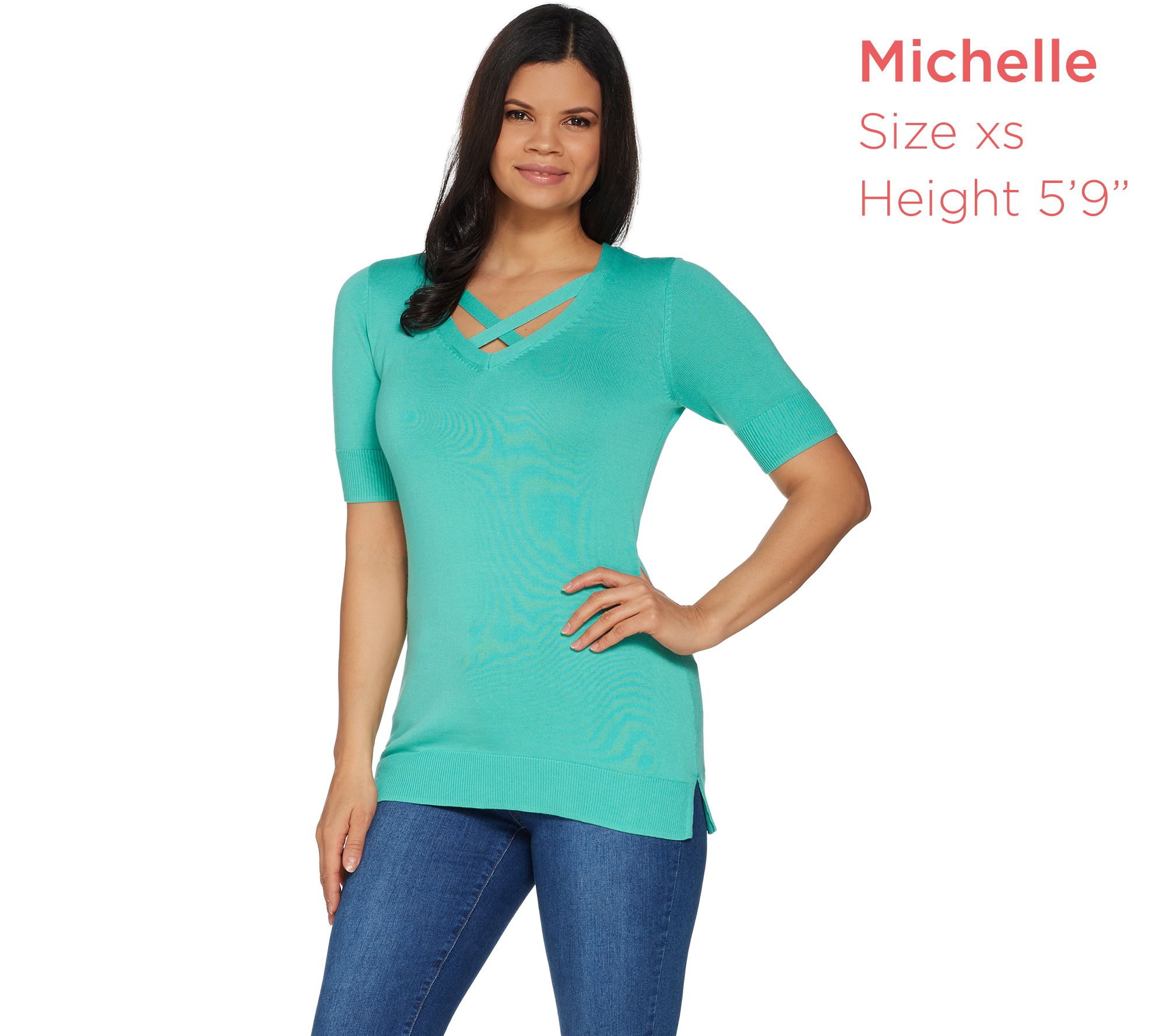 X marks the sweet spot on the V-neck of this tunic, giving an extra special edge to your entire ensemble. From Isaac Mizrahi Live!TM.