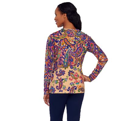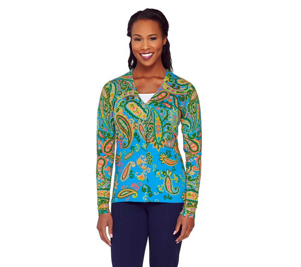 Paisley to match your persona. Bubbly and beautiful, this Isaac Mizrahi cardigan has an engineered paisley print that bursts from the fabric. Whether you want to button up or leave it open, this cute cardigan has your name written all over it. From Isaac Mizrahi Live!(TM).