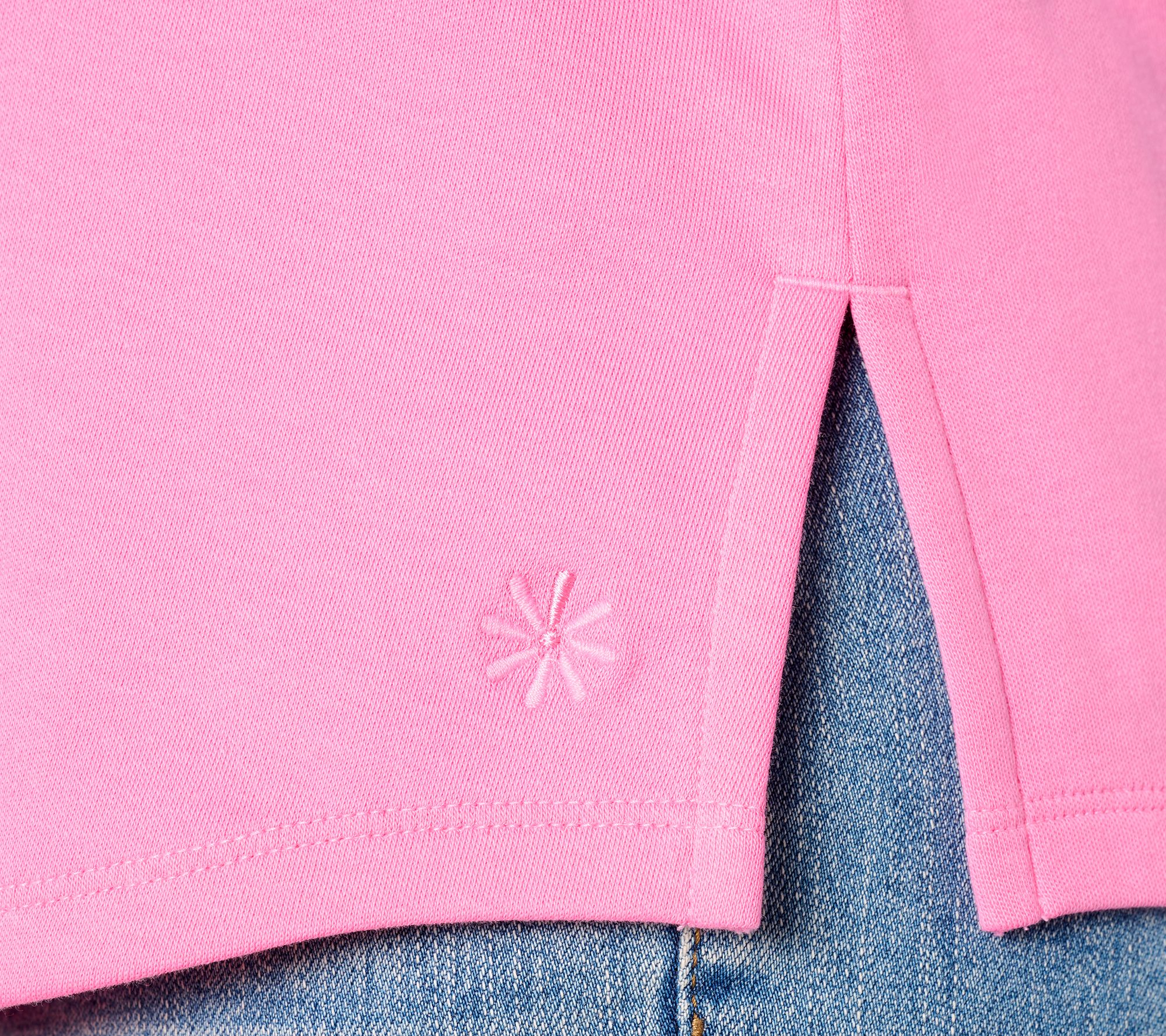 Features: V-neckline, sleeveless, raised back neck, curved bottom hem with side slits, embroidered daisy logo