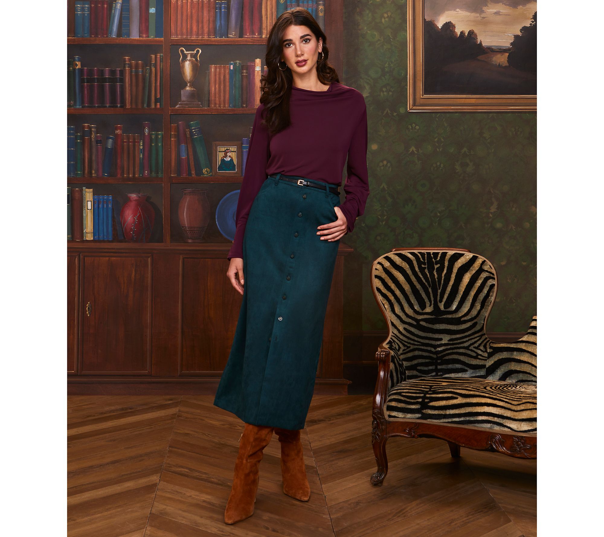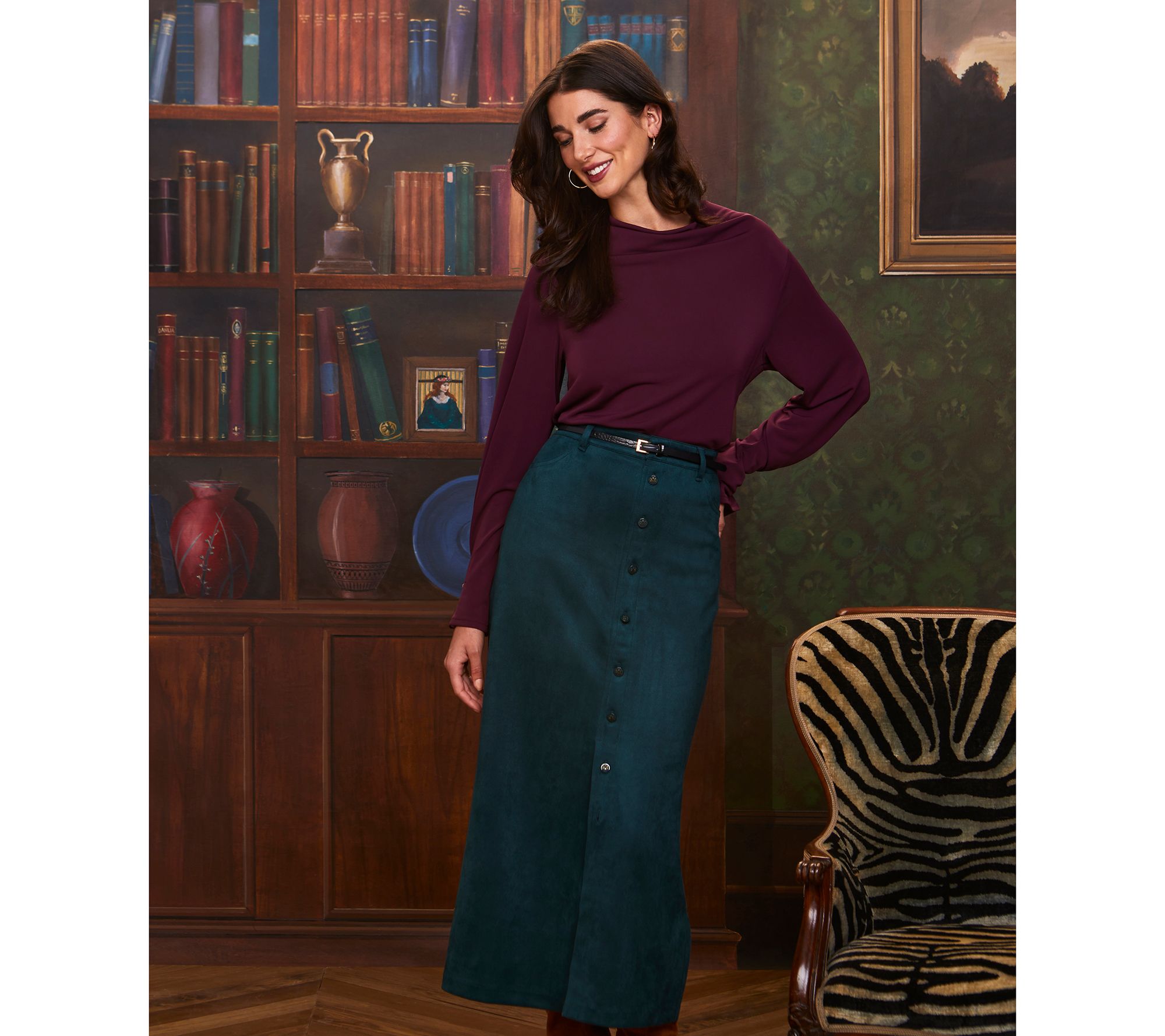 Features: cowl neckline, long sleeves with goldtone buttons, straight hem