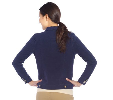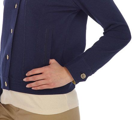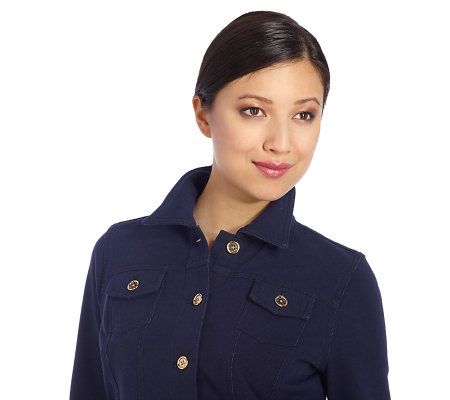 Fabulous in every way. Make your style stand out by pairing this knit denim jacket with a floral skirt or your favorite slacks. A button-down front and pointed collar sharpen the look to perfection. From Isaac Mizrahi Live!(TM).
