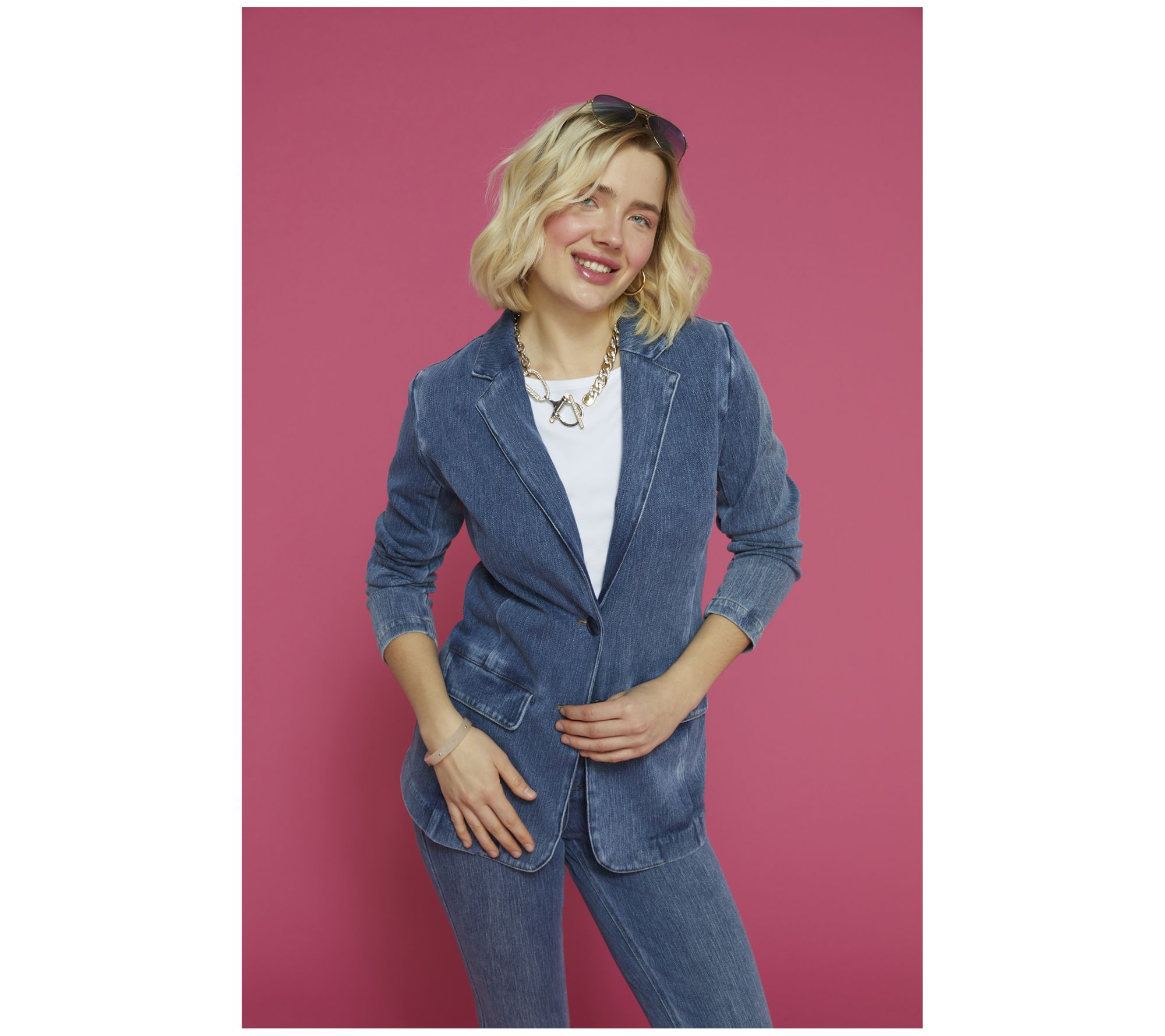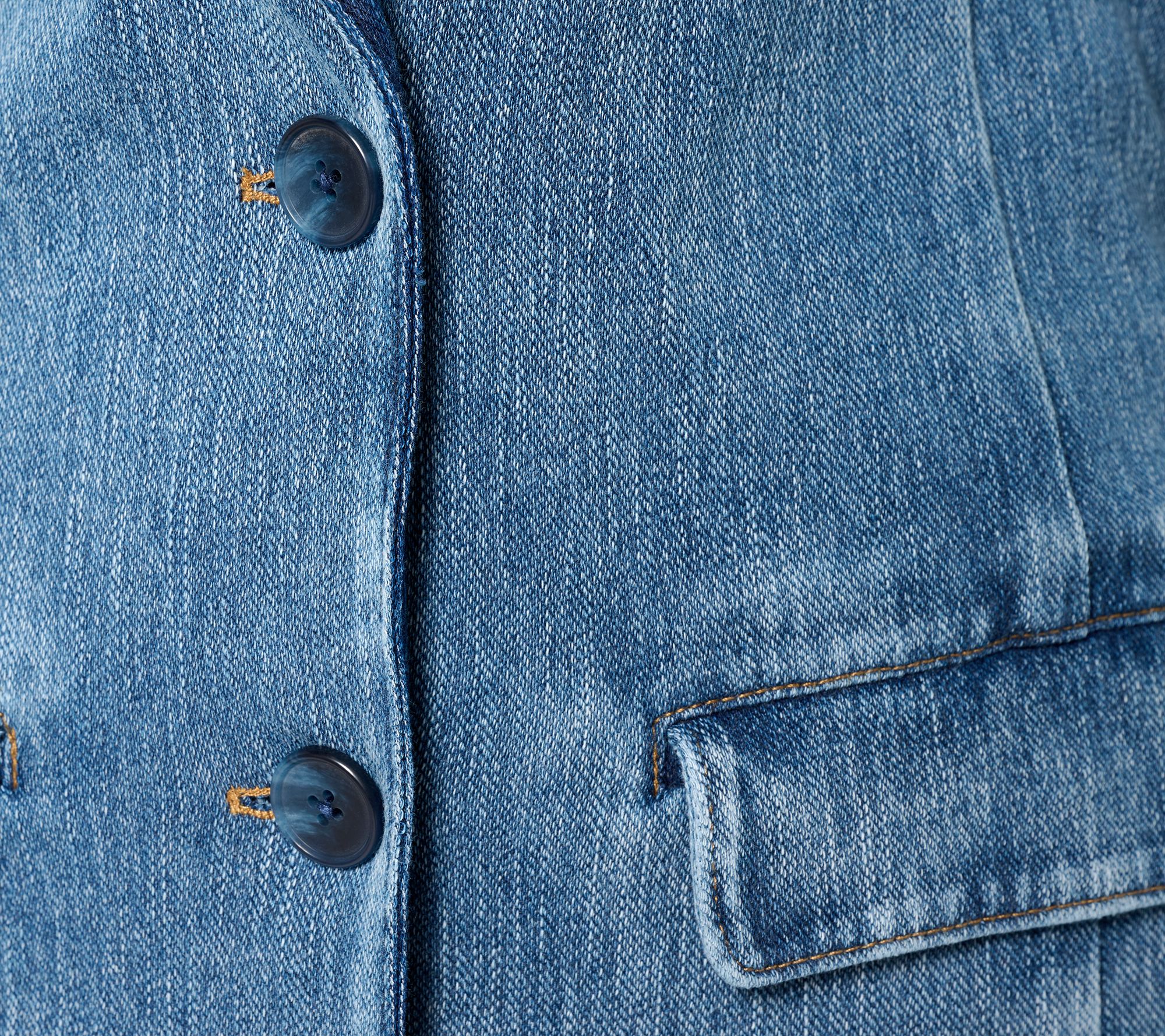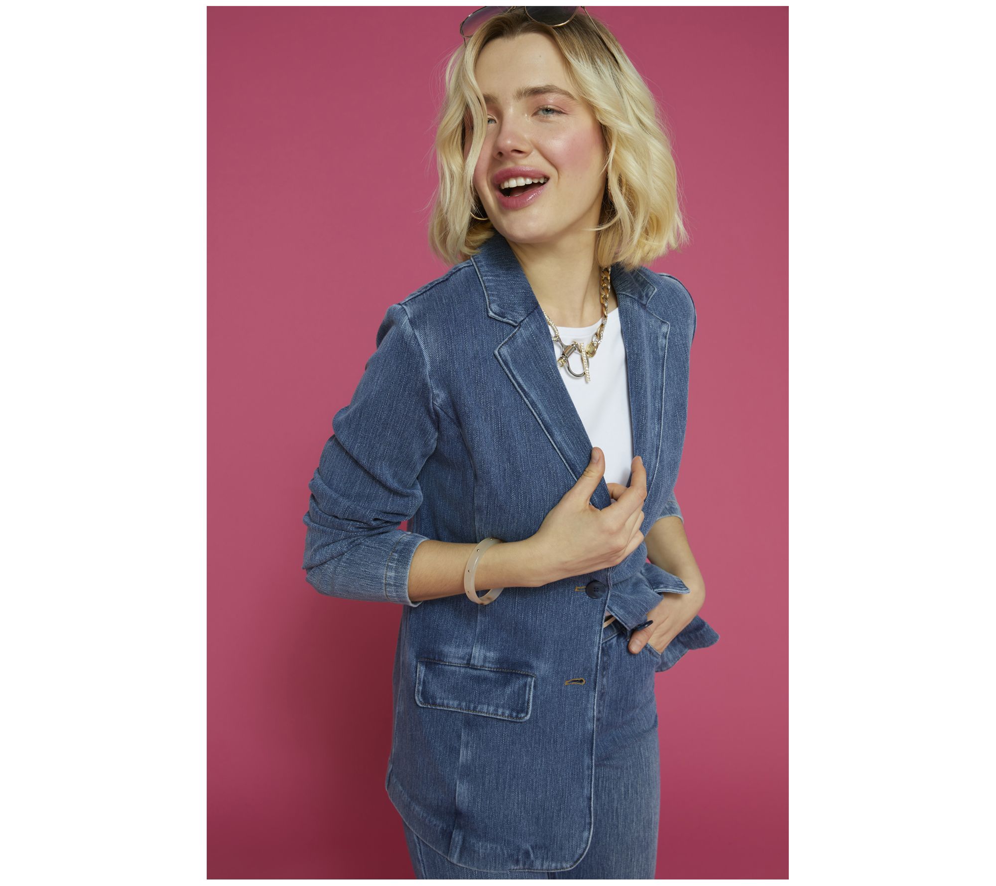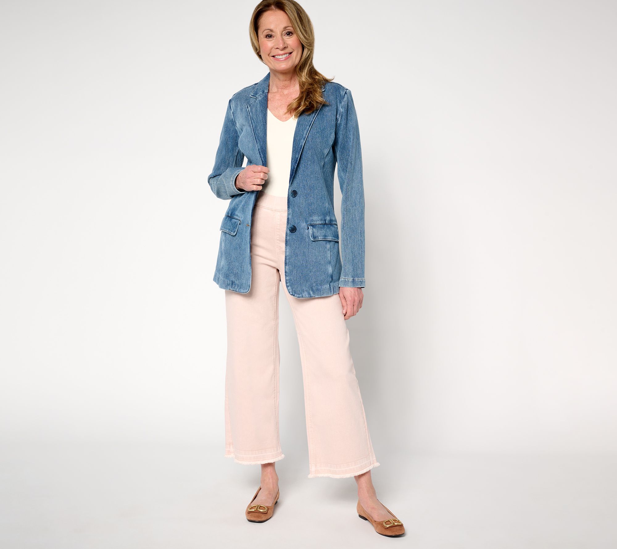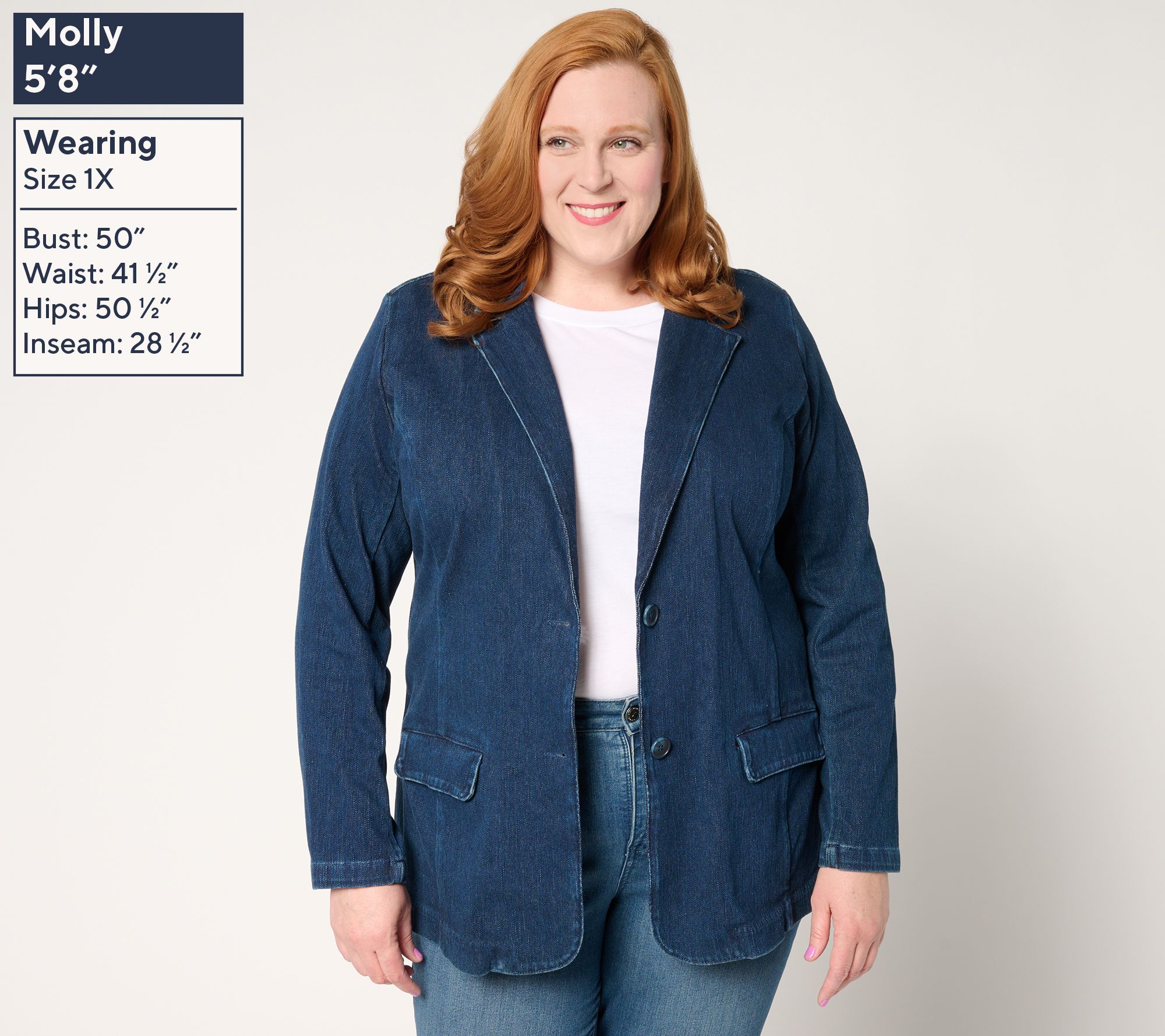 A classic tailored silhouette in a laid-back fabrication, this denim blazer brings an edgier vibe to any outfit, while keeping you looking polished and professional. From Isaac Mizrahi Live!TM