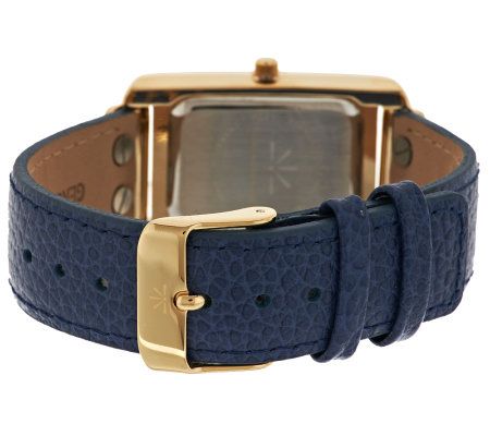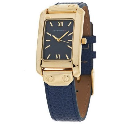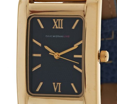 Rich and refined. A handsome goldtone rectangular case and leather strap make this timepiece one for the ages. The dial coordinates beautifully with the leather strap. From Isaac Mizrahi Live!(TM).