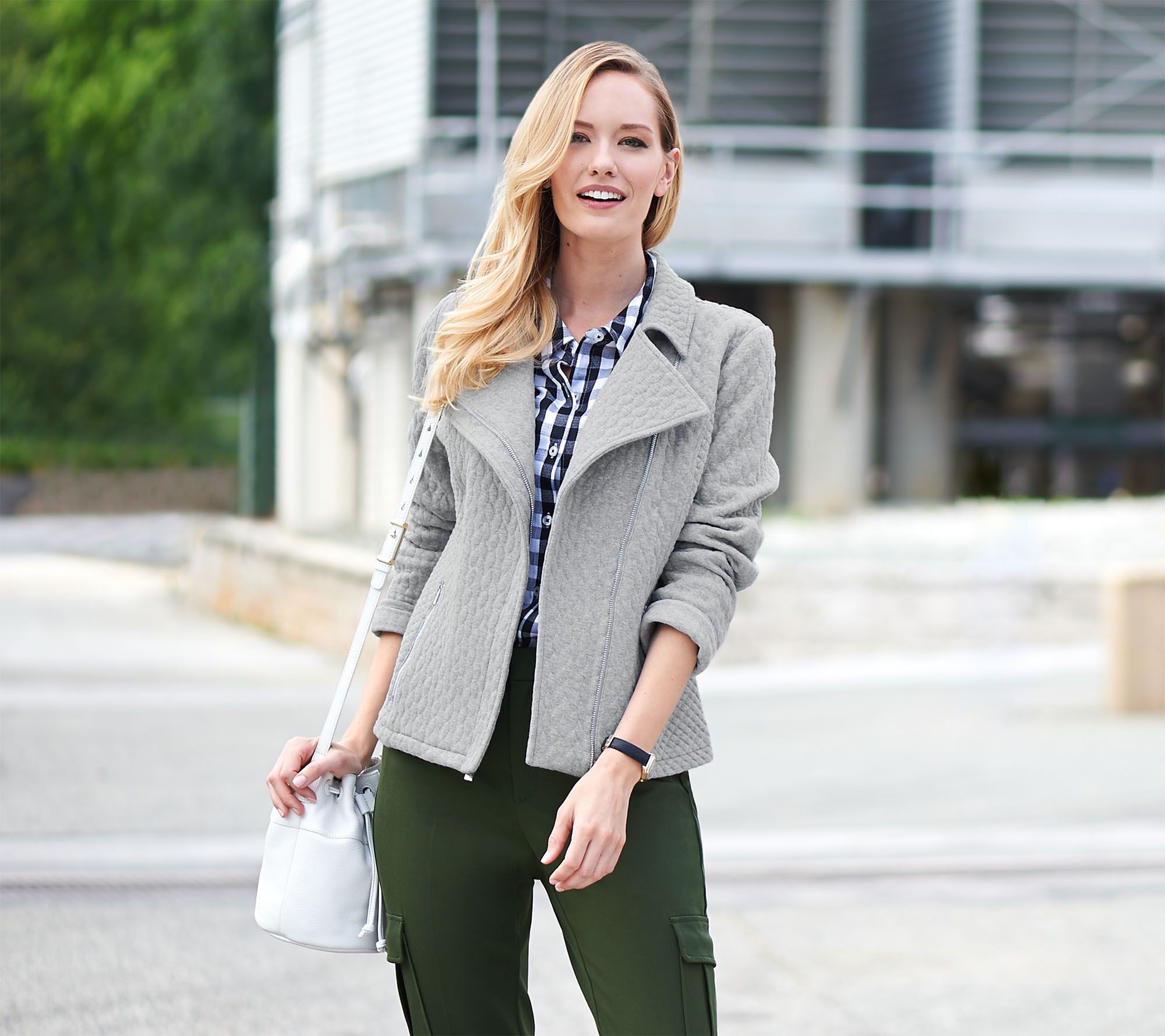 Born to be styled. Modern and classic intersect in this motorcycle jacket by Isaac Mizrahi. An asymmetrical zipper and a mix of quilted patterns perfect its edgy elegance, while princess seaming and a back waist seam lend a figure-flattering fit. From Isaac Mizrahi Live!(TM).