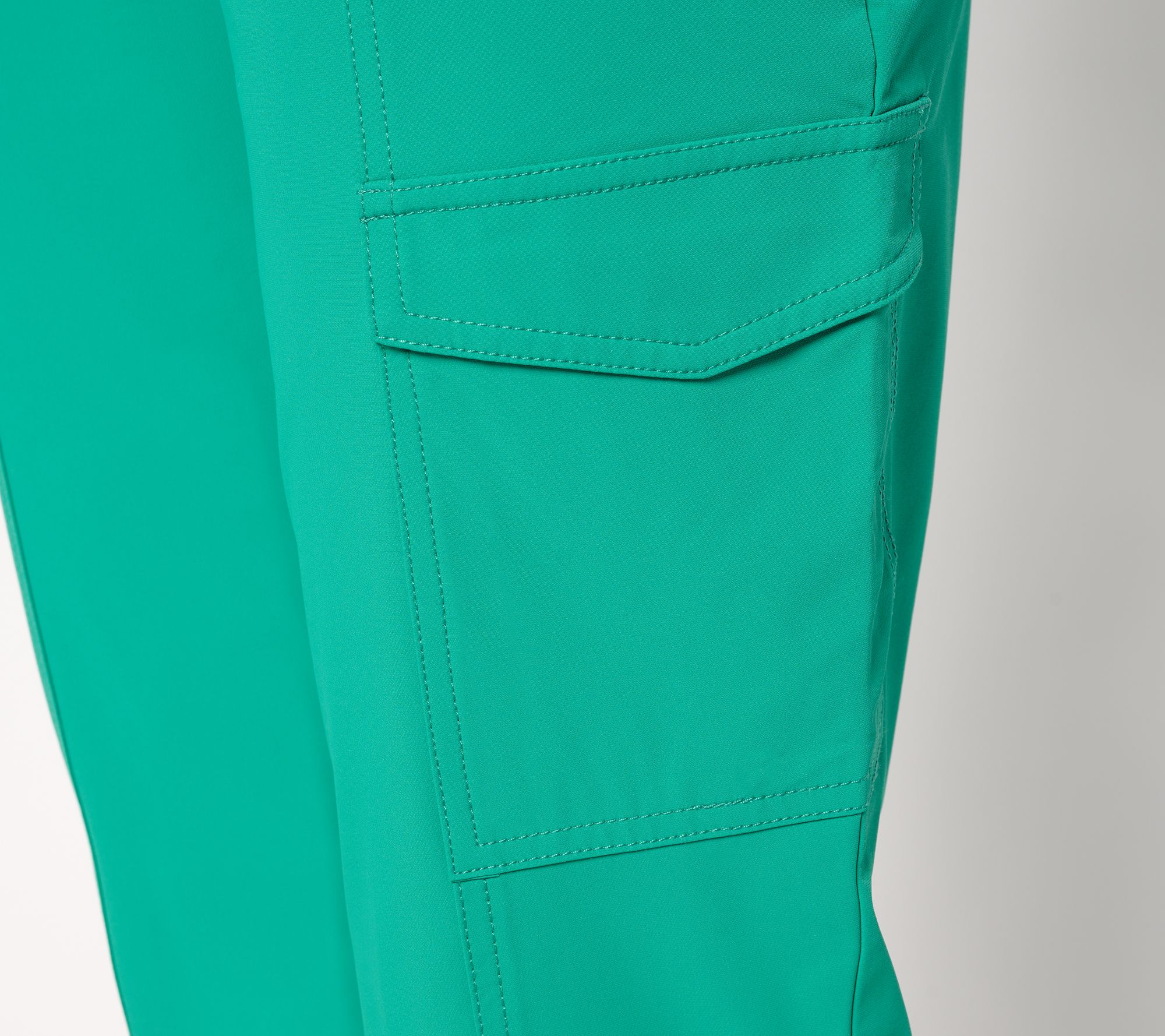 Features: pull-on style, front slash pockets, faux back welt pockets, flap patch pocket on wearer's left leg, seam at center front leg, ankle length