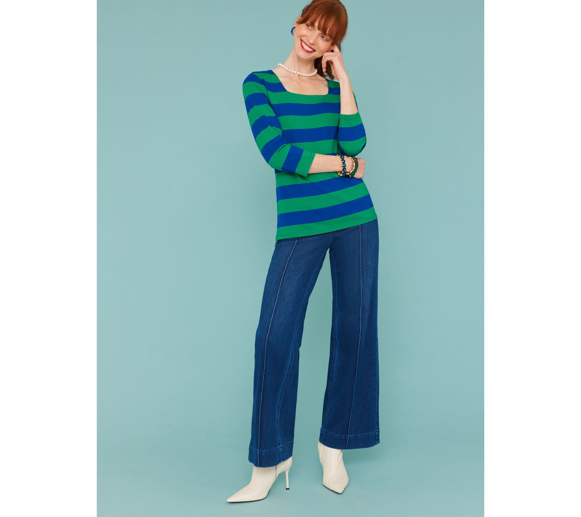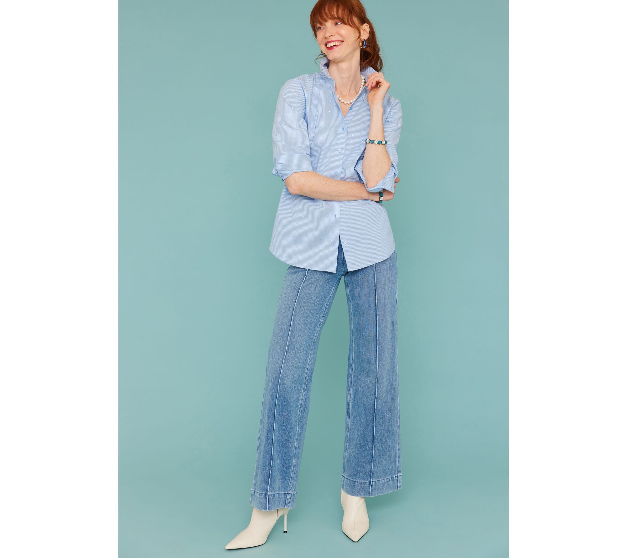 Your new favorite pants have landed. These knit trouser jeans from Isaac Mizrahi feel effortlessly chic and endlessly pair-able (think: tees and sneakers, blouses and heels, blazers and boots). And thanks to an interior cross-stitched apron that helps smooth at the front, the wide-leg style is as all-day flattering as it is comfortable. From Isaac Mizrahi Live!TM.