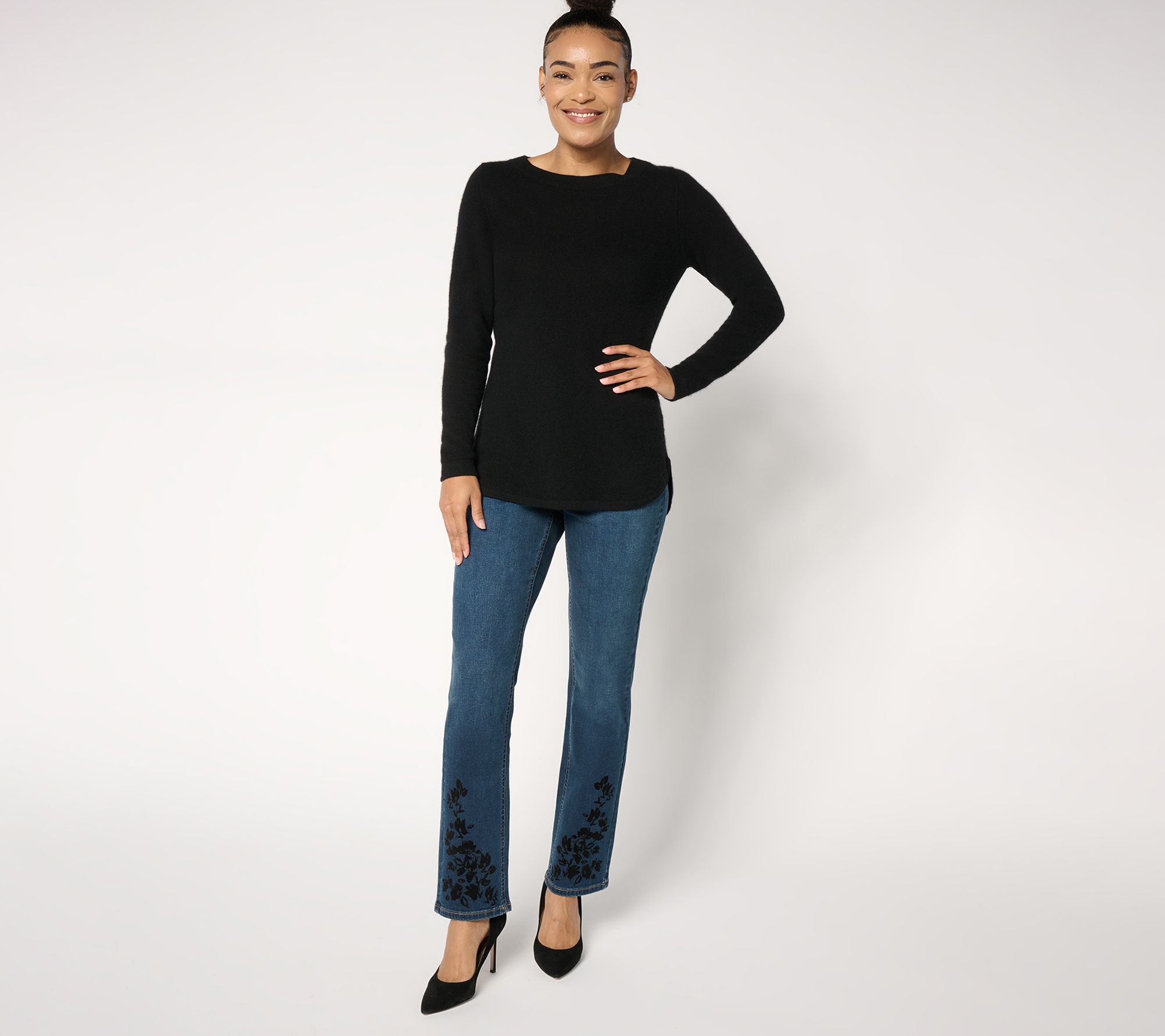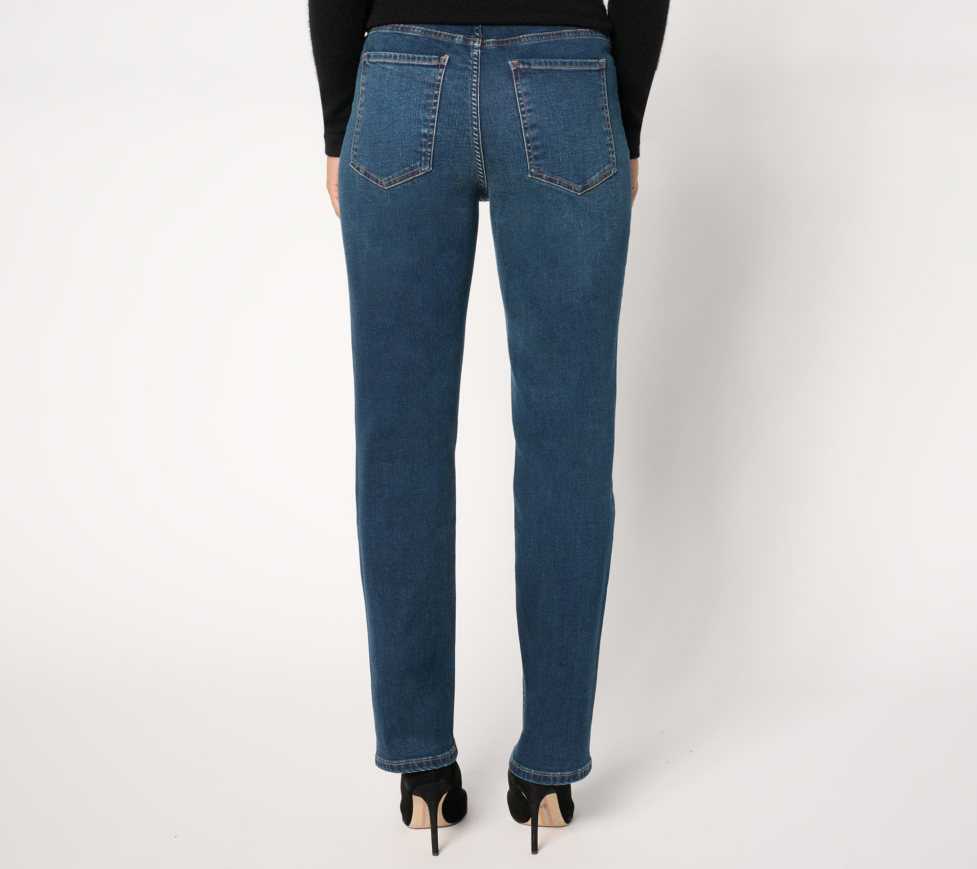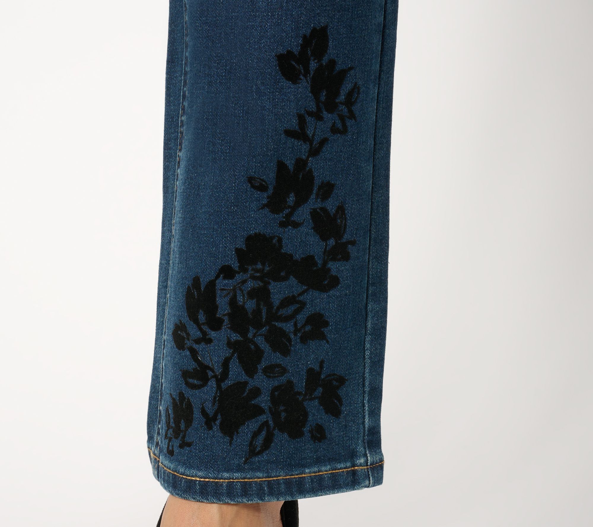 Looking to land the pefect pair of jeans? Zero in on this fresh Isaac Mizrahi design! Crafted in cotton-rich True Denim with a built-in smoothing panel across the tummy (who doesn't love that?!), these sleek, straight-leg must-haves grab tons of attention for their flattering fit -- and a certain special feature. Just look down -- the flocked embellishment at the bottom leg elevates your denim game in an instant, allowing this casual foundation to make appearances where denim never dared to go. From Isaac Mizrahi Live!TM.