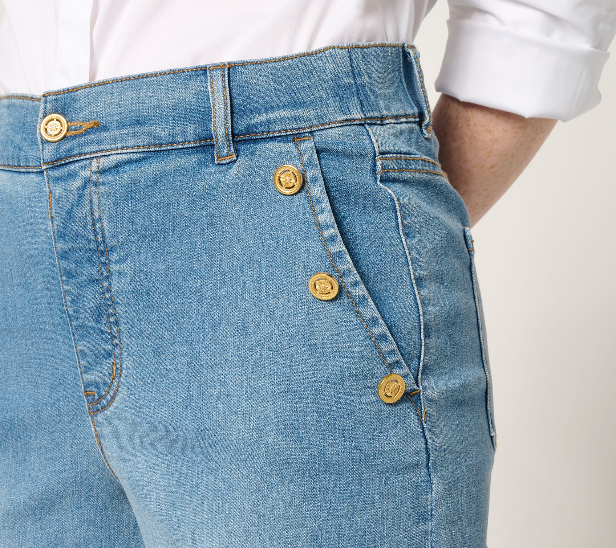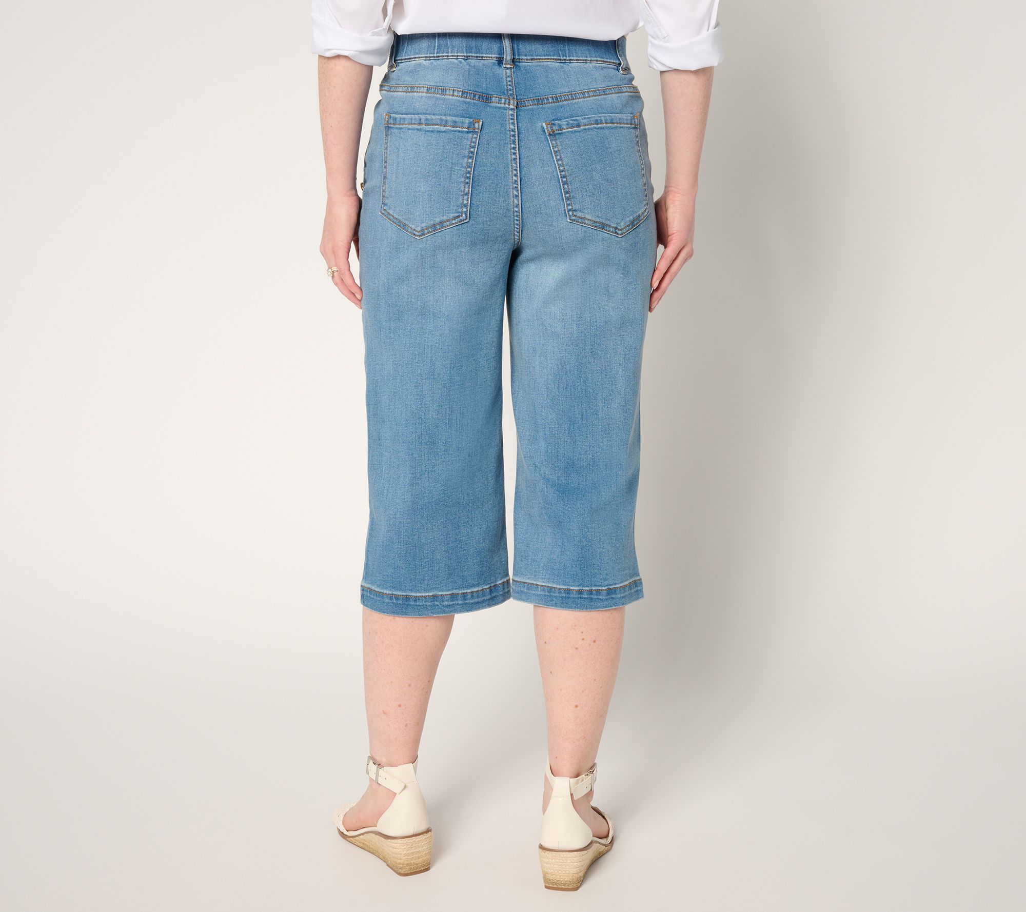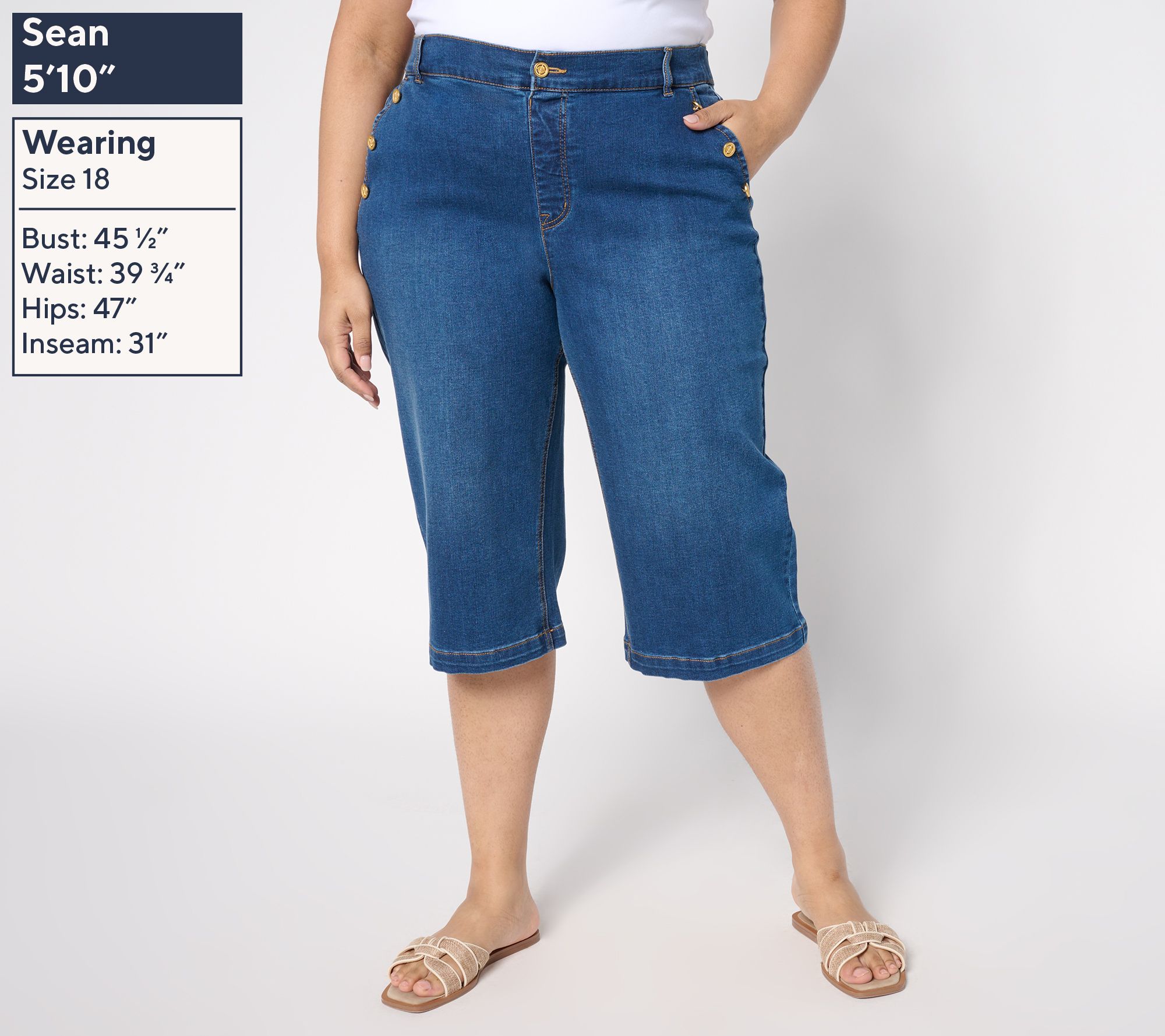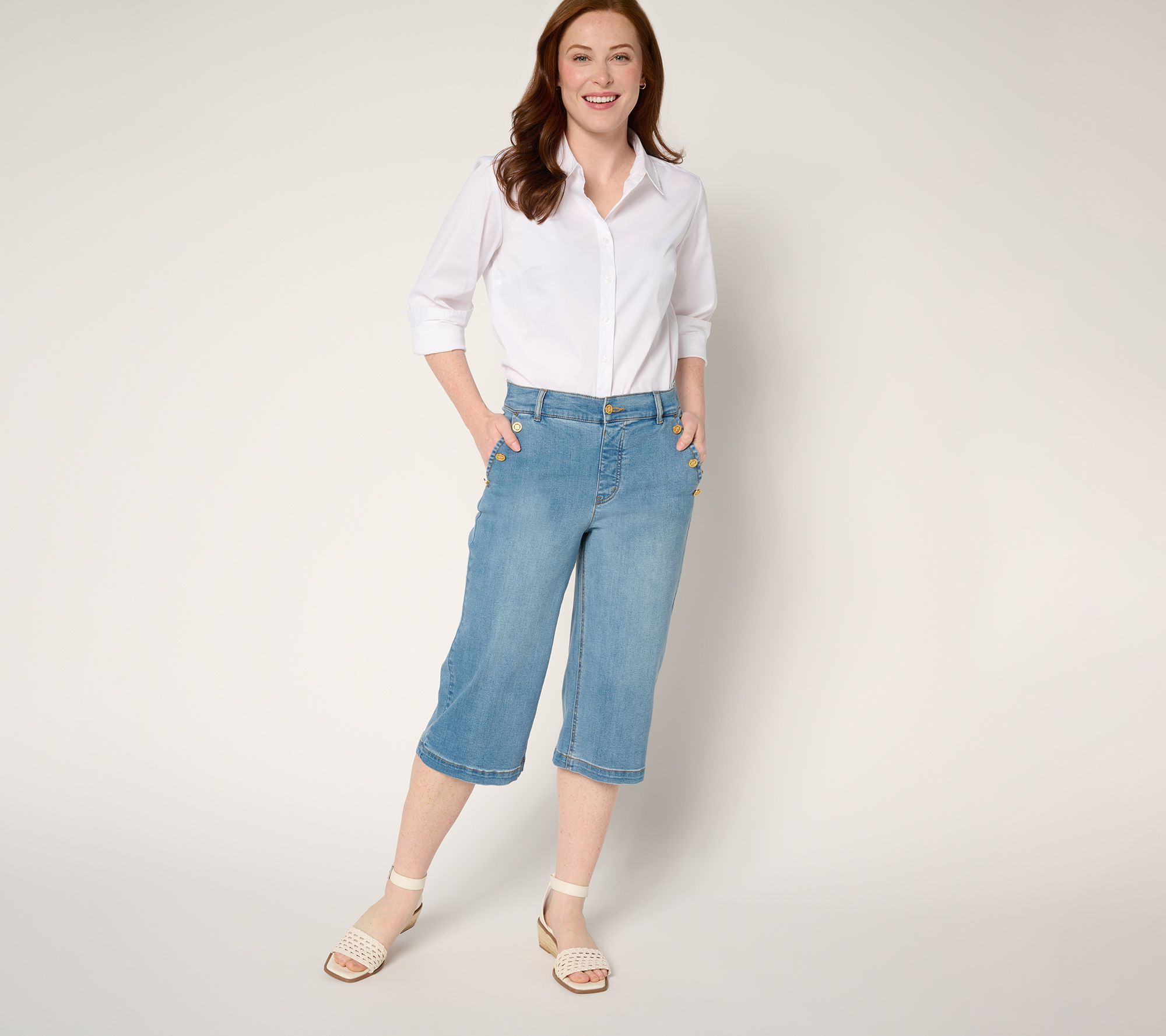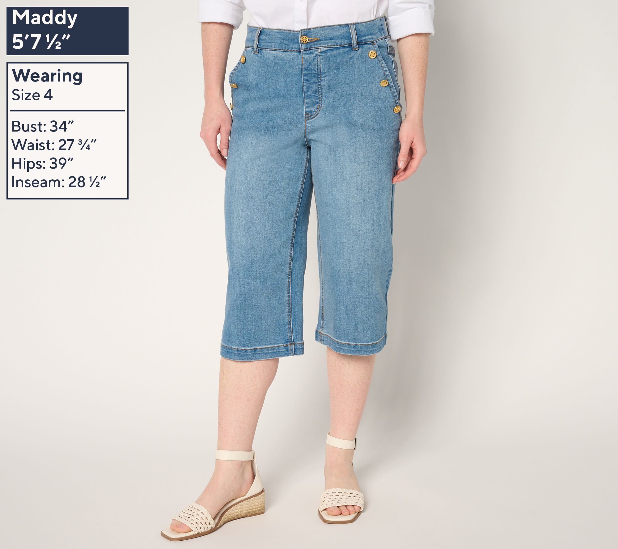 Nautical vibes. Sail through the season in these denim pedal pushers with a breezy wide leg and high-shine button details. Shorter than a crop but longer than shorts, the on-trend design is a practical alternative when you're seeking coverage and an ultra-polished presentation. From Isaac Mizrahi Live!TM.