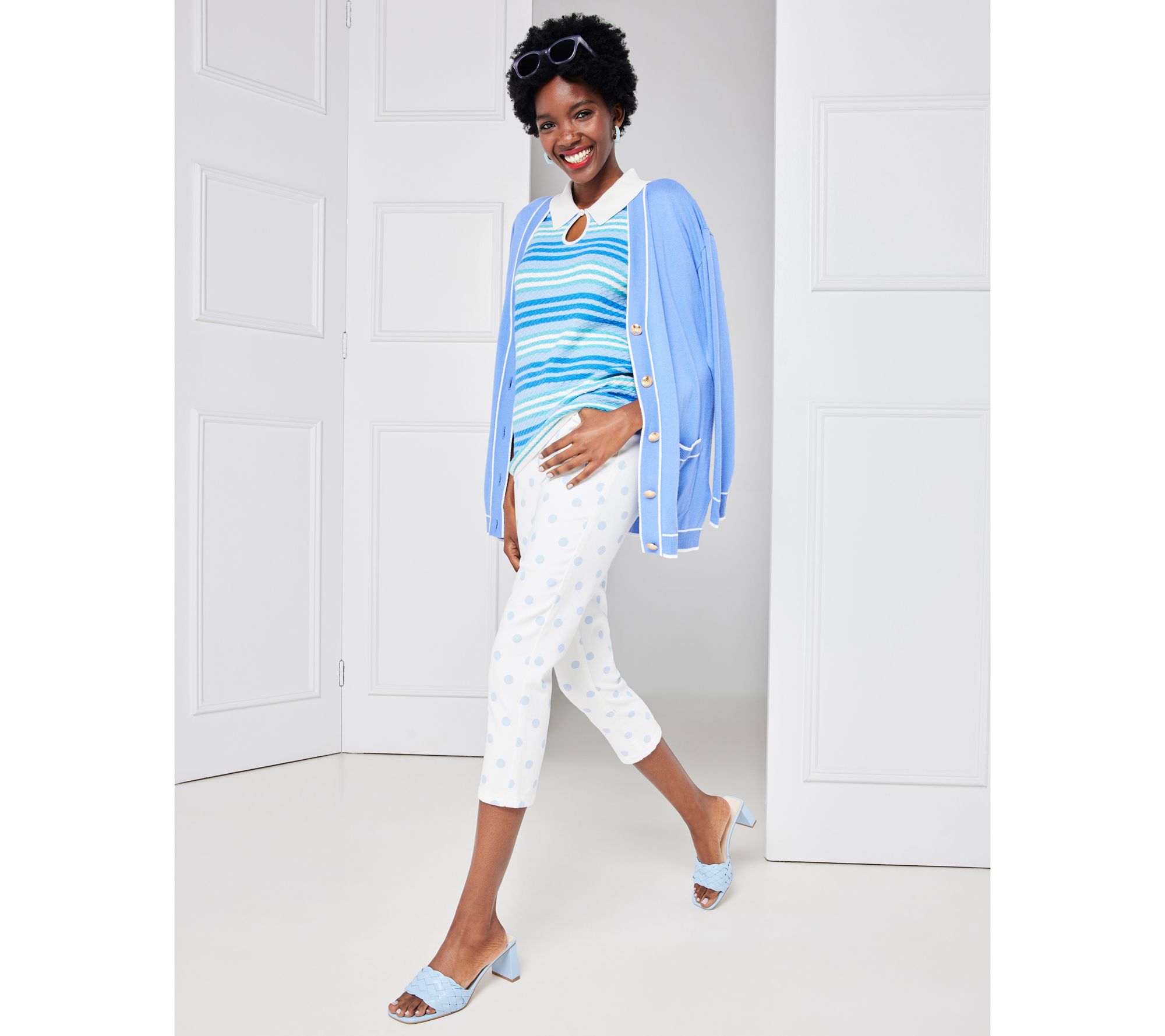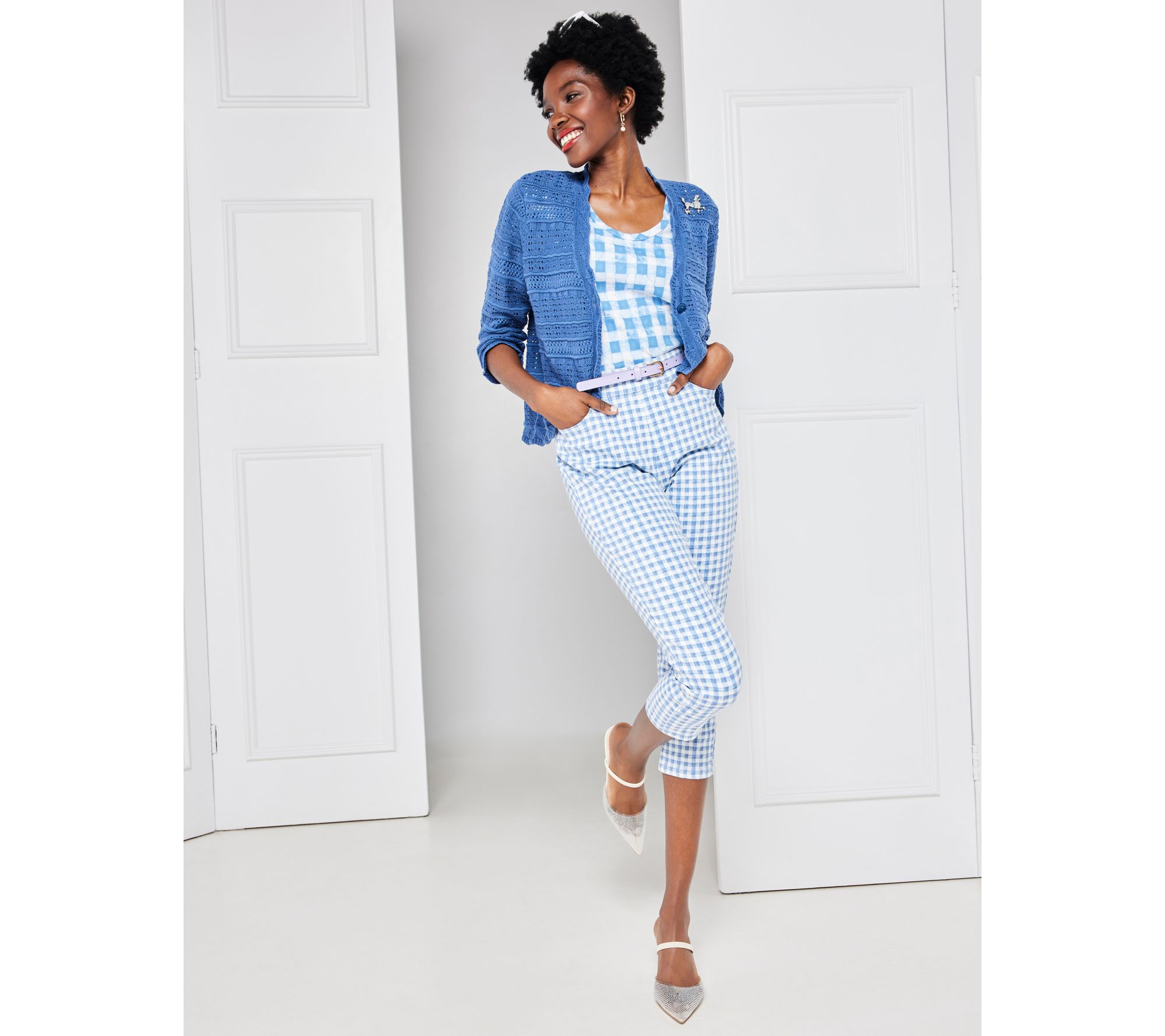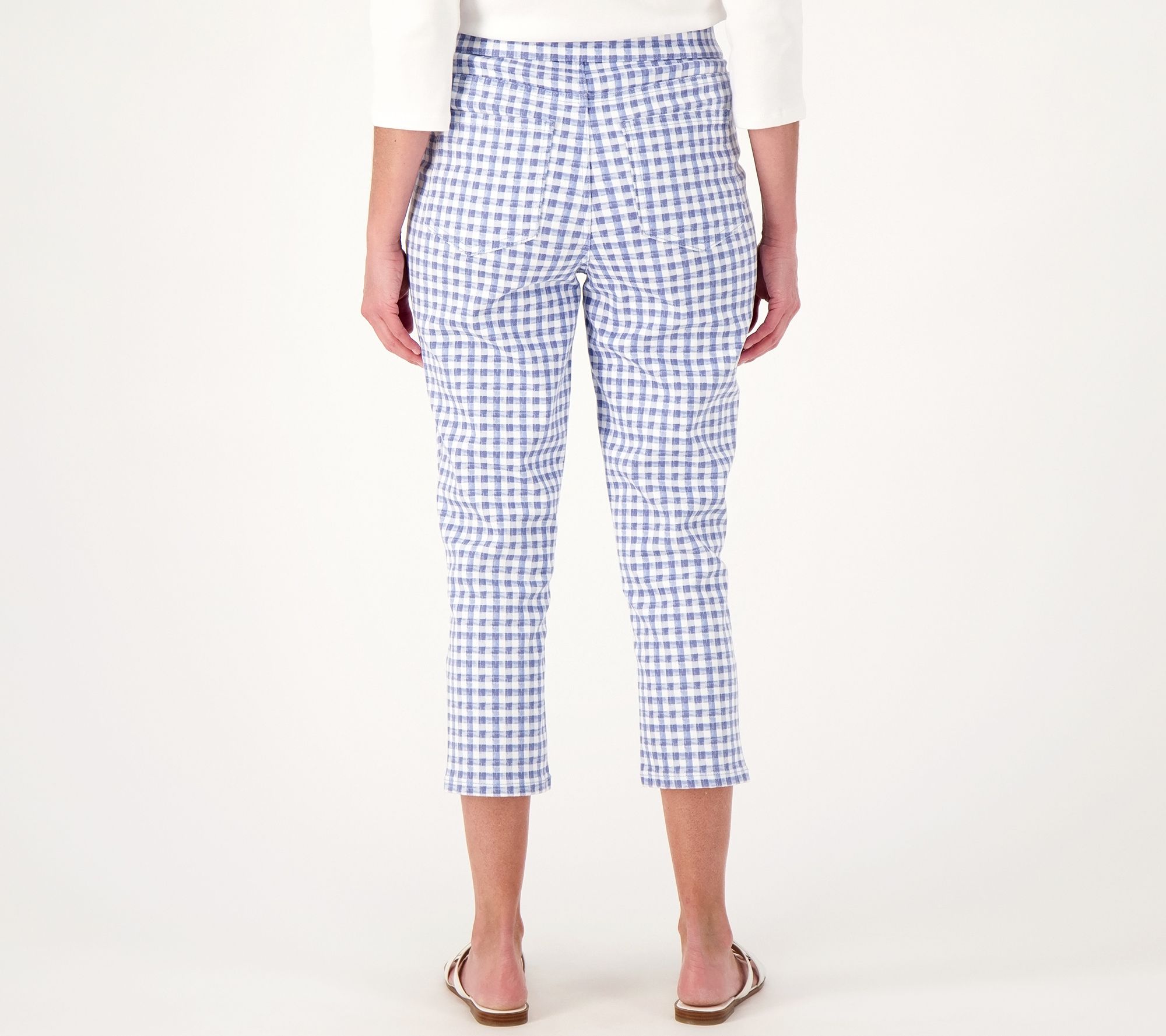 Welcome the warmer weather with these pull-on crop jeans with a sweet print.