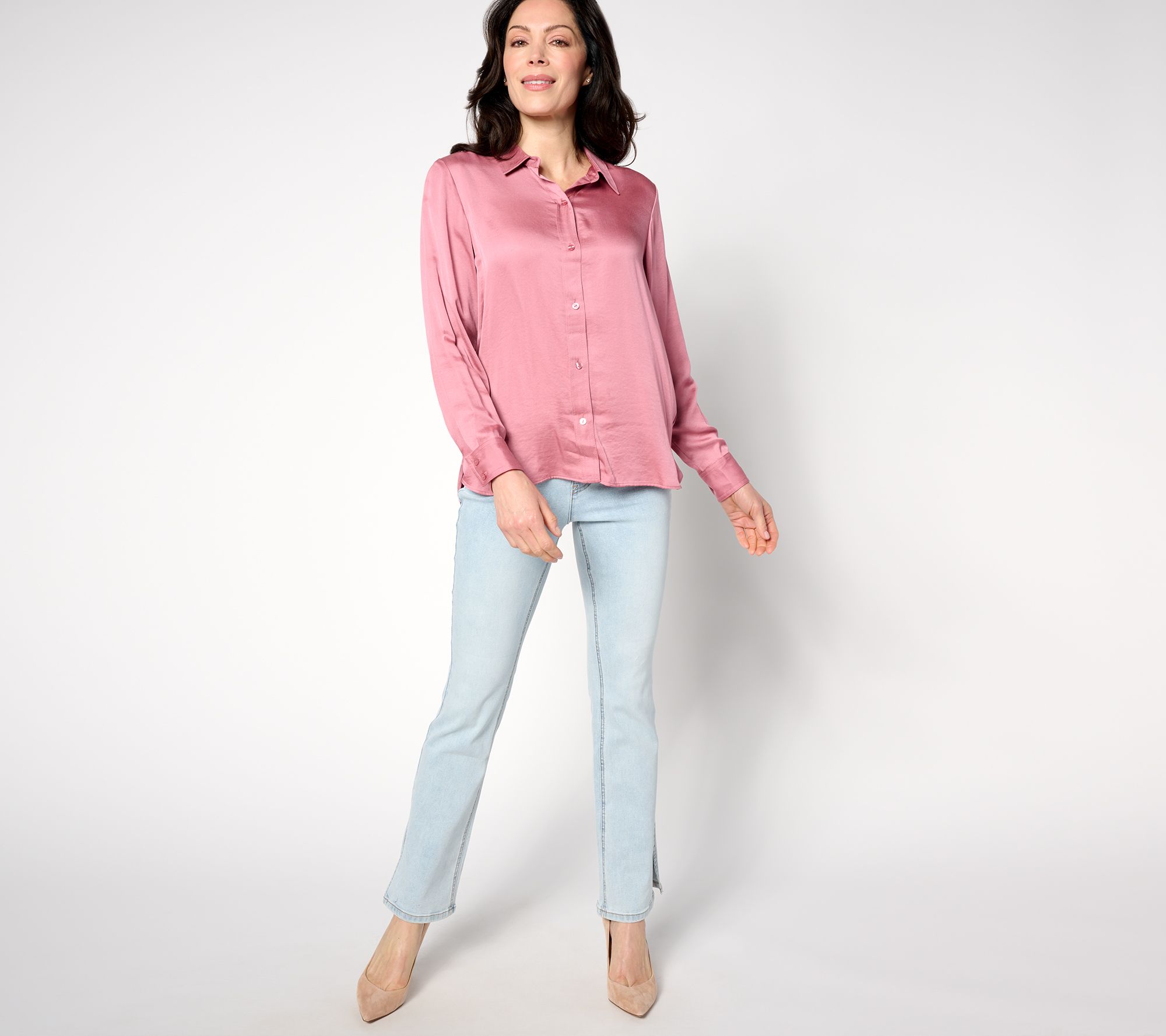 We love denim -- but zippers? Not so much. This pull-on-and-go pair meets us where we are, in Isaac's beloved True Denim fabrication with a heel-friendly boot-cut shape and classic five-pocket styling. From Isaac Mizrahi Live!TM.