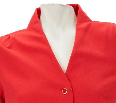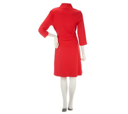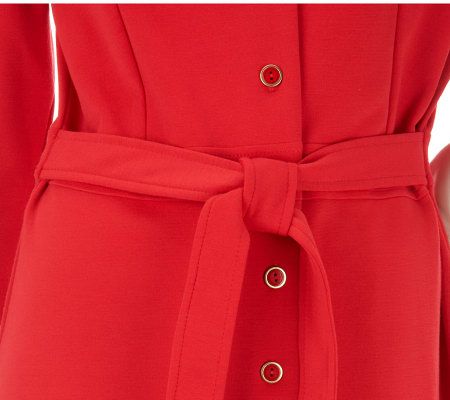 Power dressing. Sleek and simple, this button-front, ponte knit dress is an easy way to look put together - fast! Its stand collar and knee-length make it a natural for the office or social functions. From Isaac Mizrahi Live!(TM).