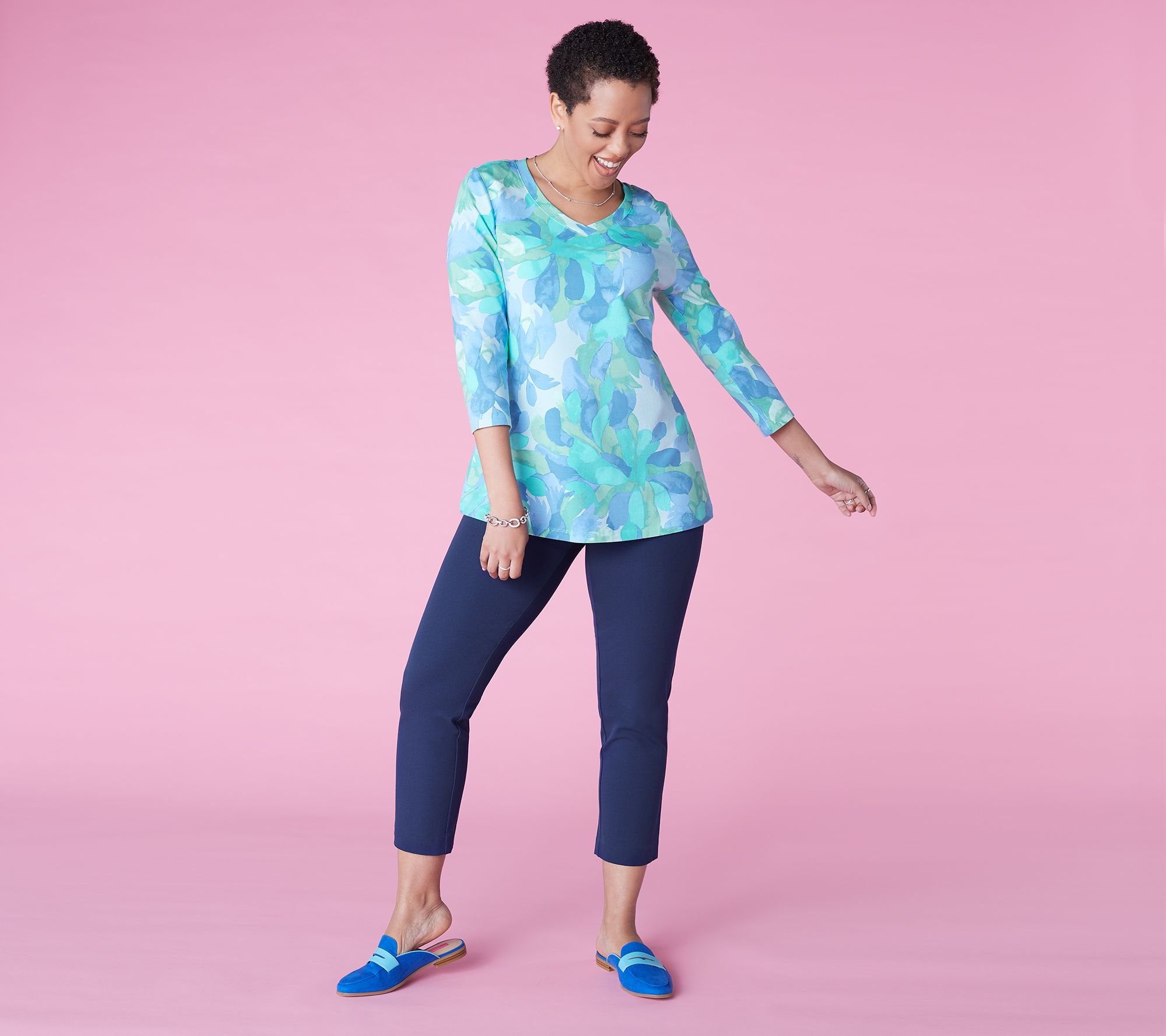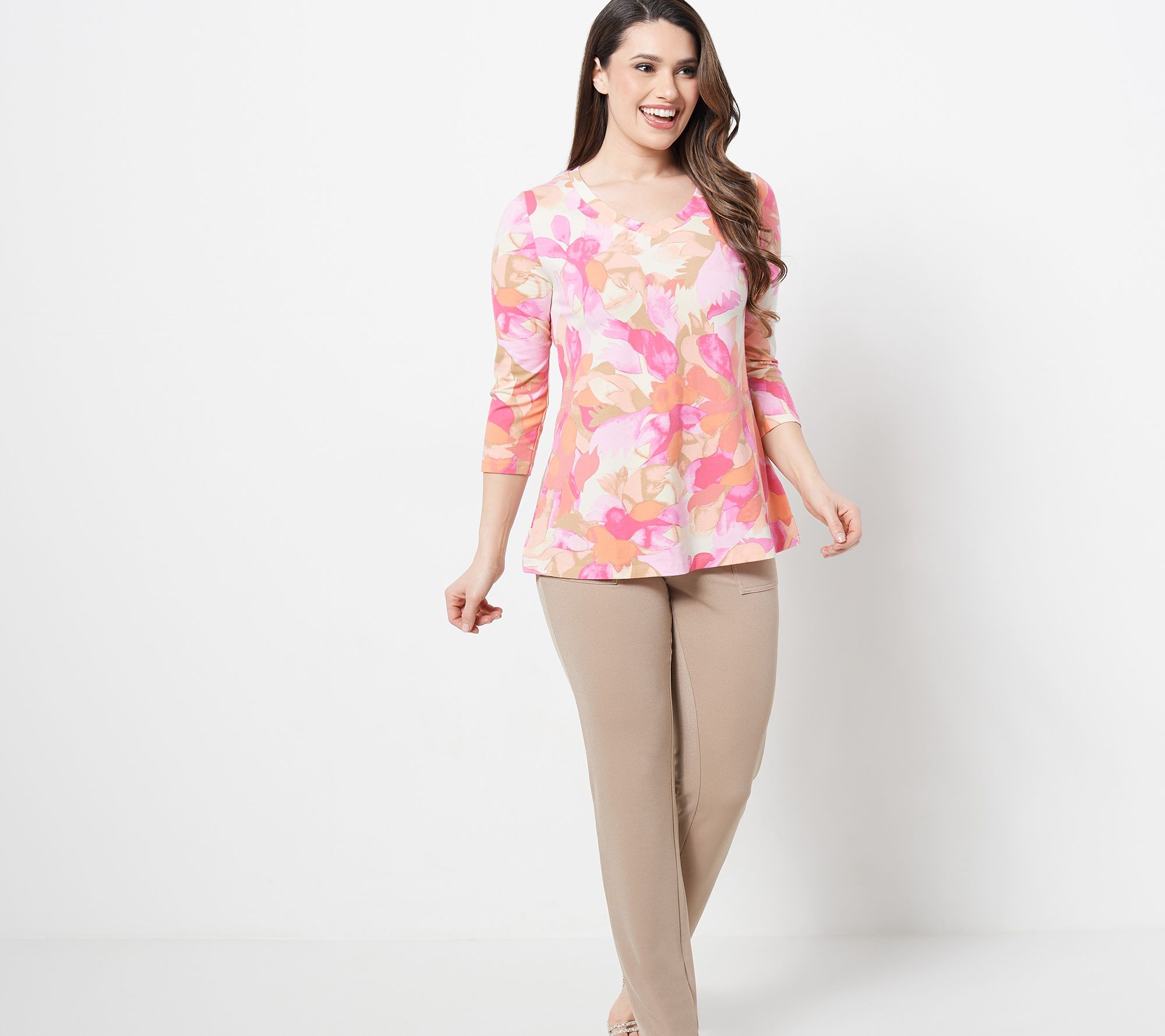 Life is much more enjoyable when you're cozy - and this swing top understands that. The rounded V-neckline, the 3/4-length sleeves, and the dazzling print come together to create a top that's oh-so-comfy and stylish as ever. From Isaac Mizrahi Live!TM.